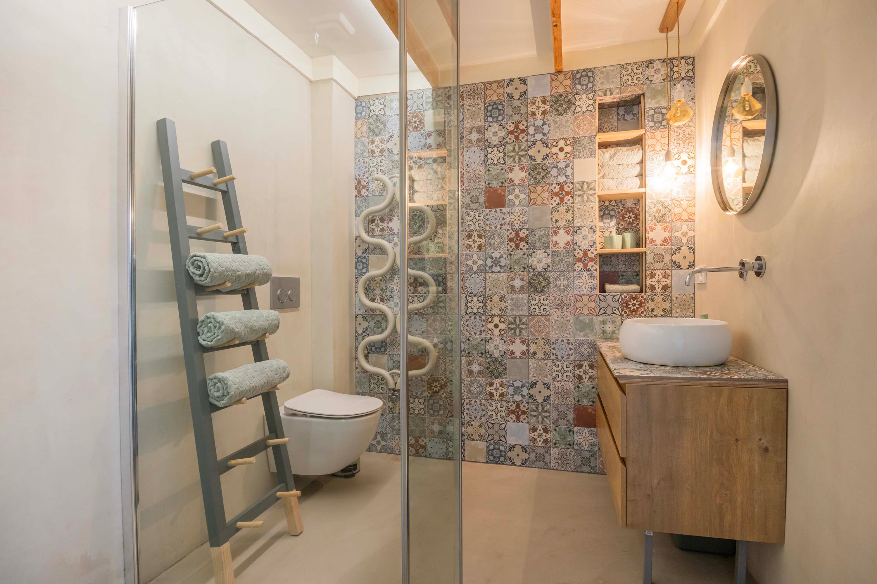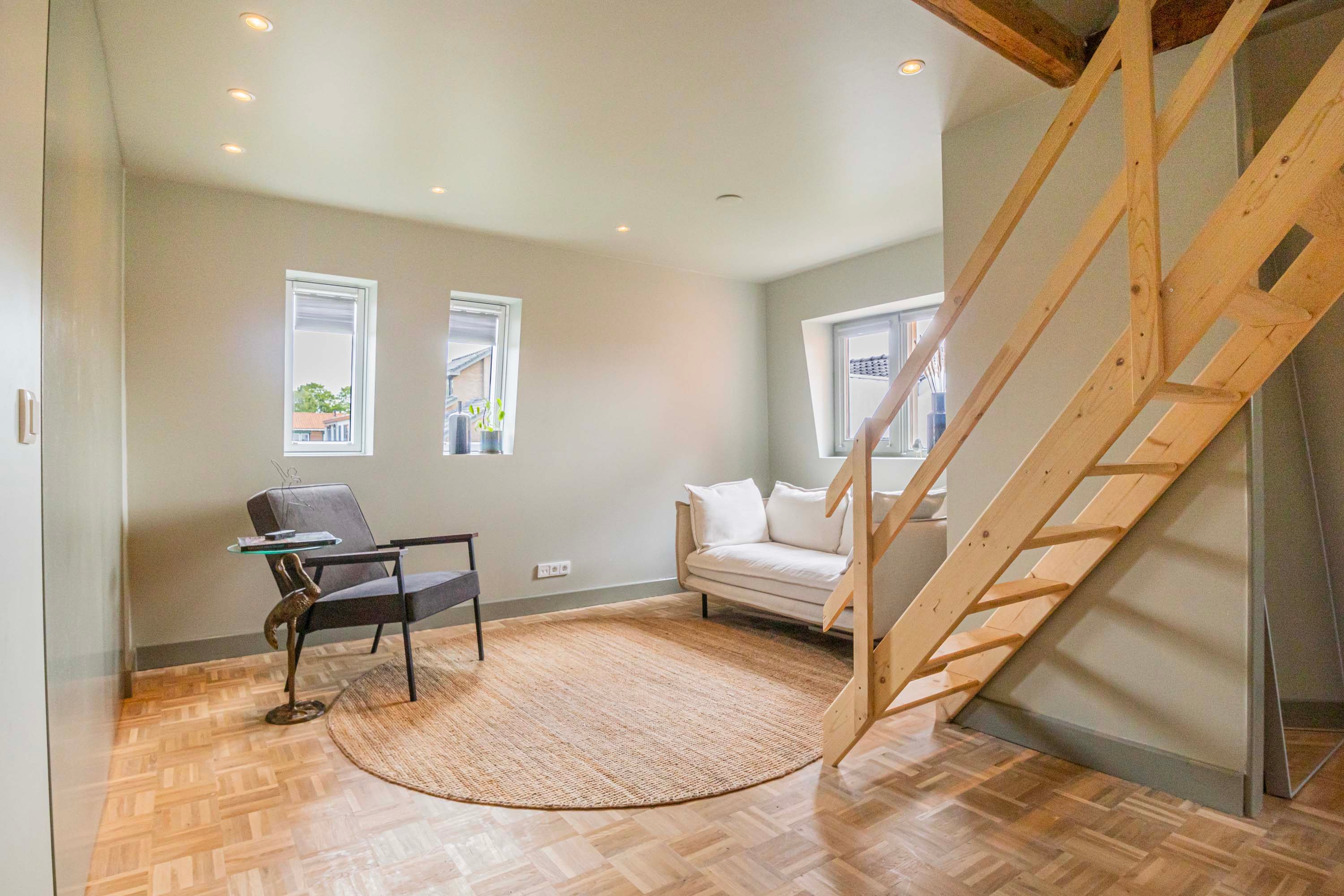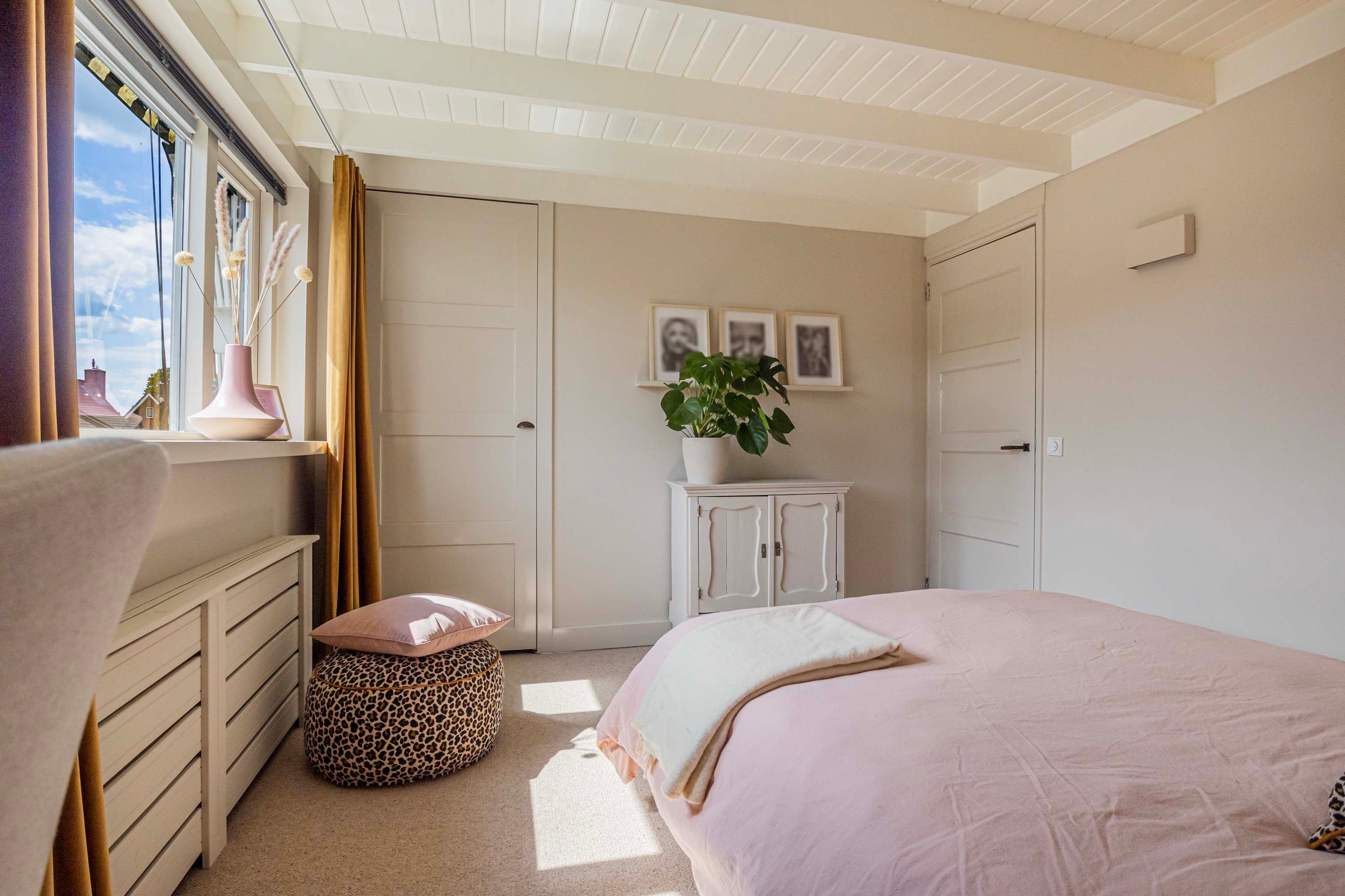 Als je naar boven loopt, kom je via de trap op de overloop, die toegang biedt tot de eerste badkamer en twee slaapkamers. De moderne badkamer is voorzien van een inloopdouche, een wandcloset en een wastafelmeubel. Aan de voorkant van het huis vind je een slaapkamer van 11 m² plus een ingebouwde kast. De "open" slaapkamer van 16 m² biedt volop mogelijkheden en grenst aan de vliering. Deze ruimte wordt nu gebruikt als tv- en relaxruimte.