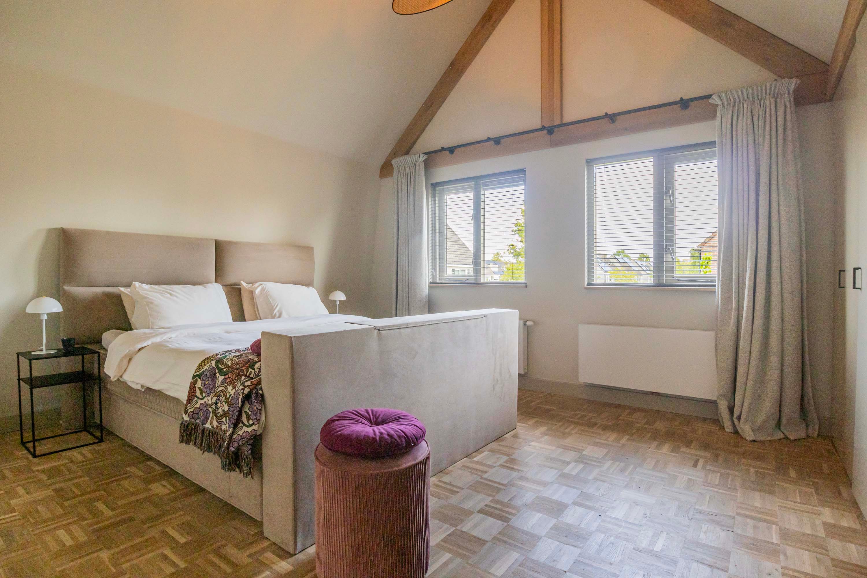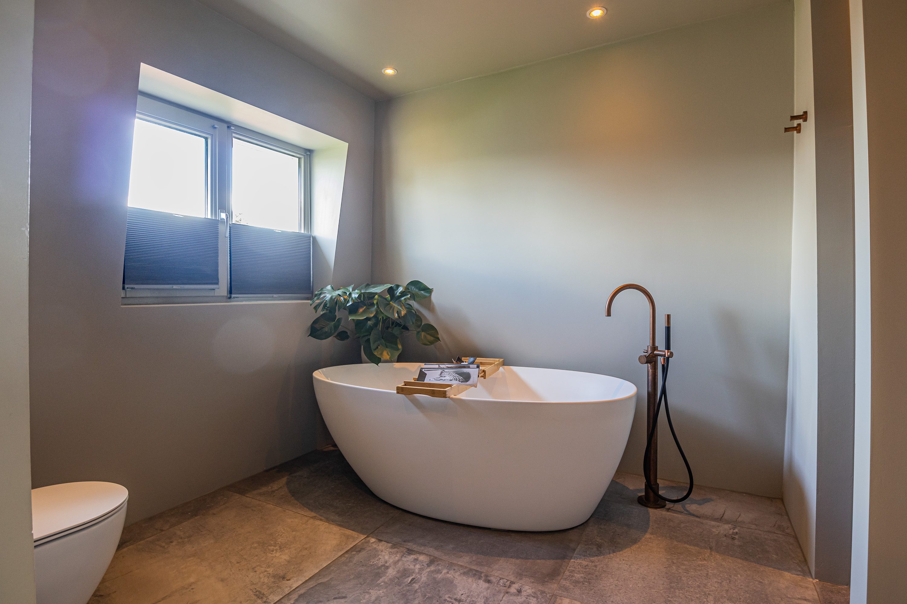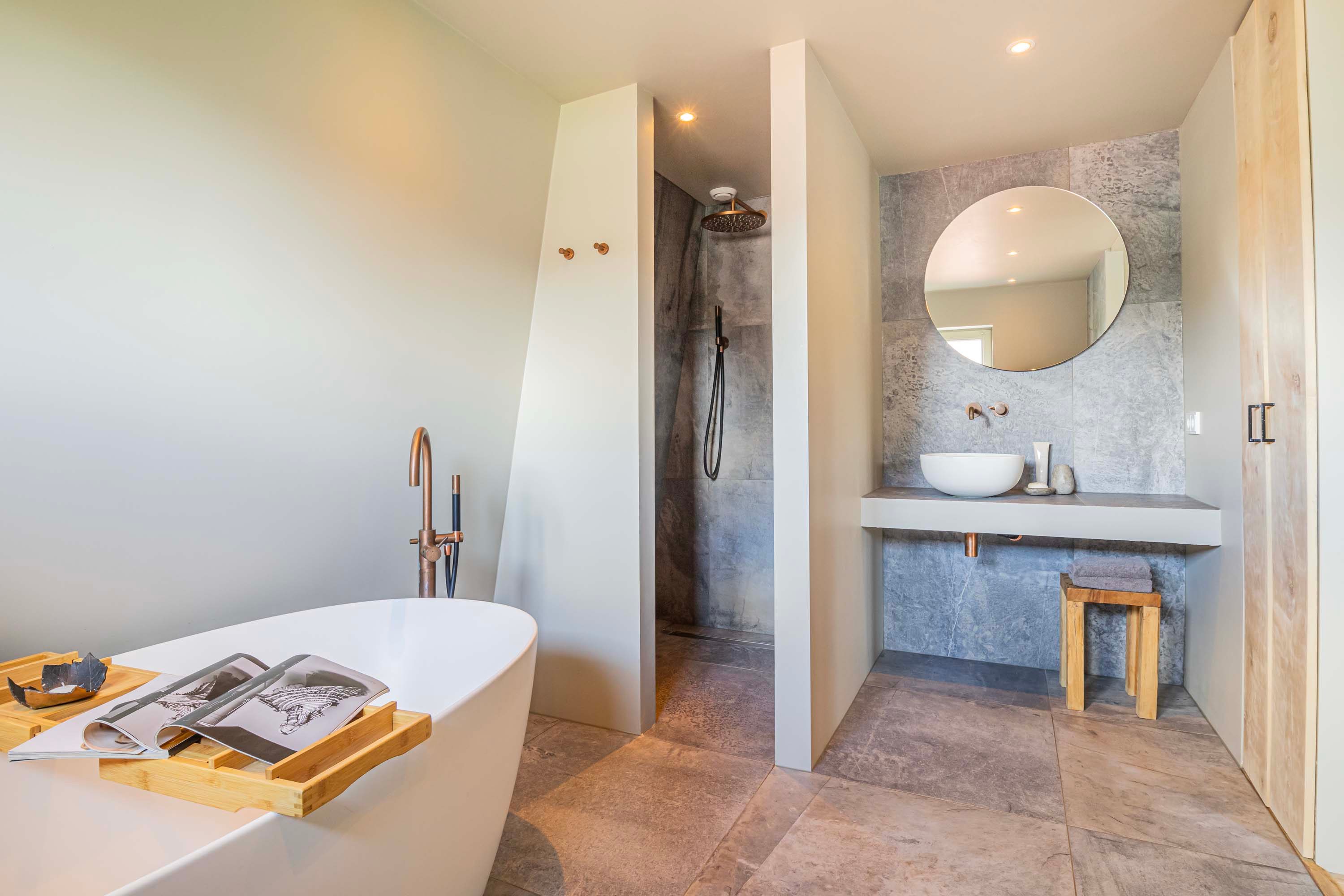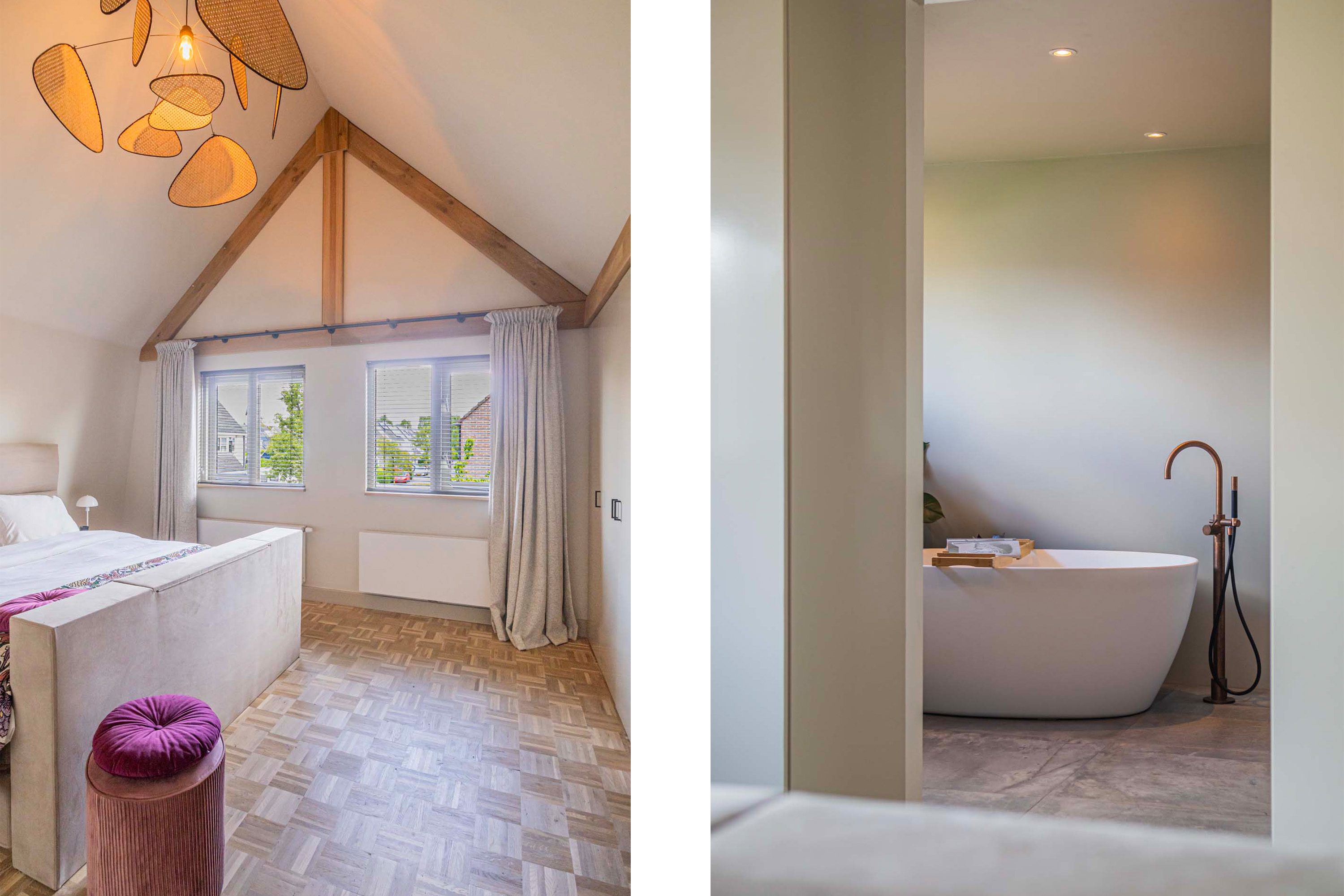 Vanuit de "open" slaapkamer, waar je een extra slaapkamer kunt realiseren, loop je door naar de grootste slaapkamer van 22 m², die aan de achterkant van de woning ligt. Deze slaapkamer heeft een open verbinding met de tweede badkamer. In deze badkamer vind je een losstaand bad, een inloopdouche, een toilet en een ruime wastafel. Daarnaast zijn in deze kamer diverse ingebouwde kasten geplaatst voor extra opbergruimte.