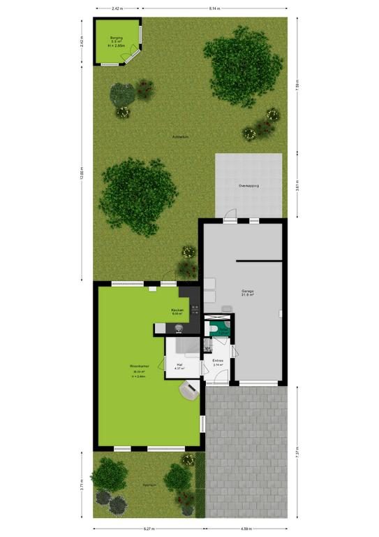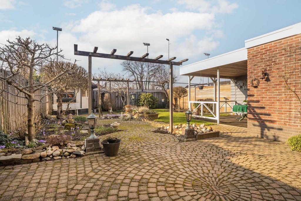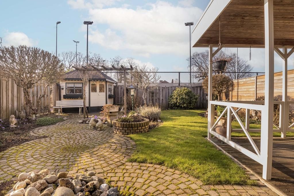 De tuin, gelegen op het noordwesten, strekt zich uit over een royale 12 meter diep en 10 meter breed. Deze buitenruimte biedt volop mogelijkheden voor ontspanning en recreatie. Een gezellige overkapping nodigt uit tot het genieten van lange zomeravonden, ongeacht het weer. Daarnaast is er een praktische berging aanwezig, ideaal voor het opbergen van tuingereedschap en andere benodigdheden.