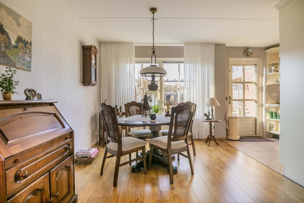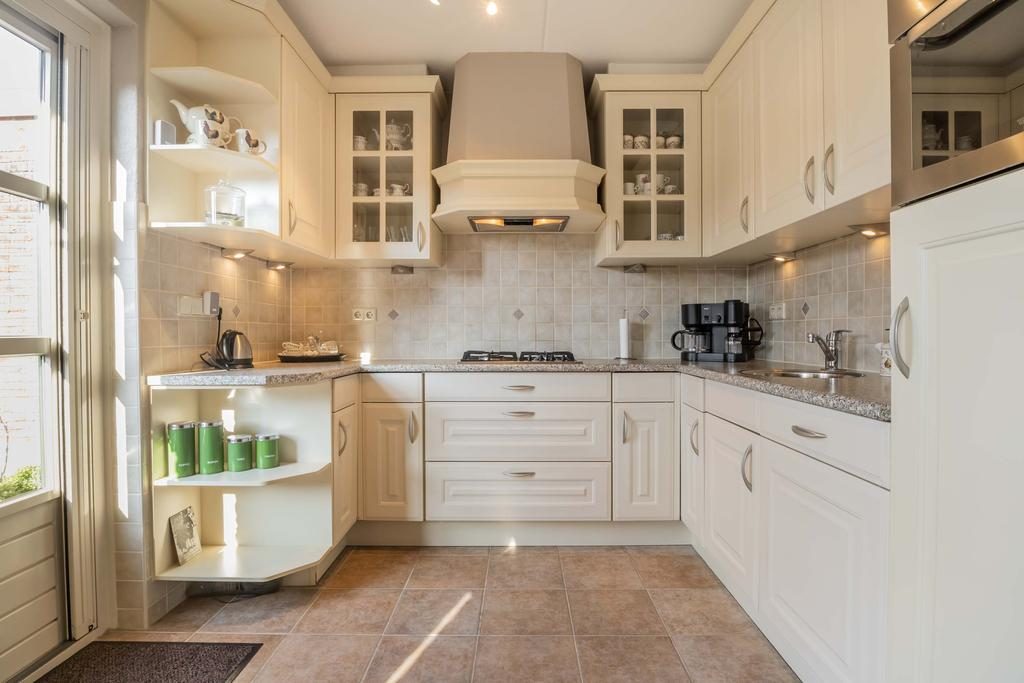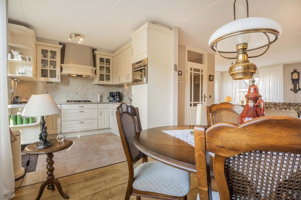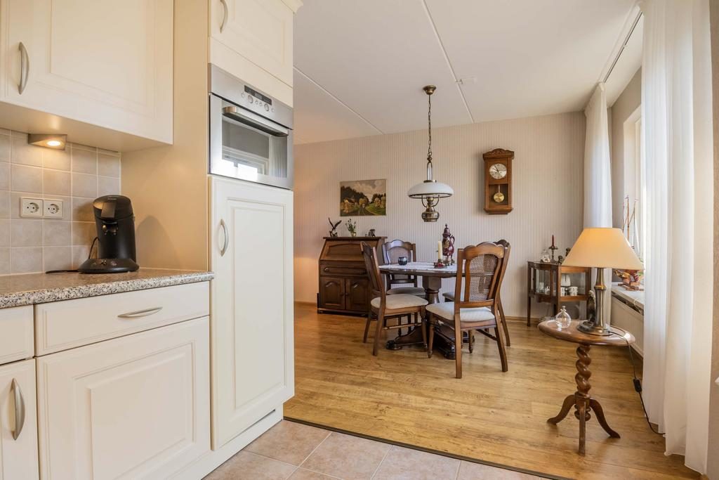 De eethoek biedt een ideale plek voor gezellige maaltijden en samenzijn. De lichte keuken, uitgevoerd in een praktische hoekopstelling, combineert ruimte en efficiëntie, waardoor koken een plezierige ervaring wordt.