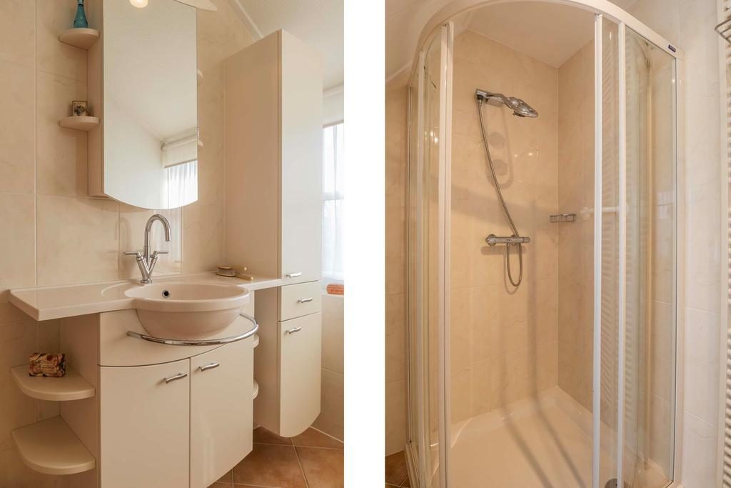 De overloop biedt toegang tot drie comfortabele slaapkamers. Aan de voorzijde van de woning bevindt zich een ruime slaapkamer van 13 m², naast een slaapkamer van 10 m². Aan de achterzijde vind je nog een slaapkamer van 10 m². De badkamer is uitgerust met een douche, een wastafelmeubel en een toilet, wat zorgt voor gemak en comfort.