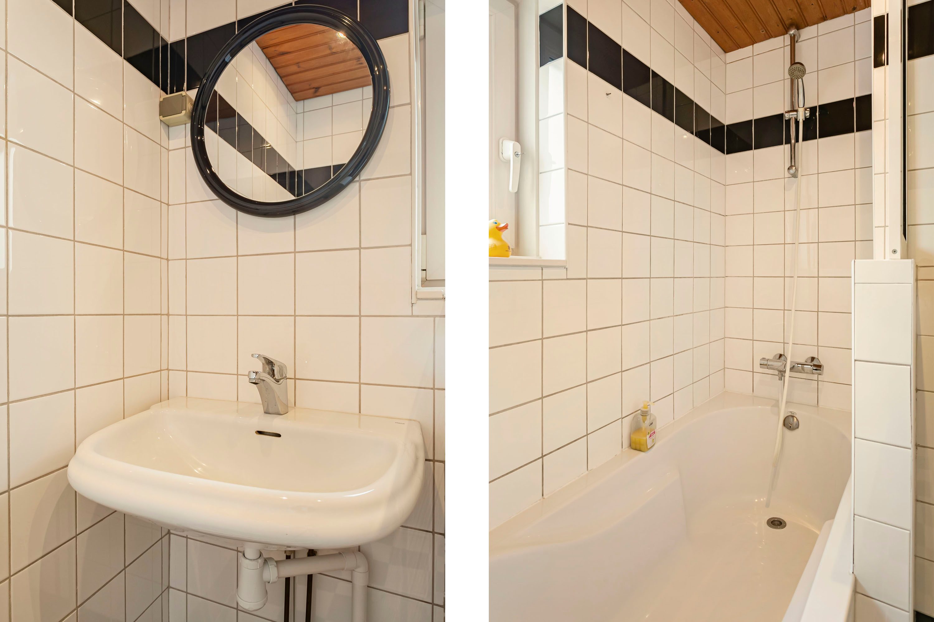De badkamer heeft een moderne uitstraling en is voorzien van een ligbad met douchefunctie en een wasmachineaansluiting.