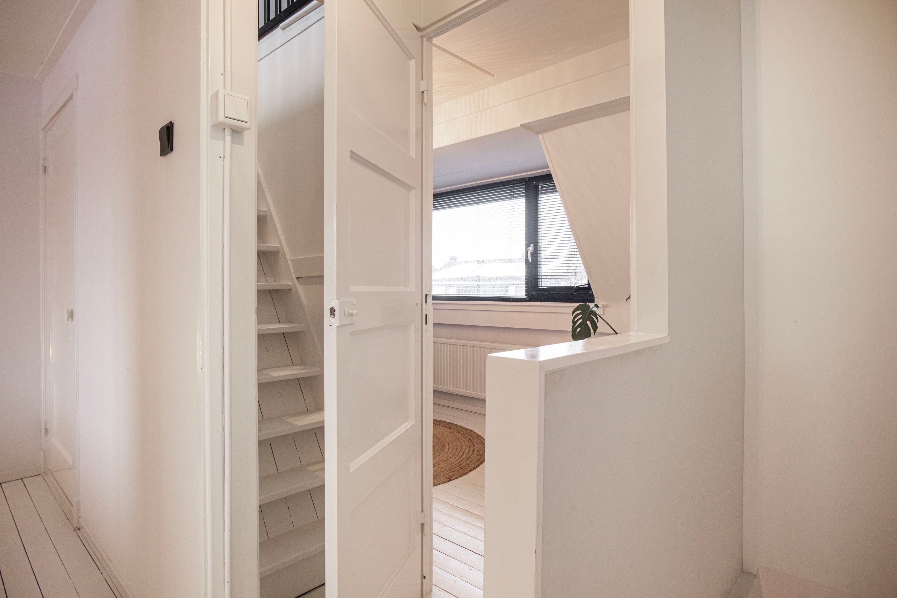 Via de overloop kom je op de zolderverdieping, een verrassend veelzijdige ruimte. Dankzij de dakkapel valt er veel natuurlijk licht naar binnen, wat zorgt voor een aangenaam en ruimtelijk gevoel. Bovendien is er een airconditioning aanwezig die zowel kan koelen als verwarmen, waardoor het hier het hele jaar door comfortabel is. De ingebouwde kastruimte biedt extra opberggemak en maakt deze verdieping ideaal voor diverse doeleinden: denk aan een vierde slaapkamer of een rustige thuiswerkplek.