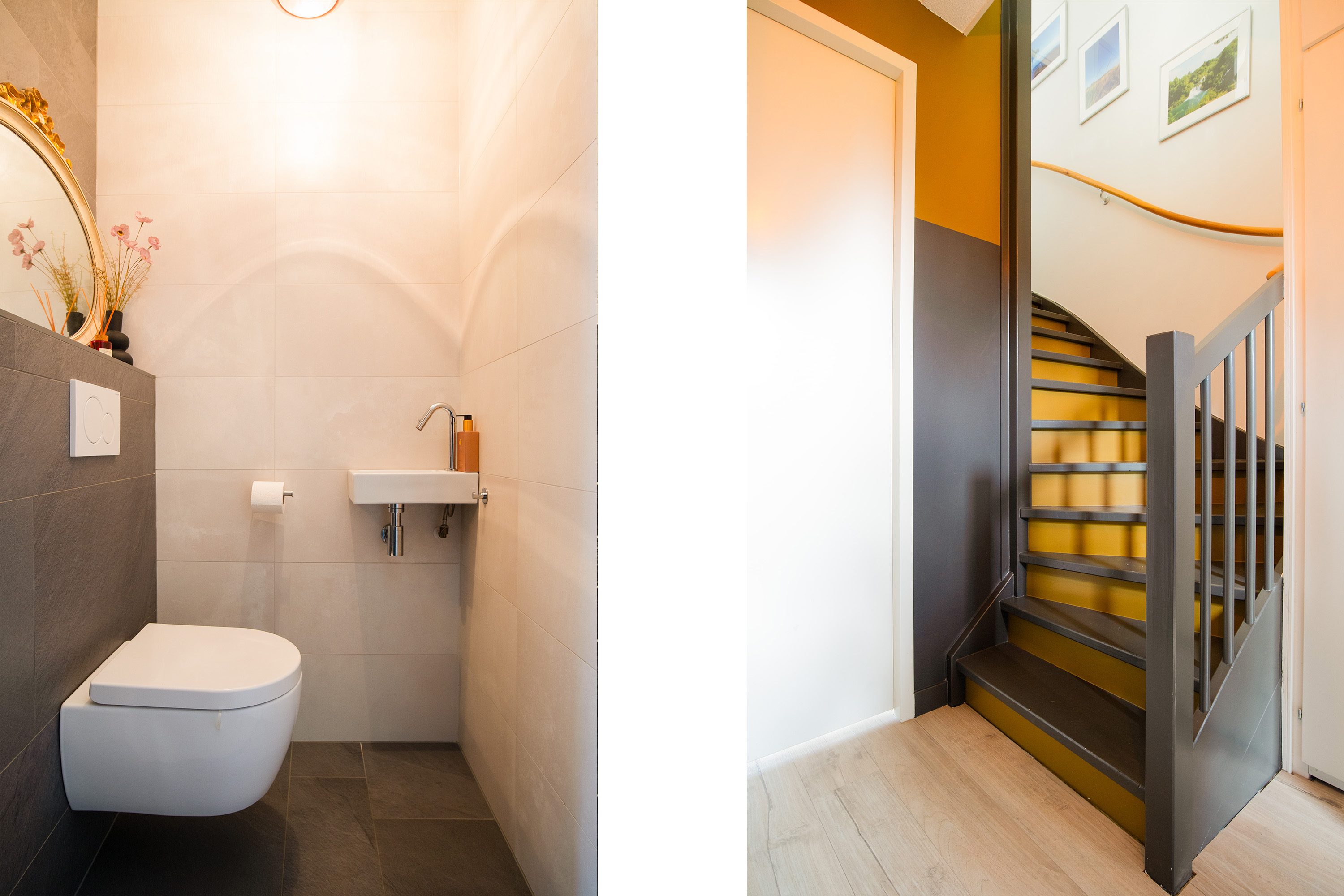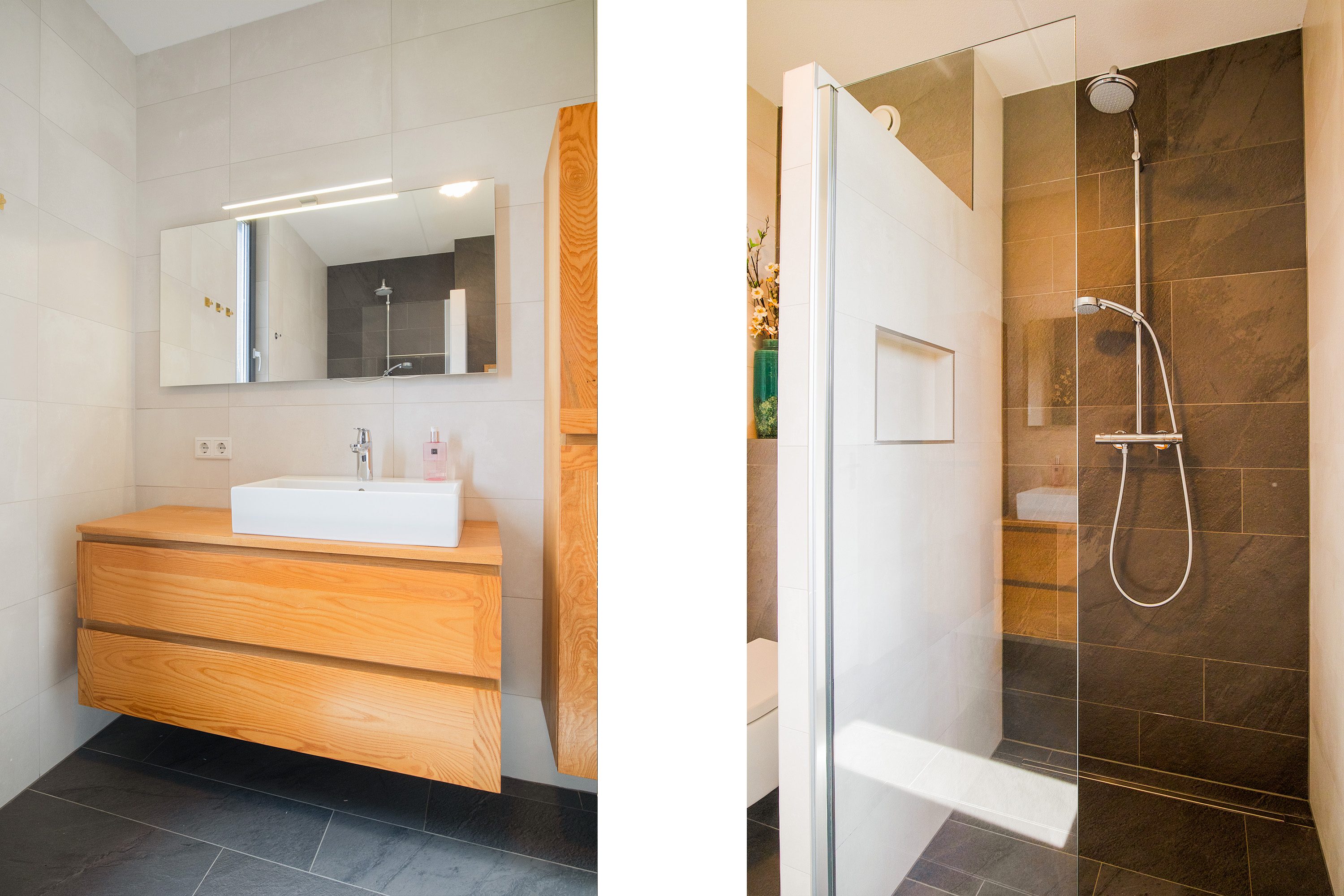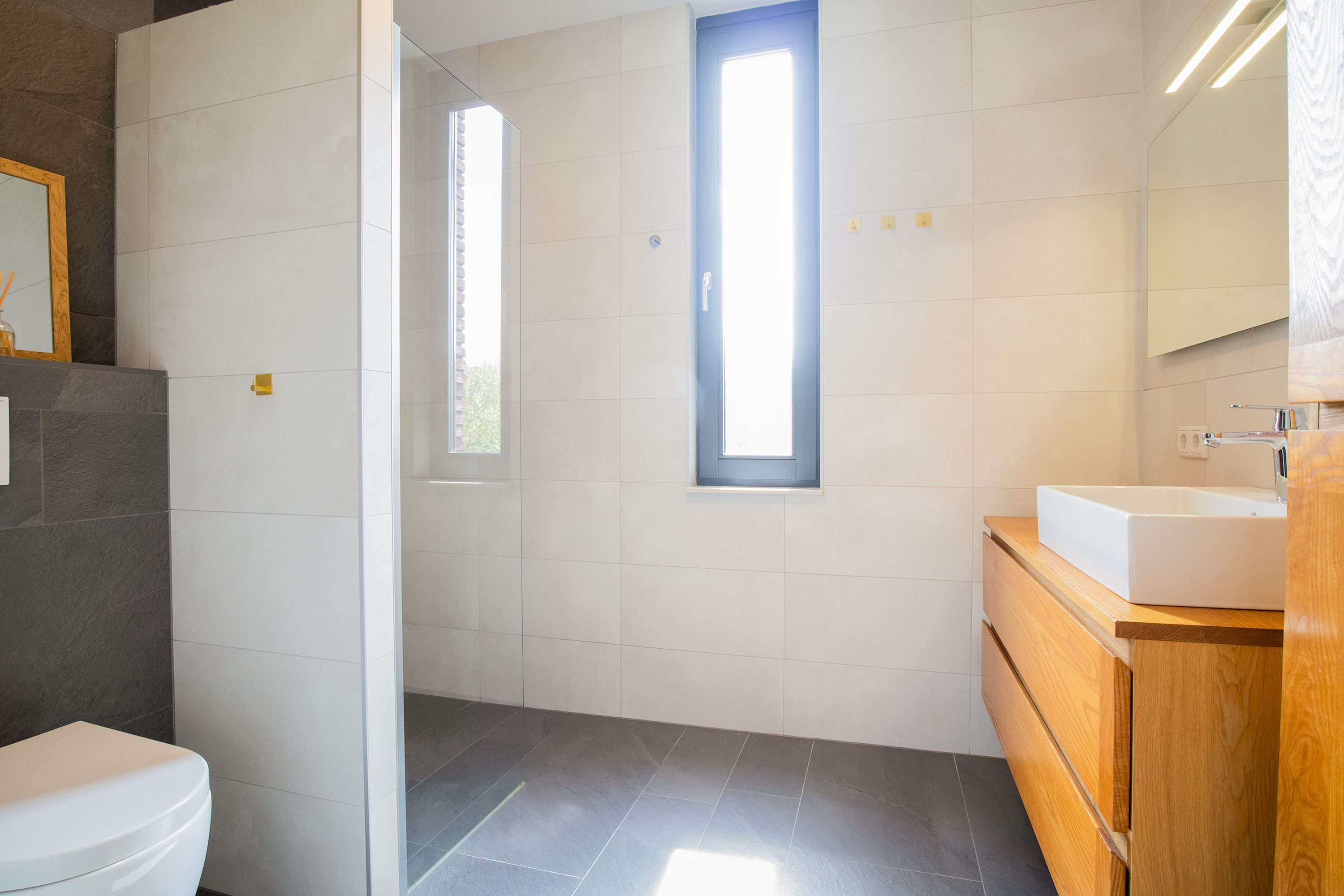 Via de vaste trap kom je bij de eerste verdieping. Deze verdieping beschikt over een overloop met toegang tot 3 slaapkamers en de badkamer. De ouderslaapkamer is net als de kleinste slaapkamer aan de achterzijde gelegen. De derde slaapkamer is gelegen op de voorzijde van de woning naast de badkamer. De badkamer is modern en compleet uitgevoerd. De ruimte beschikt over een ruime inloopdouche, 2e (zwevend) toilet en een wastafel in fraai bergmeubel. De badruimte is volledig betegeld met wit/antraciet tegelwerk. Voor licht en lucht in de badkamer is een raam aanwezig. De gehele 1e verdieping (m.u.v. de badkamer) is wederom voorzien van een laminaatvloer.