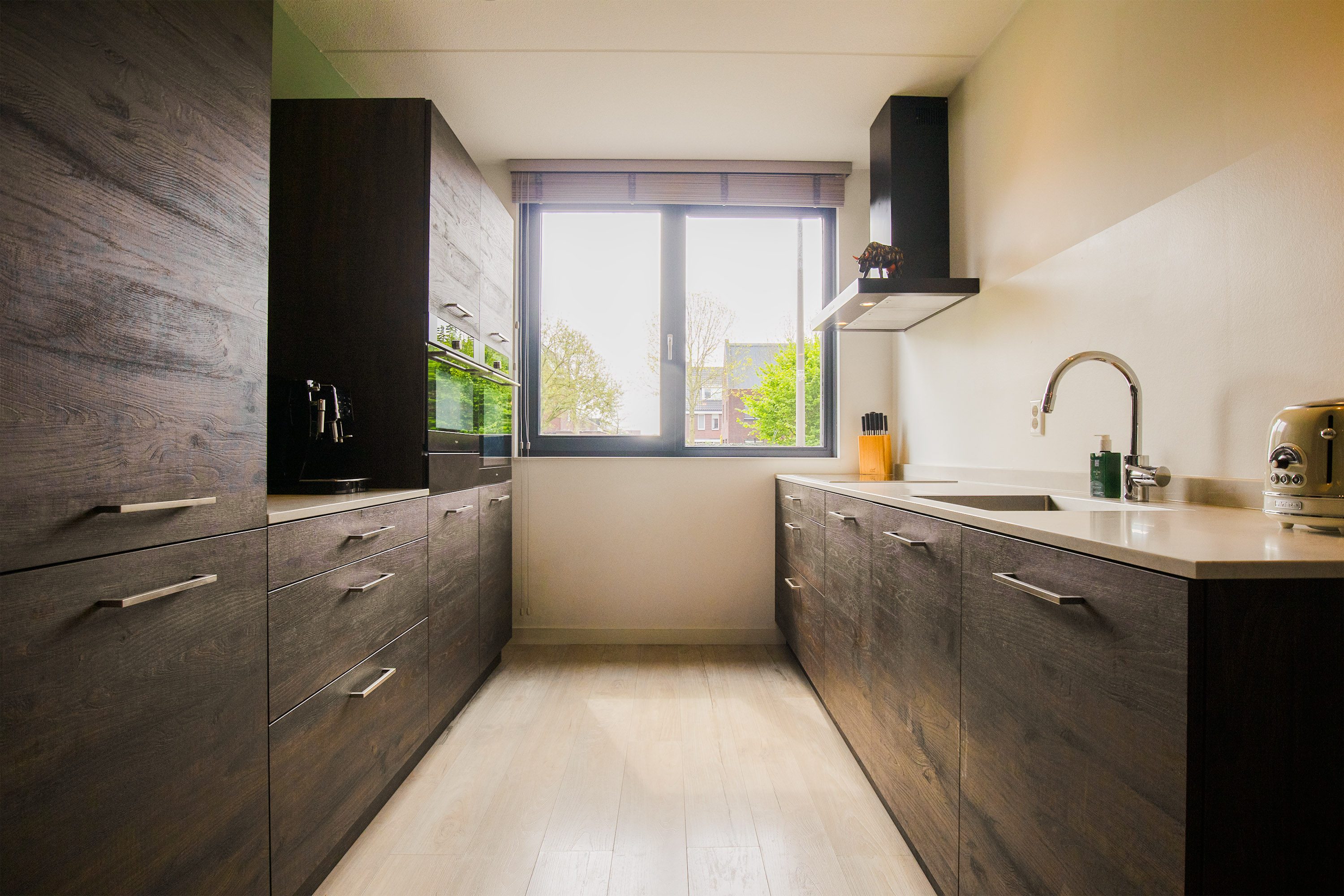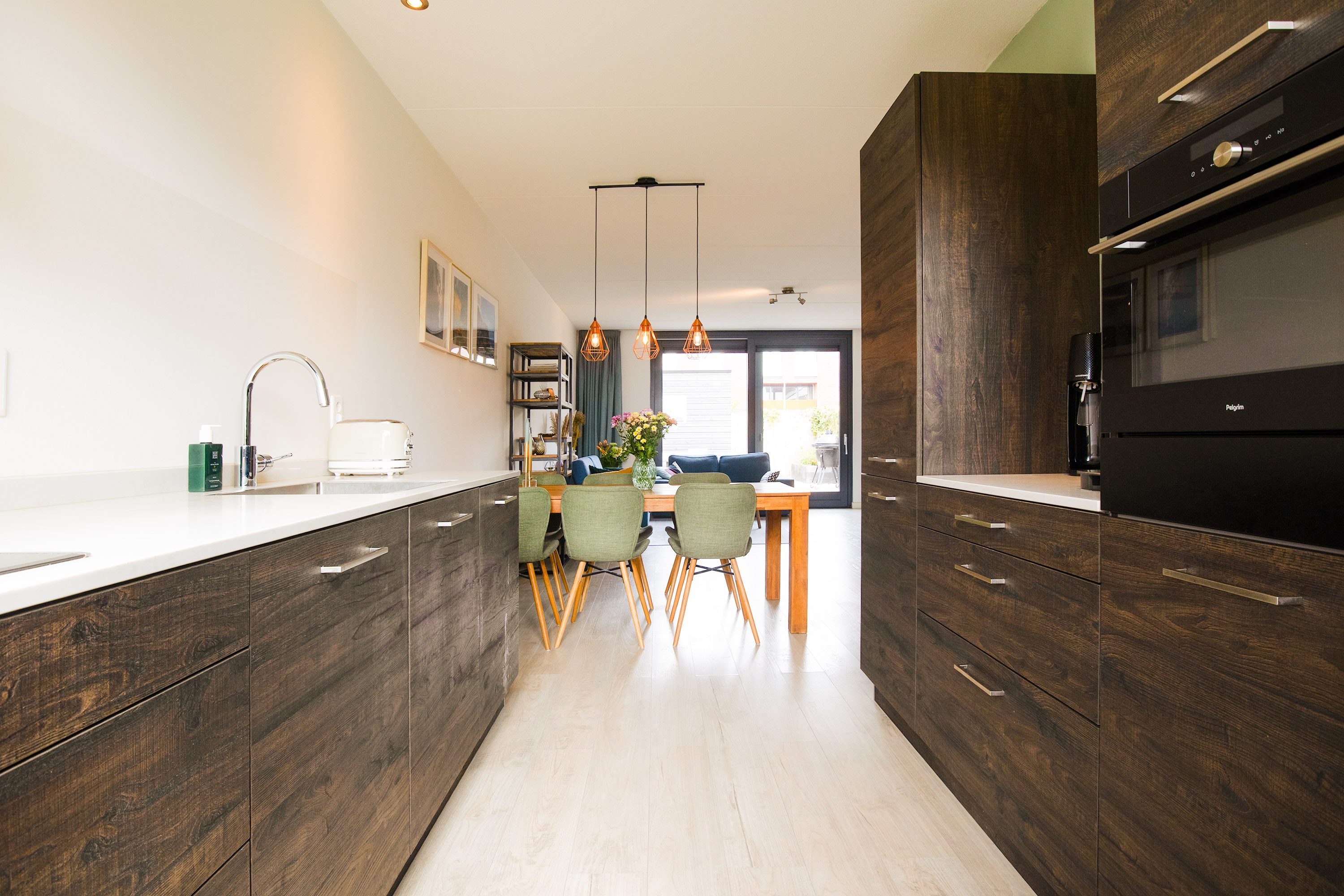 Doormiddel van de entree kom je bij de ruime hal met uitgebreide meterkast, luxe toiletruimte voorzien van modern tegelwerk en wandcloset met fonteintje, trapopgang naar de 1e etage en deur naar de woonkamer. De uitgebouwde tuingerichte woonkamer heeft een grote schuifpui naar de achtertuin, kortom veel daglicht in huis en een mooi uitzicht op de tuin. Op de voorzijde van het huis is de keuken gesitueerd. De keuken is voorzien van een luxe inbouwkeuken met twee keukenblokken tegenover elkaar. De keuken heeft veel kastruimte en een mooie donkerkleurige houtfineer afwerking met stoere RVS handgrepen. Aanwezig is een vaatwasmachine, inductie kookplaat, oven, combimagnetron, afzuigkap en koel- vriescombinatie. De gehele begane grond vloer is afgewerkt met een moderne laminaatvloer.