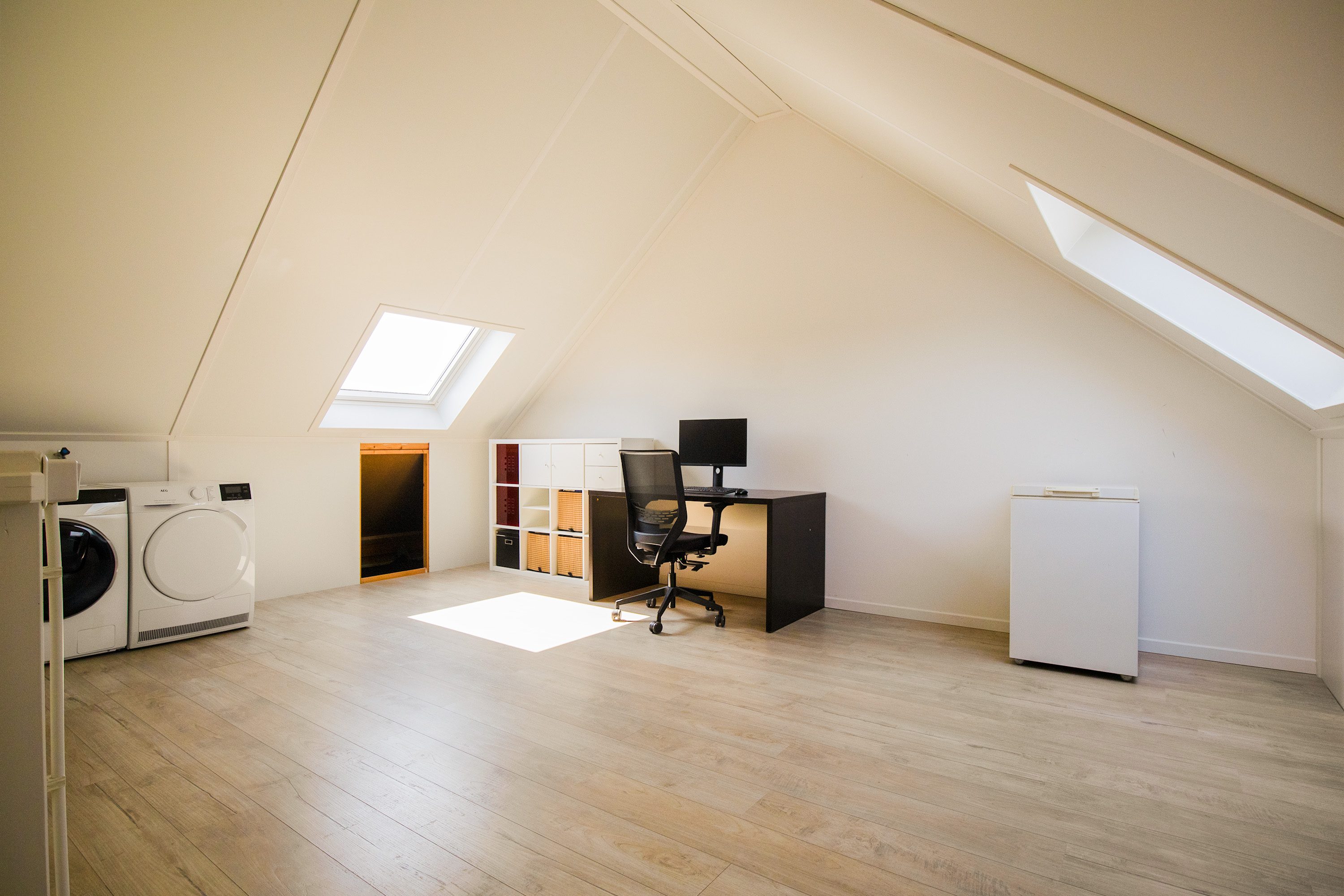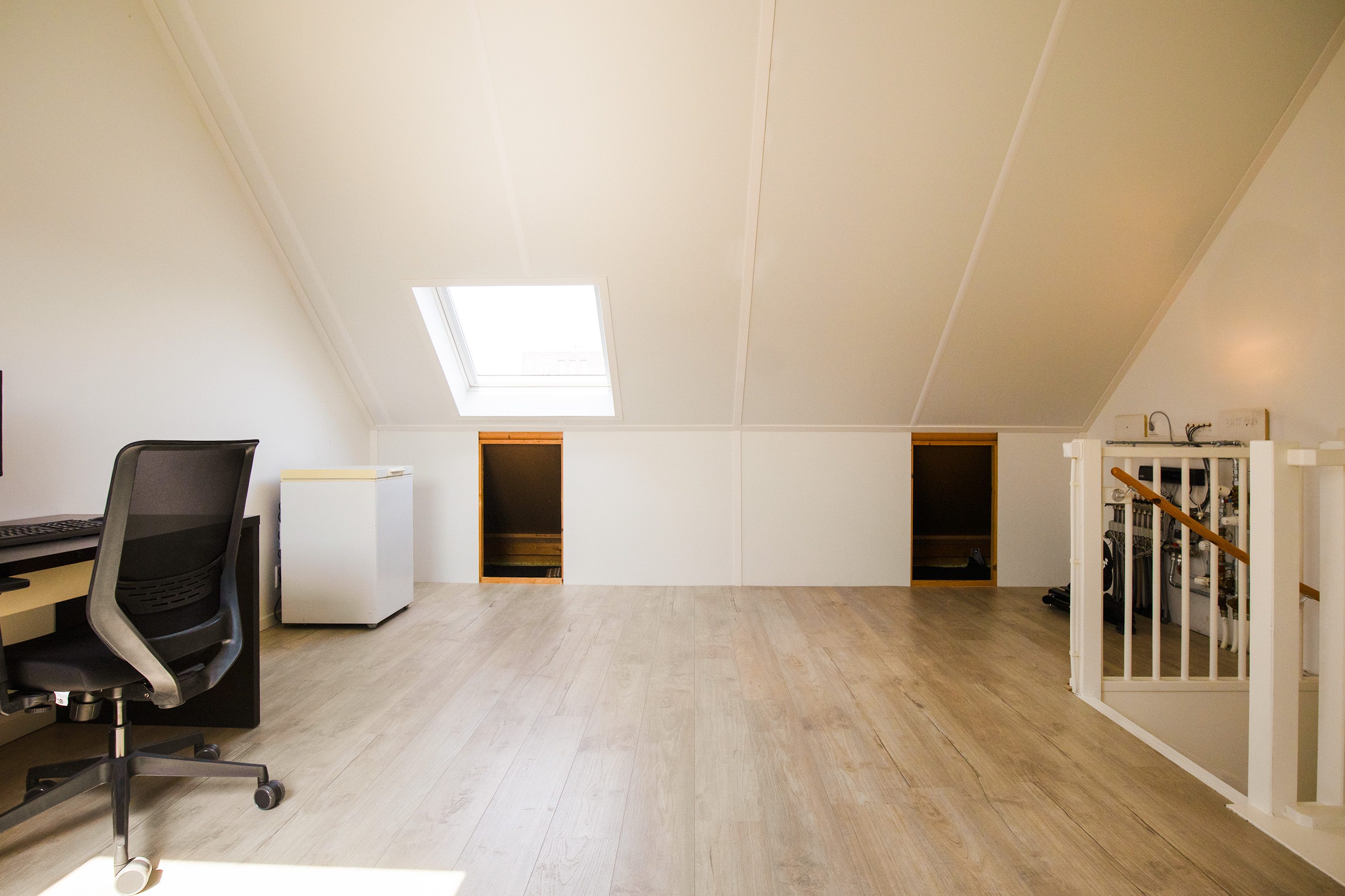 De etage is bereikbaar middels een vaste trap. Grote en keurig afgewerkte nog, volledig open, 2e verdieping met uitstekende mogelijkheid tot het creëren van 1 of 2 extra slaapkamers. Op deze etage is de wasmachine aansluiting aanwezig. Ook is er een groot dakraam aanwezig aan beide zijdes. De verdieping is voorzien van laminaatvloer.