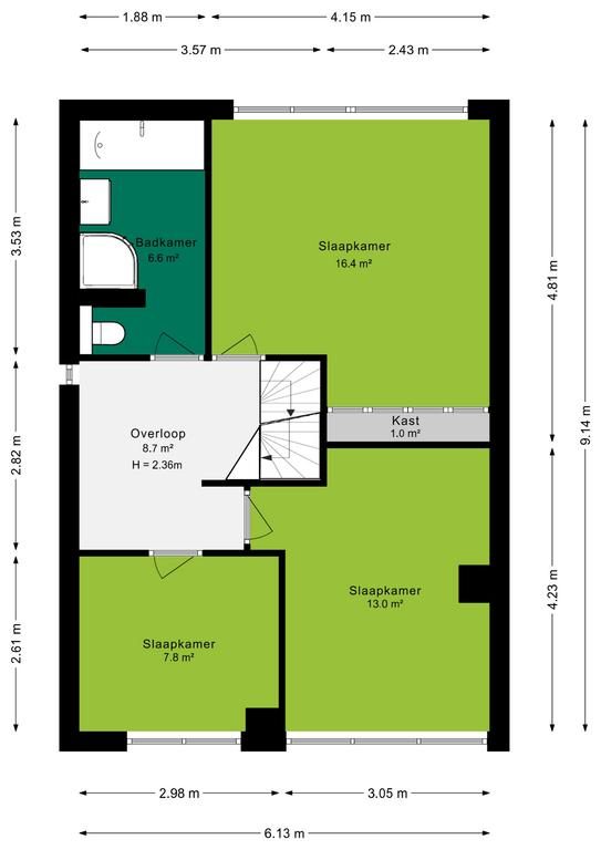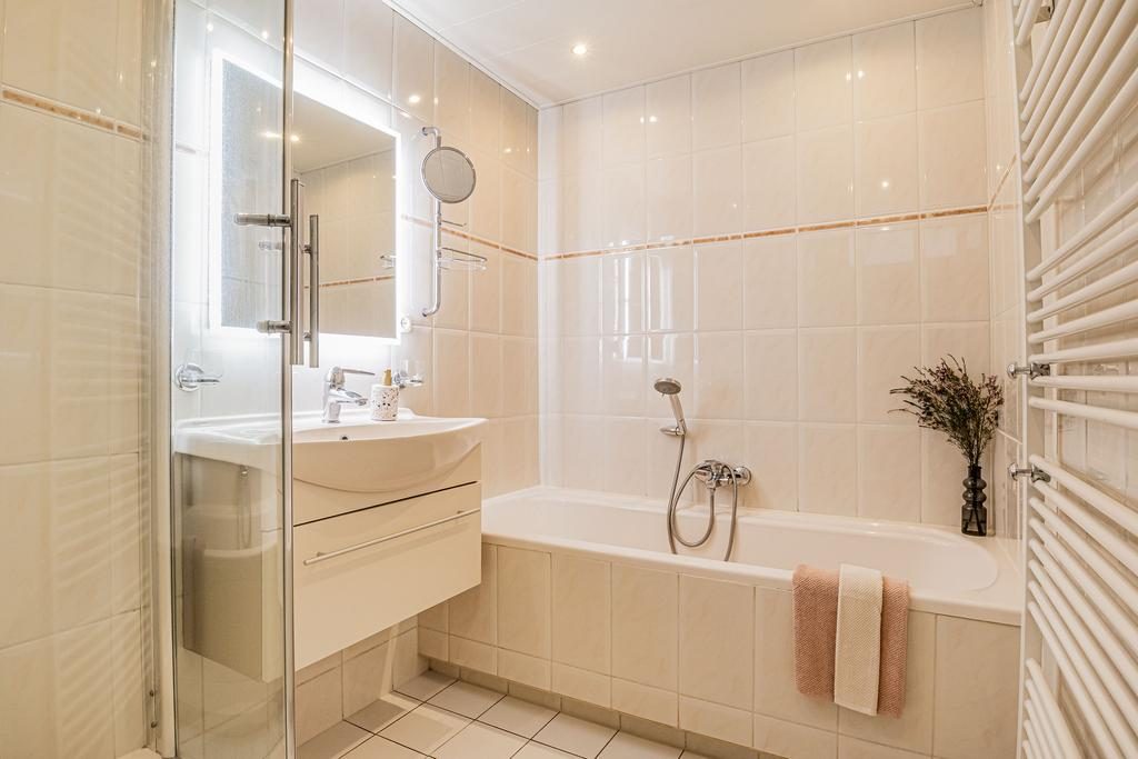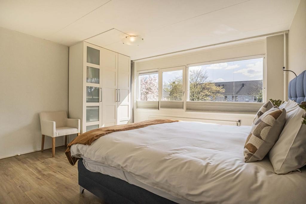 Via de overloop is er toegang naar 3 volwaardige slaapkamers en de badkamer. De slaapkamers hebben een afmeting van circa 16m², 13m² en 8m². De slaapkamers zijn voorzien van een doorlopende laminaatvloer, neutrale wanden en voldoende lichtinval. De badkamer is volledig betegeld in een lichte kleurstelling en beschikt over een ligbad, douche, toilet, handdoek radiator, wastafelmeubel en spiegel met verlichting.