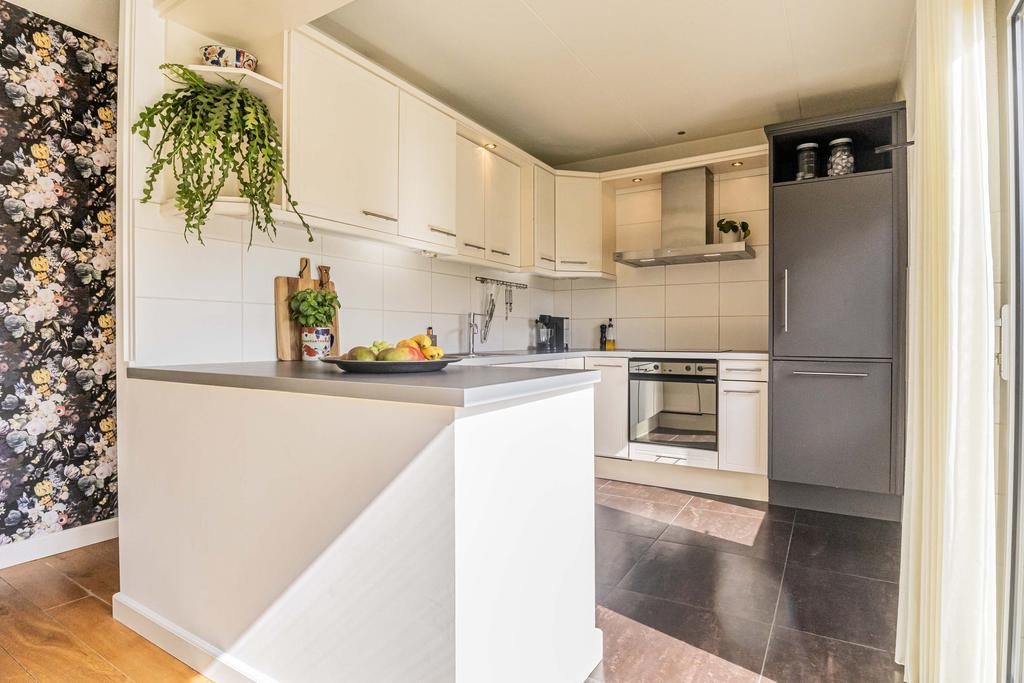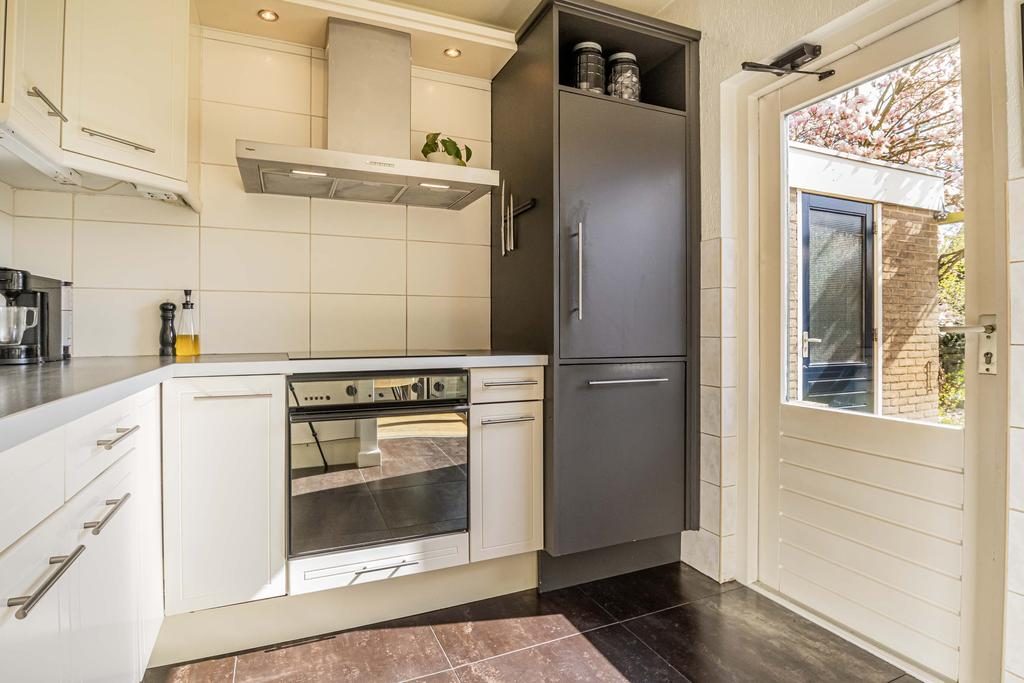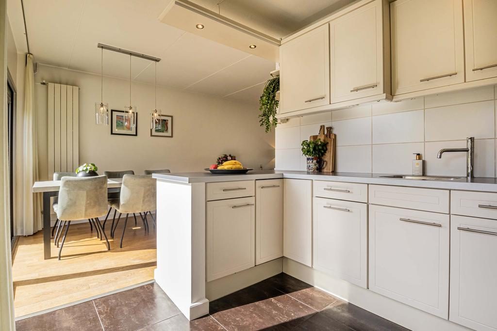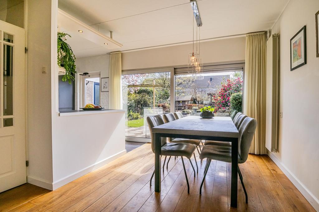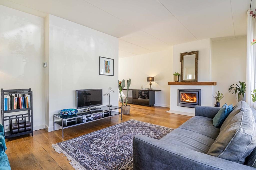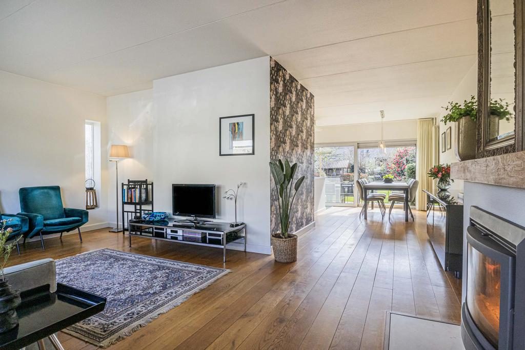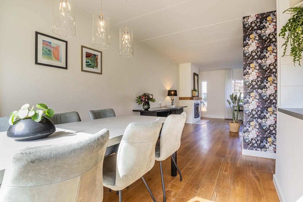 De woonkamer is gelegen aan de voorzijde van de woning en beschikt over een houten vloer en een inbouwhaard (hoog rendement en met 2 ventilatoren). Aan de achterzijde tref je het eetgedeelte, waar een gezellige verbinding tussen de eetkamer en de keuken ontstaat. De open keuken heeft een hoekkeuken in lichte kleurstelling en is voorzien van een vaatwasser, kookplaat, afzuigkap, combi-oven en koelkast. Door de grote raampartijen is de woning aan beiden zijde voorzien van veel lichtinval en aan de achterzijde beschik je over een fantastisch uitzicht in de tuin.