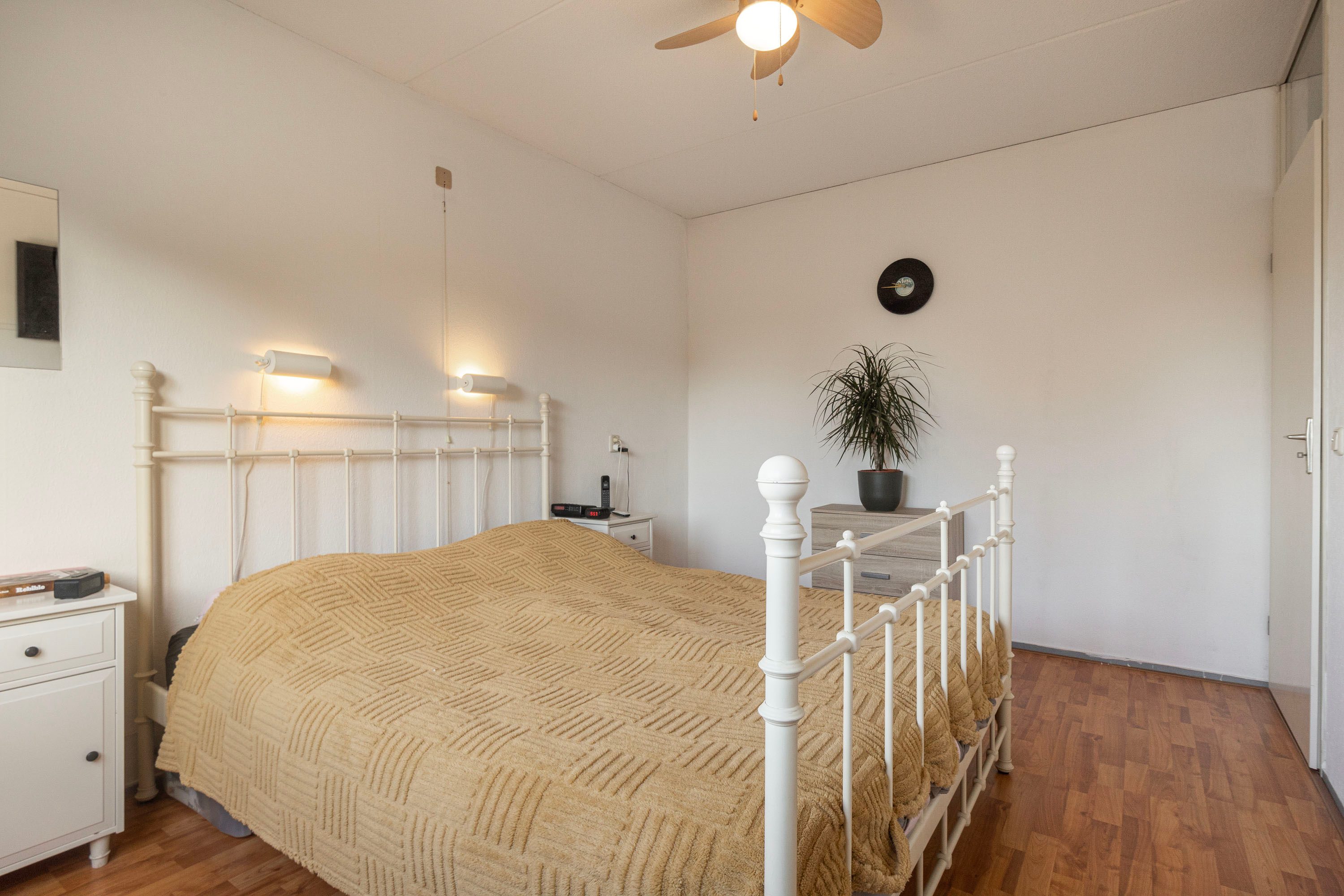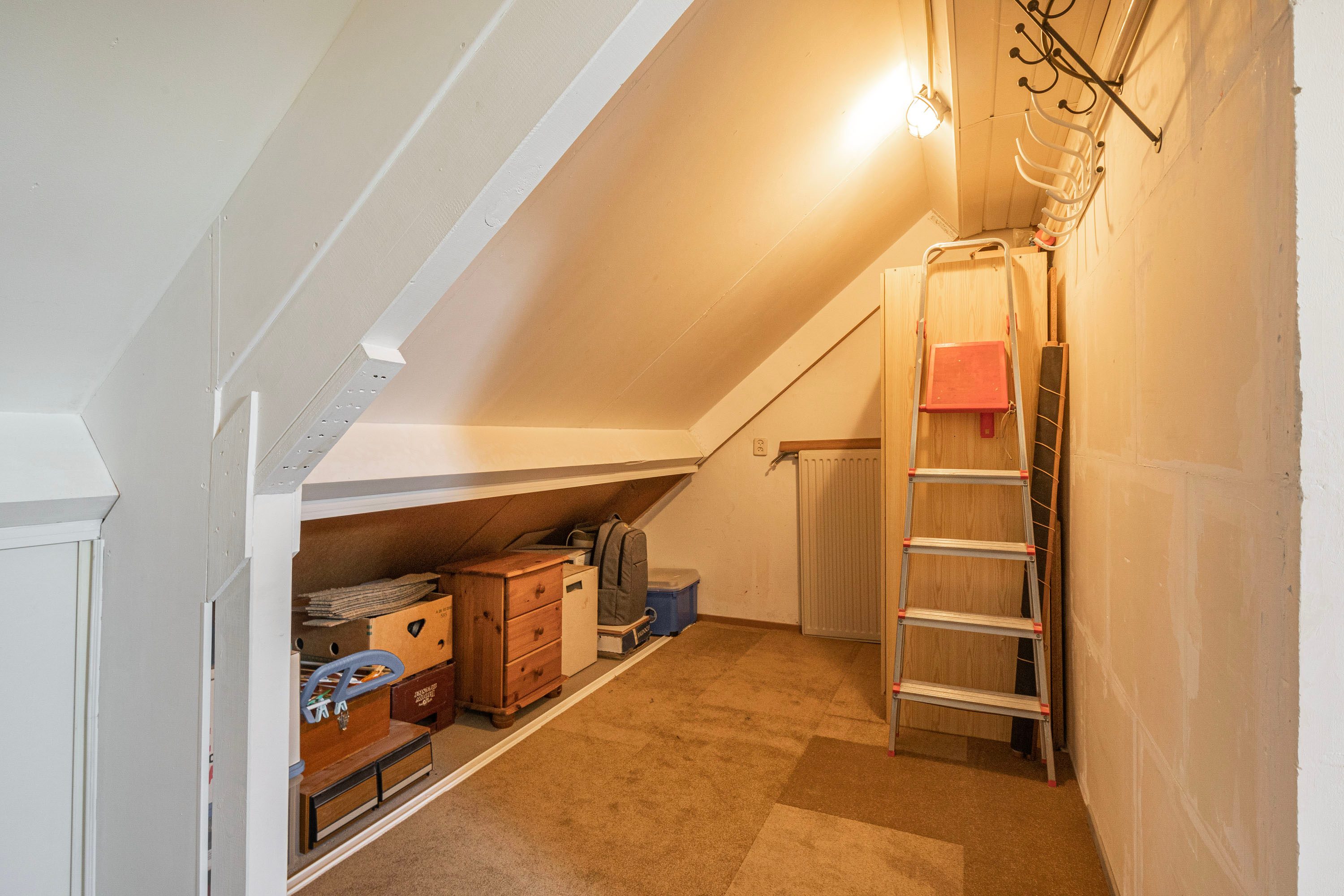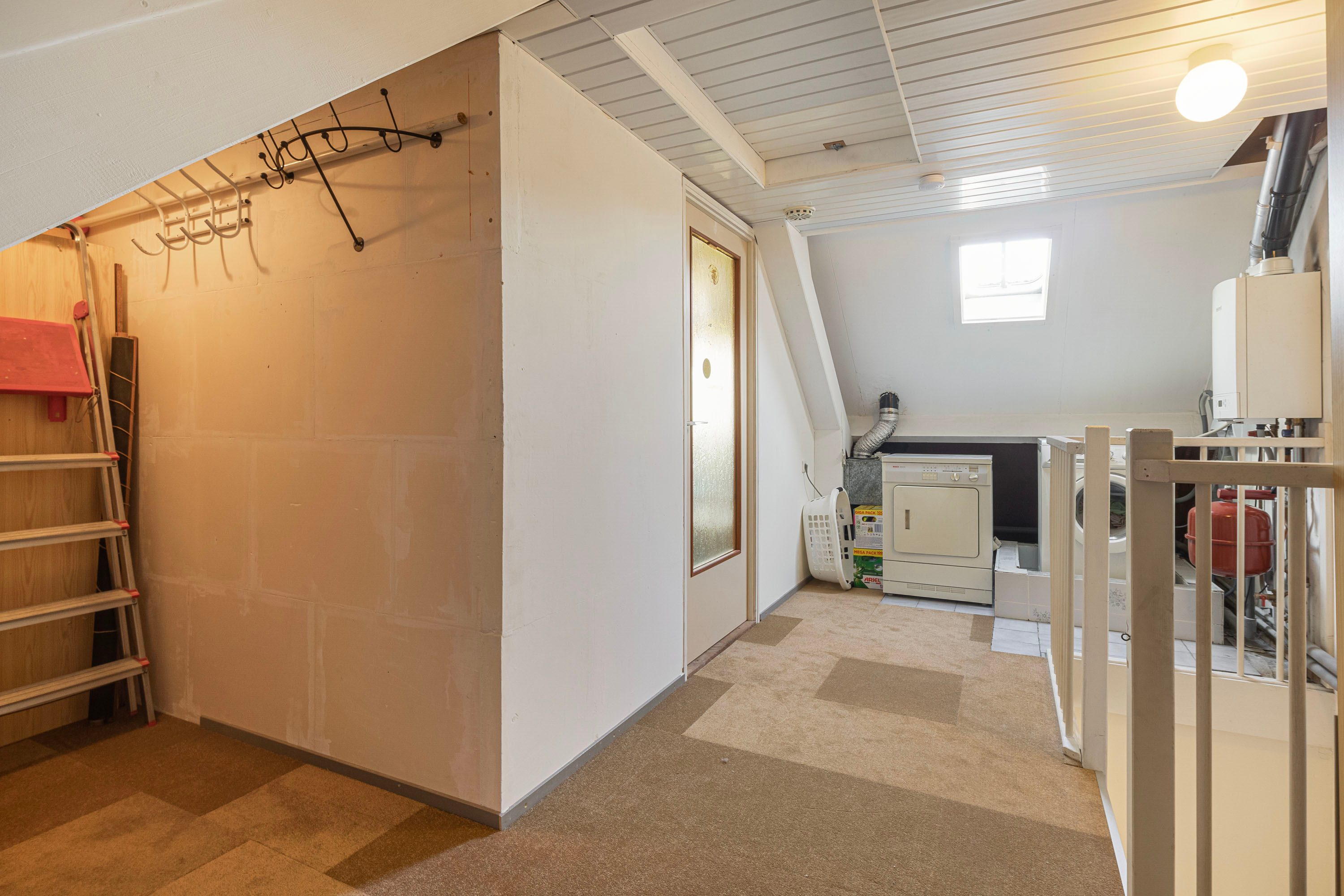 Met de vaste trap bereik je de tweede verdieping, waar je op de overloop voldoende bergruimte aantreft, naast de aansluitingen voor zowel de wasmachine als de droger. Ook vind je hier de vierde slaapkamer van 10,6 m², die dankzij de dakkapellen verzekerd is van veel natuurlijk licht. Deze veelzijdige kamer kan tevens dienstdoen als sport- of werkkamer.