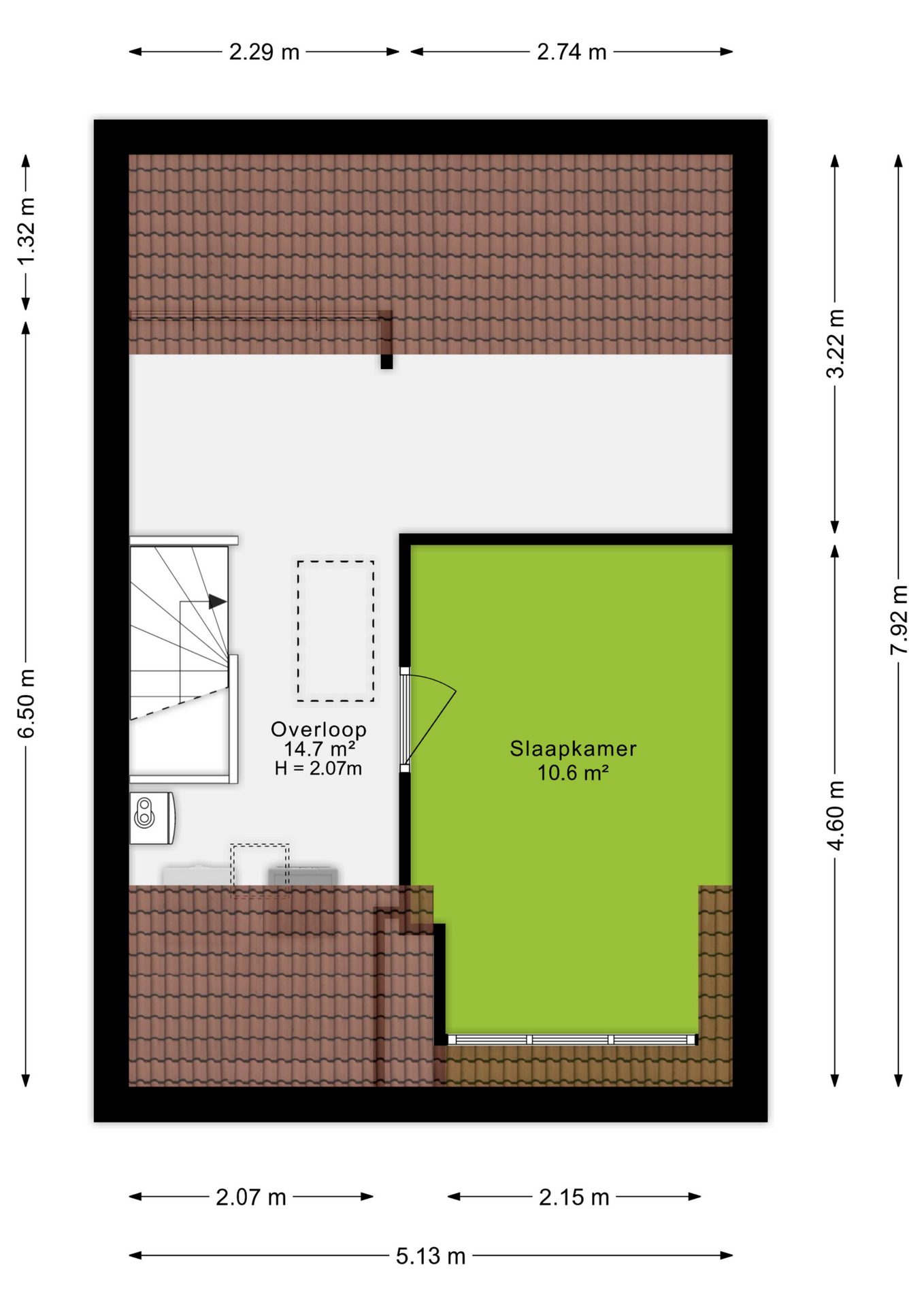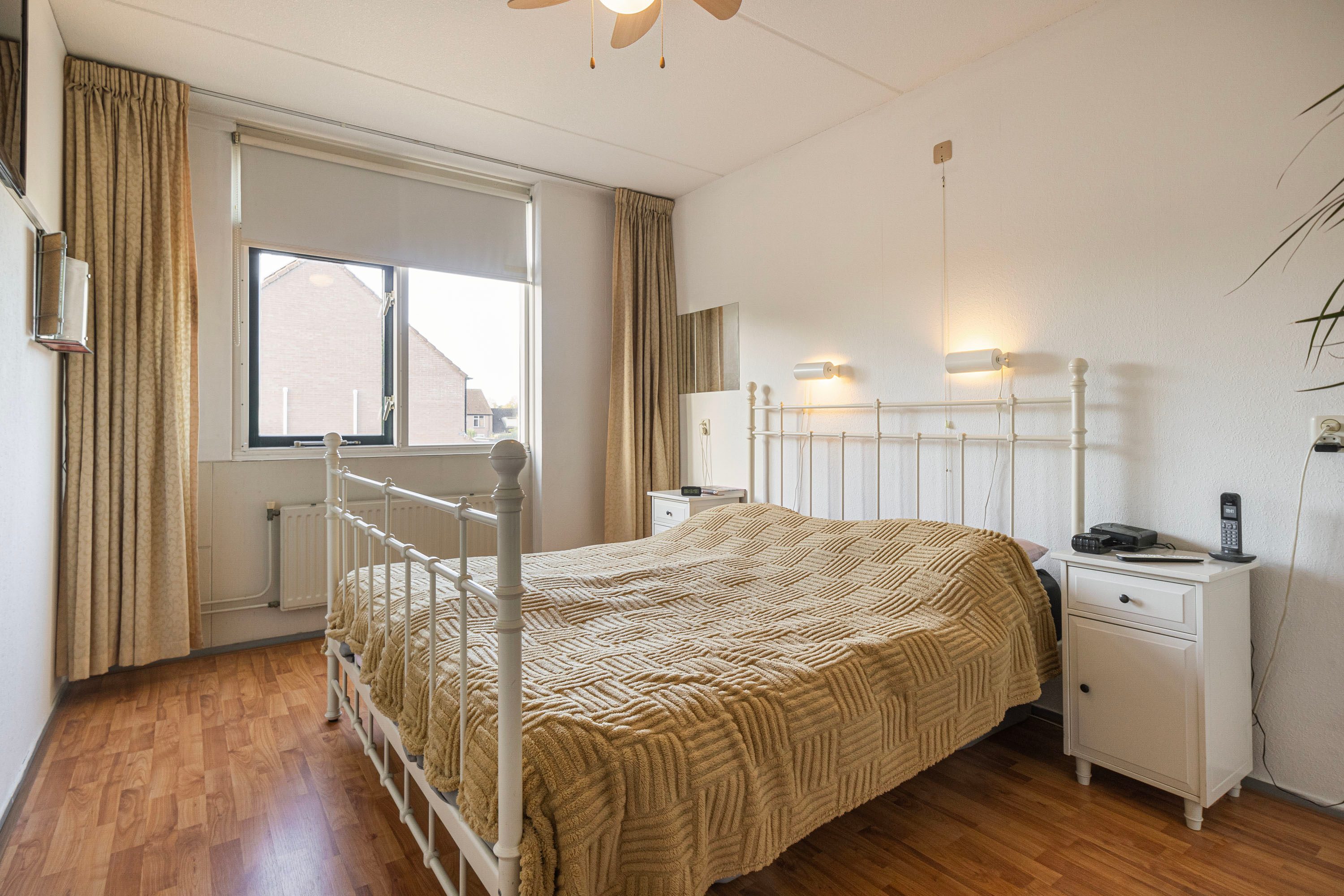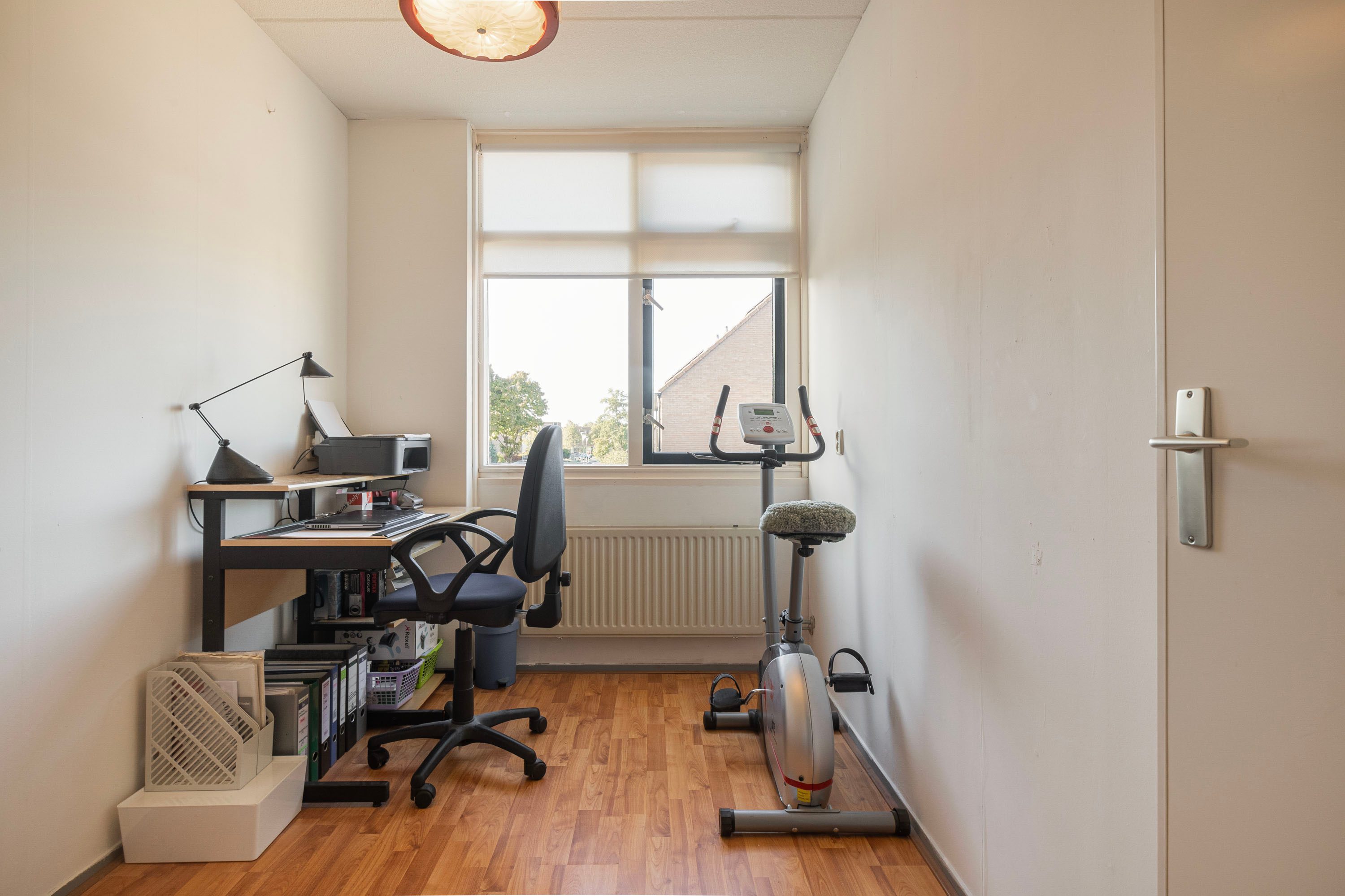Met de vaste trap bereik je de tweede verdieping, waar je op de overloop voldoende bergruimte aantreft, naast de aansluitingen voor zowel de wasmachine als de droger. Ook vind je hier de vierde slaapkamer van 10,6 m², die dankzij de dakkapellen verzekerd is van veel natuurlijk licht. Deze veelzijdige kamer kan tevens dienstdoen als sport- of werkkamer.