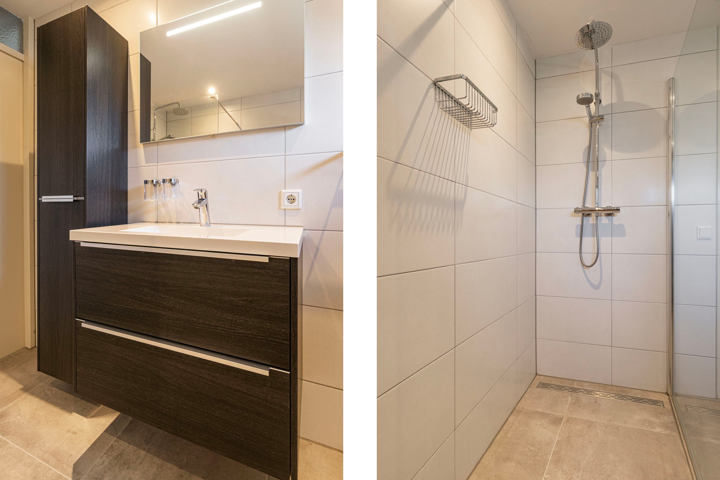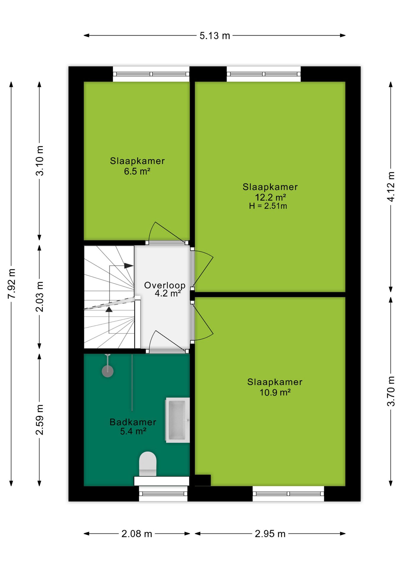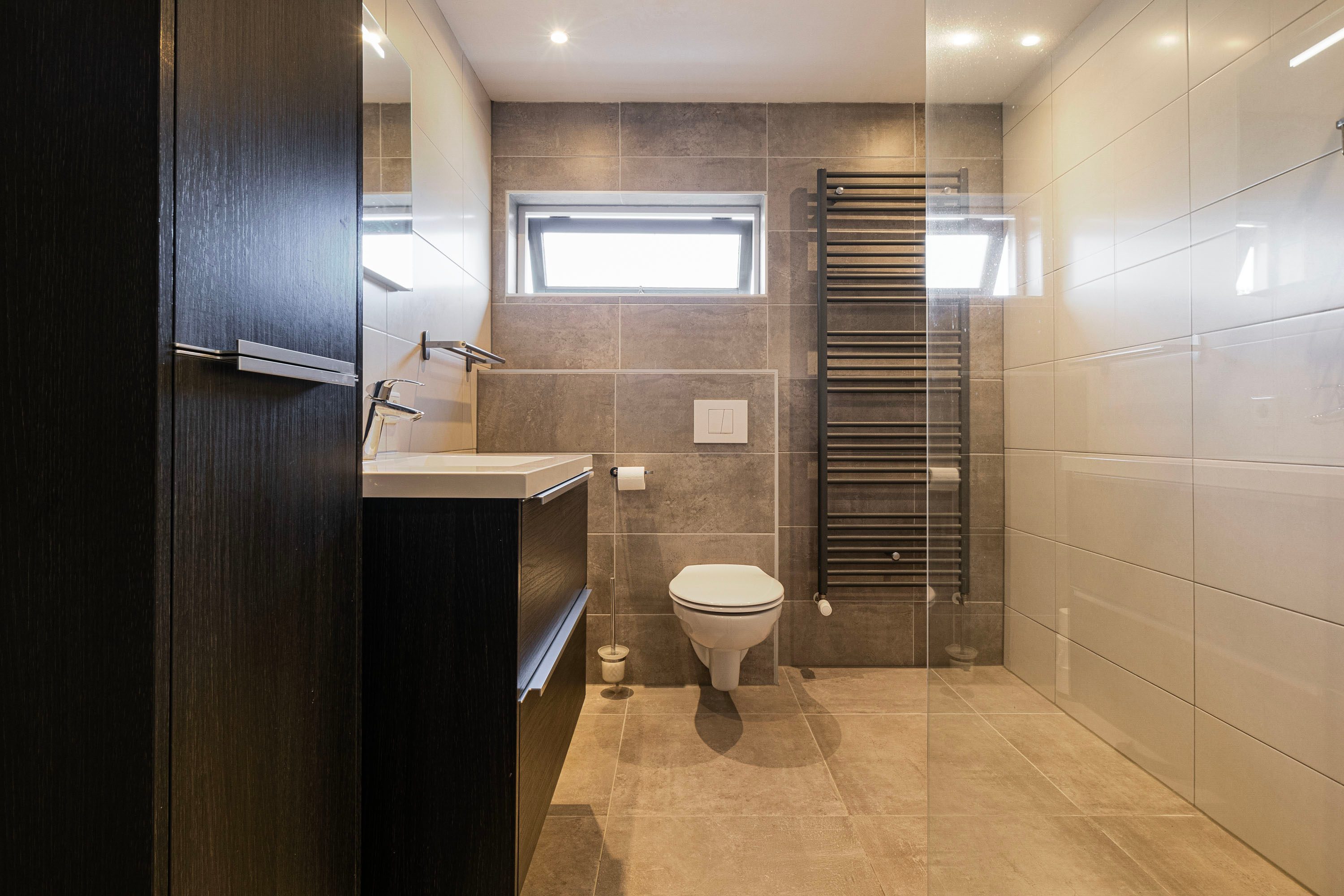 Via de overloop krijg je toegang tot alle kamers van deze verdieping. Hier bevinden zich drie slaapkamers, met oppervlakten van 12,2 m², 10,9 m² en 6,5 m², elk met een raampartij. De grootste twee slaapkamers bieden tevens genoeg ruimte voor een praktische kastenwand. De moderne badkamer van 5,4 m² is afgewerkt met antracietgrijze tegels en tevens uitgerust met een wastafelmeubel, inloopdouche en een toilet. Het aanwezige raam zorgt voor natuurlijke ventilatie.