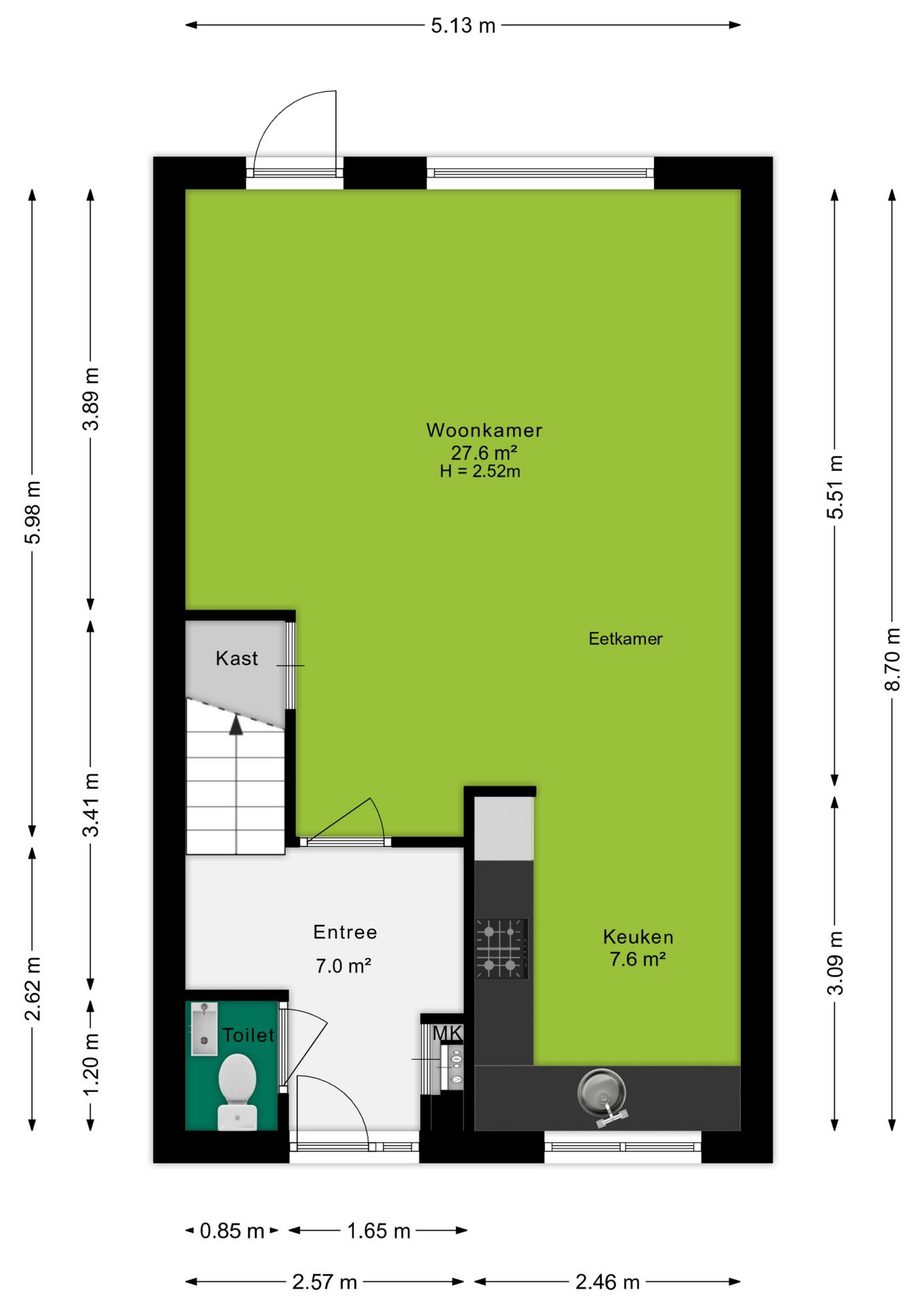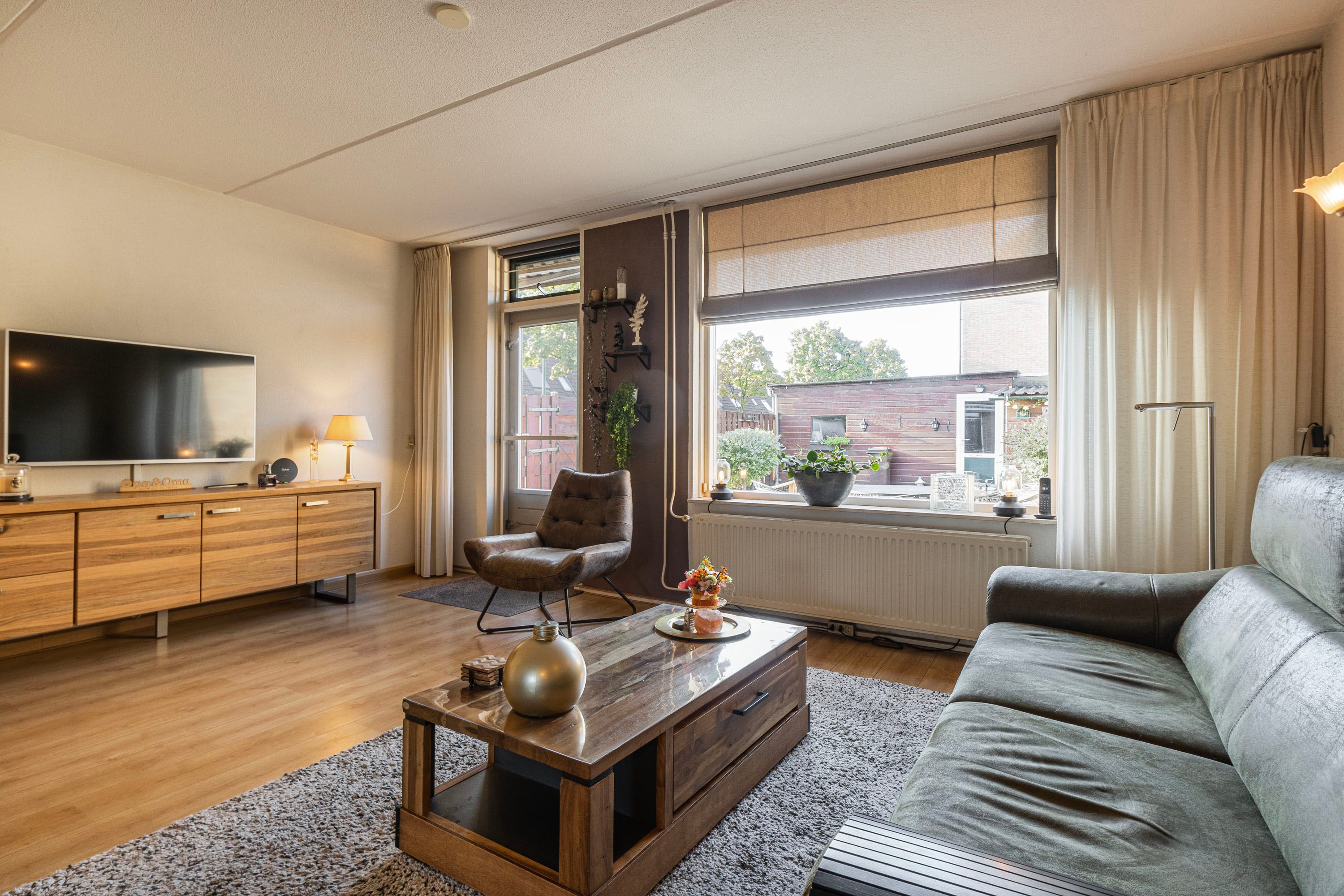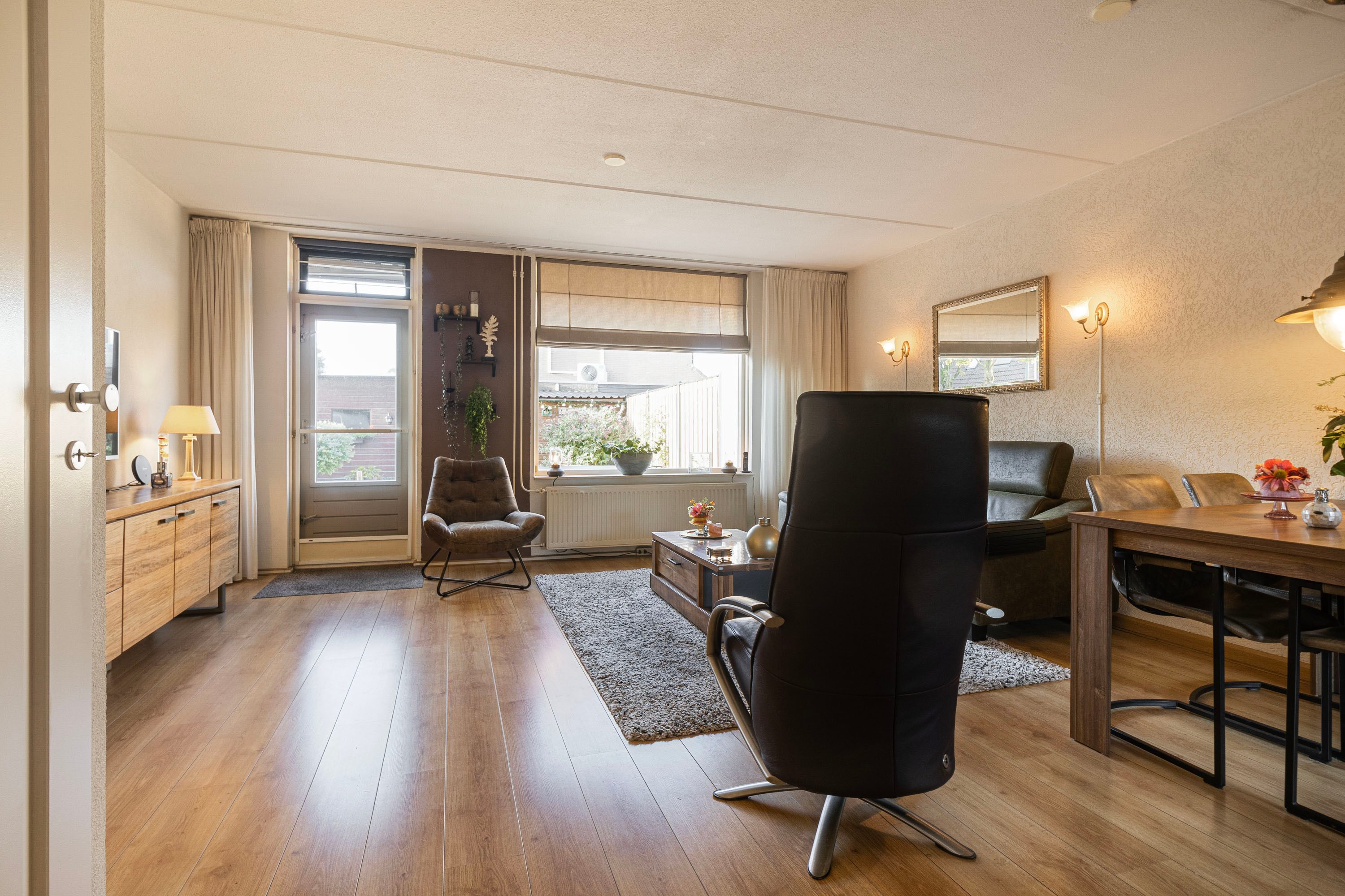 Via de royale entree, waar tevens het toilet, de meterkast en de trapopgang aanwezig zijn, kom je in een ruime woonkamer terecht. Deze kamer beschikt over genoeg daglicht dankzij de grote raampartijen en de aanwezige tuindeur. biedt voldoende ruimte voor een grote hoekbank en een gezellige zithoek. Centraal gelegen vind je het eetgedeelte, dat overgaat in de ruime, halfopen keuken. De keuken is voorzien van diverse inbouwapparatuur en beschikt over een raampartij die geopend kan worden voor optimale ventilatie.