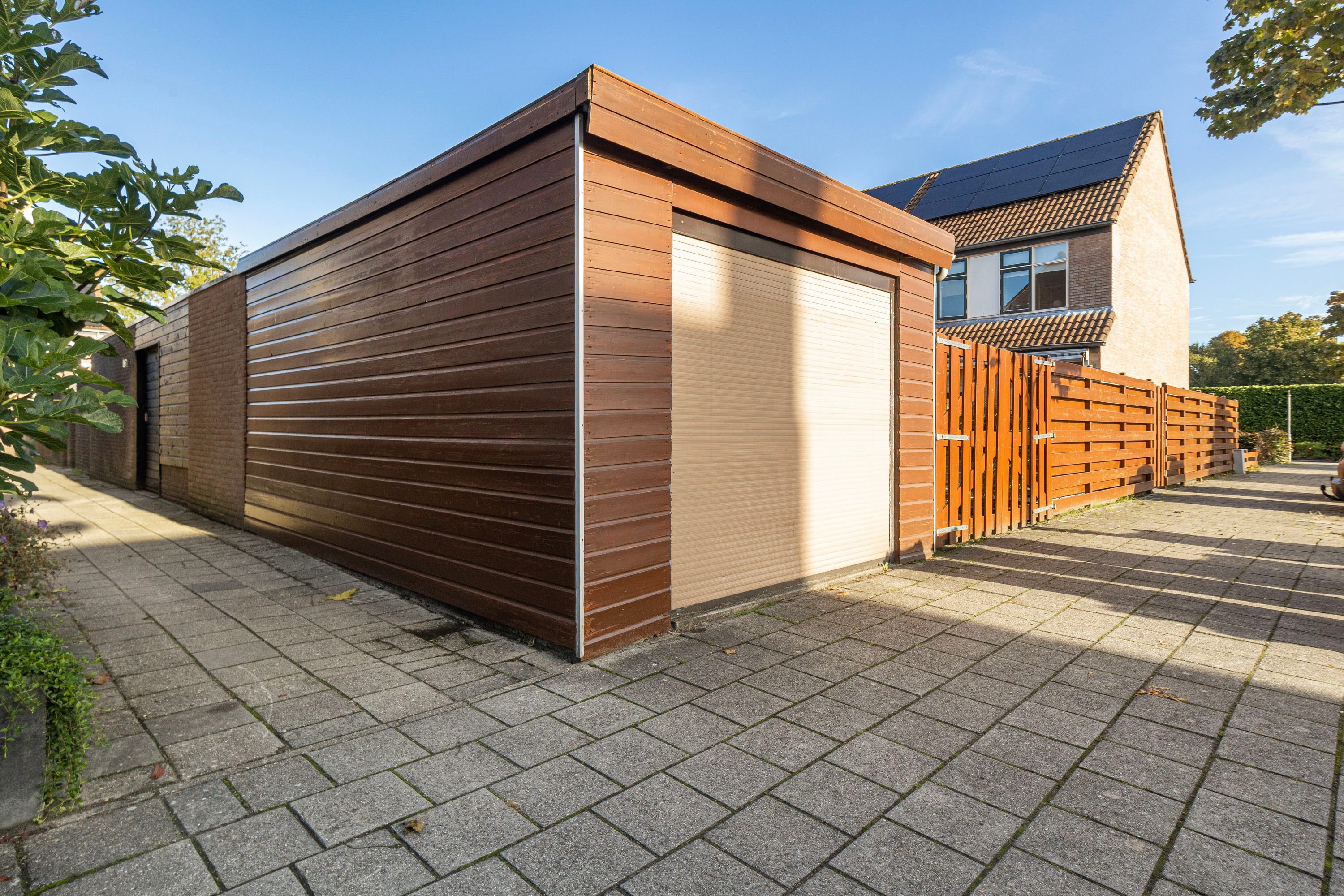 De royale, op het zuiden gelegen tuin is zowel vanuit de woonkamer als via de achterom toegankelijk. De tuin biedt volop mogelijkheden om een fijne loungehoek en een speelhoek voor de kinderen te creëren. Aan de achterzijde is tevens een overkapping, berging van 5,8 m² en garage van 17,6 m² aanwezig, die via de zijkant bereikbaar is en ideaal is voor het parkeren van de auto of het opbergen van diverse spullen. De achtertuin is dusdanig groot dat er meer dan voldoende tuin overblijft indien de woning aan de achterzijde wordt voorzien van een uitbouw.
