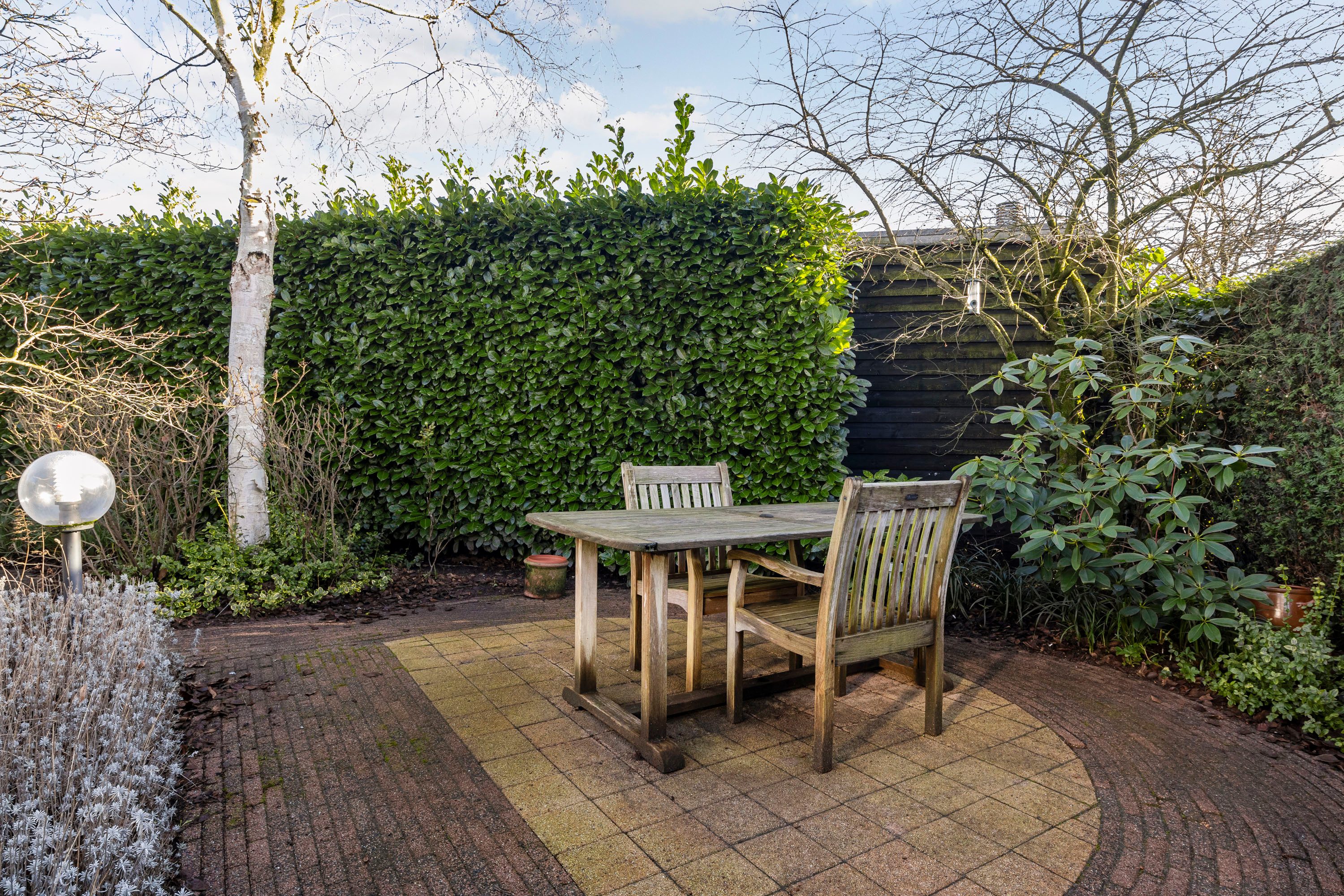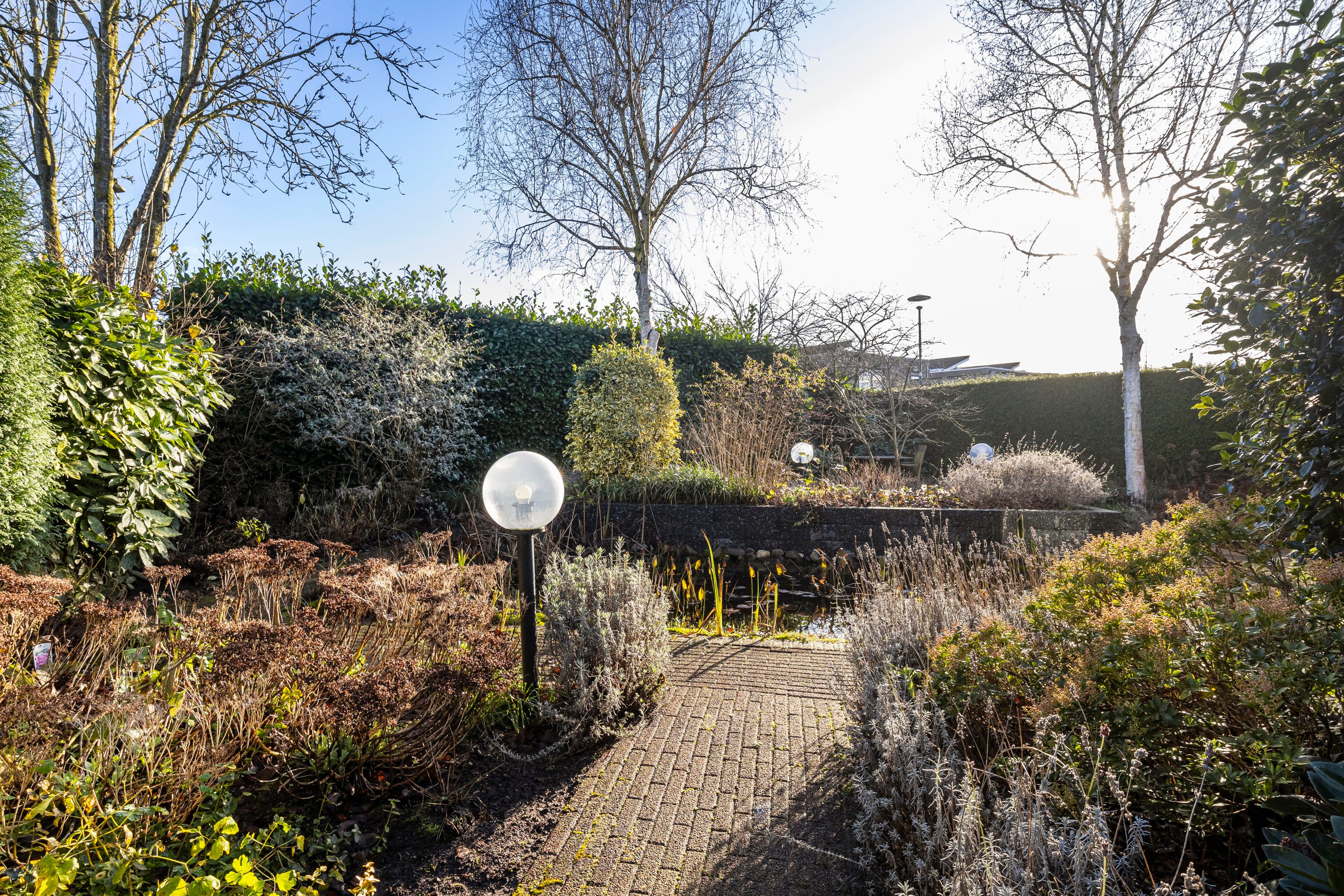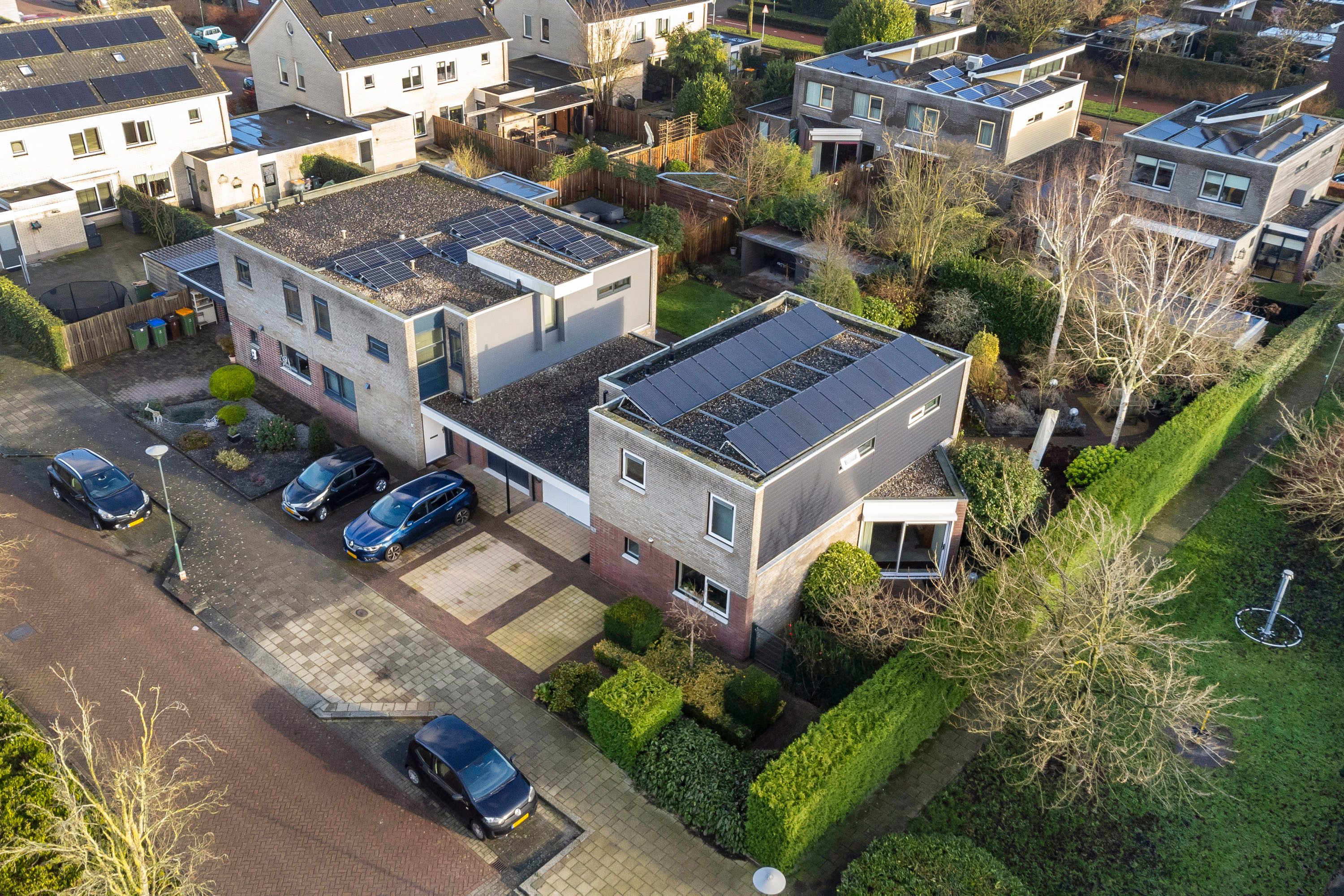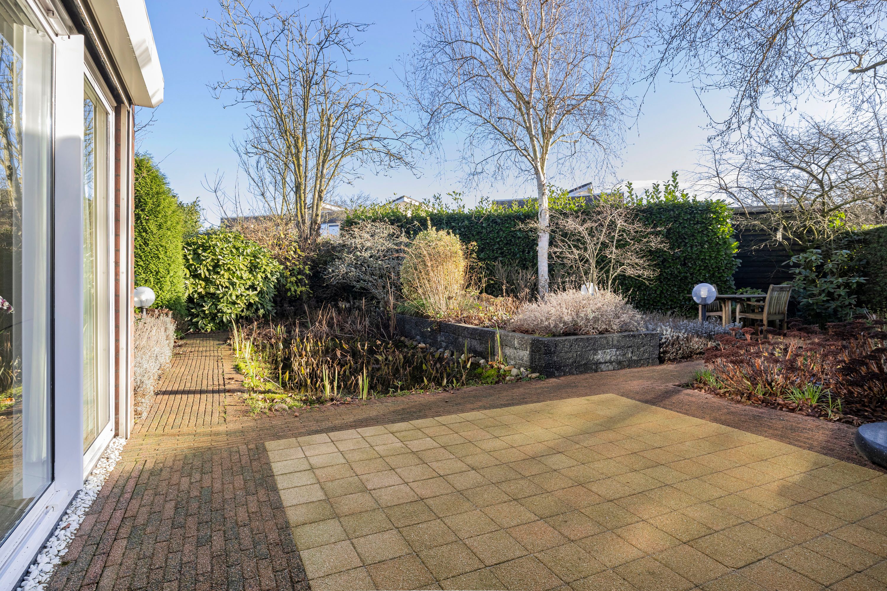 De tuin rondom de woning is een prachtig aangelegde zonnige oase van rust en schoonheid. Weelderige bloemen en planten bloeien in de zomer in een palet van kleuren, terwijl zorgvuldig gesnoeide hagen en bomen structuur en elegantie bieden. Er zijn gezellige zitjes en ook een vijver aangelegd. Deze tuin is een harmonieus samenspel van natuur en design. Om de tuin is een hekwerk geplaatst met een poort. De inpandige garage is voorzien van een gecoate vloer, uitstort gootsteen met kraan en twee openslaande geïsoleerde garagedeuren aan de voorzijde en achterin een deur naar de tuin. Tevens is er een elektrapunt voor het opladen van de elektrische auto. Op de oprit is plaats voor twee auto’s.