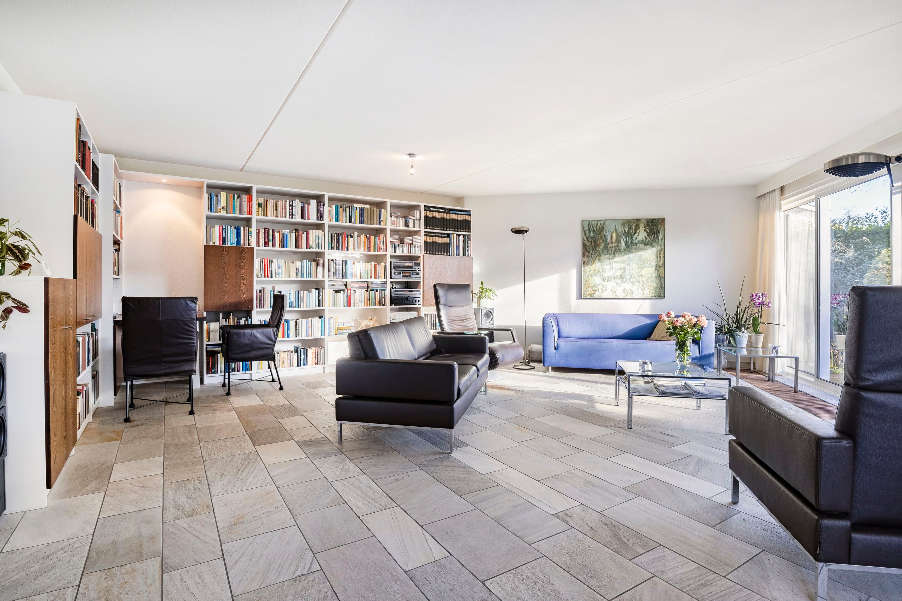 De overdekte entree geeft toegang tot een zeer ruime hal met een fraaie onder de trap ingebouwde garderobe-bergkast. De lichte toiletruimte is volledig betegeld. Voorts bevindt zich in de hal de meterkast (vernieuwd), de trapopgang naar de eerste verdieping en de rechtstreekse inpandige toegang tot de garage en uiteraard de toegang tot het woongedeelte van het huis. De tuingerichte woonkamer is royaal en beschikt over veel daglichtinval. Dit mede dankzij de schuifpui welke toegang tot de achtertuin geeft. De gehele begane grond vloer is voorzien van een fraaie natuurstenen vloer met comfortabele vloerverwarming en convectoren. Vanuit de woonkamer geven twee schuifpuien toegang tot de tuin. Aan de gevels zijn twee elektrisch bedienbare rolluiken geplaatst. Aan de voorzijde van de woning is de half open keuken gesitueerd. De keuken is voorzien van een grote inbouwkeuken (merk Bulthaup) inclusief een donkergrijs composiet werkblad en de volgende inbouwapparatuur: inductie kookplaat, afzuigkap, vaatwasser (recent vernieuwd), koelkast en oven. Veel kastruimte in de vele lades en o.a. een apothekerskast. Vanuit de keuken is er een leuk uitzicht op de straat.
