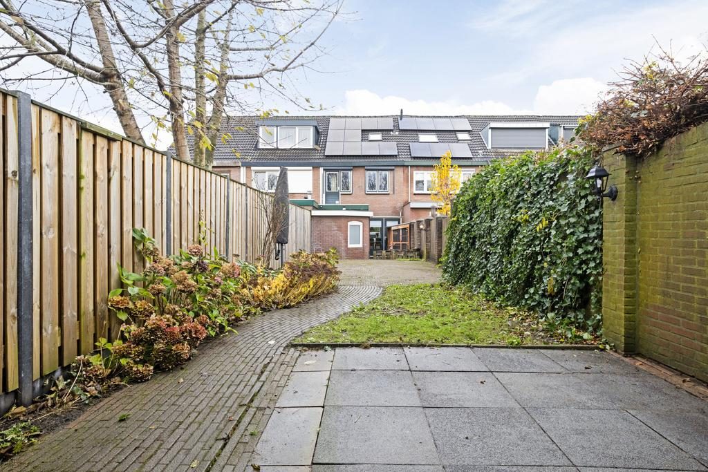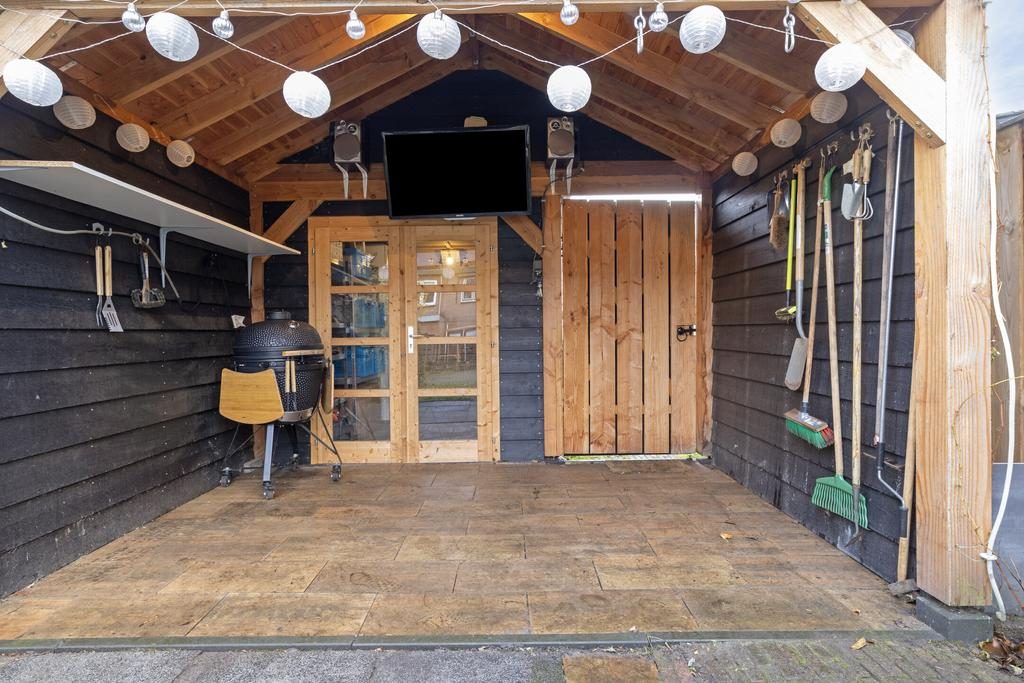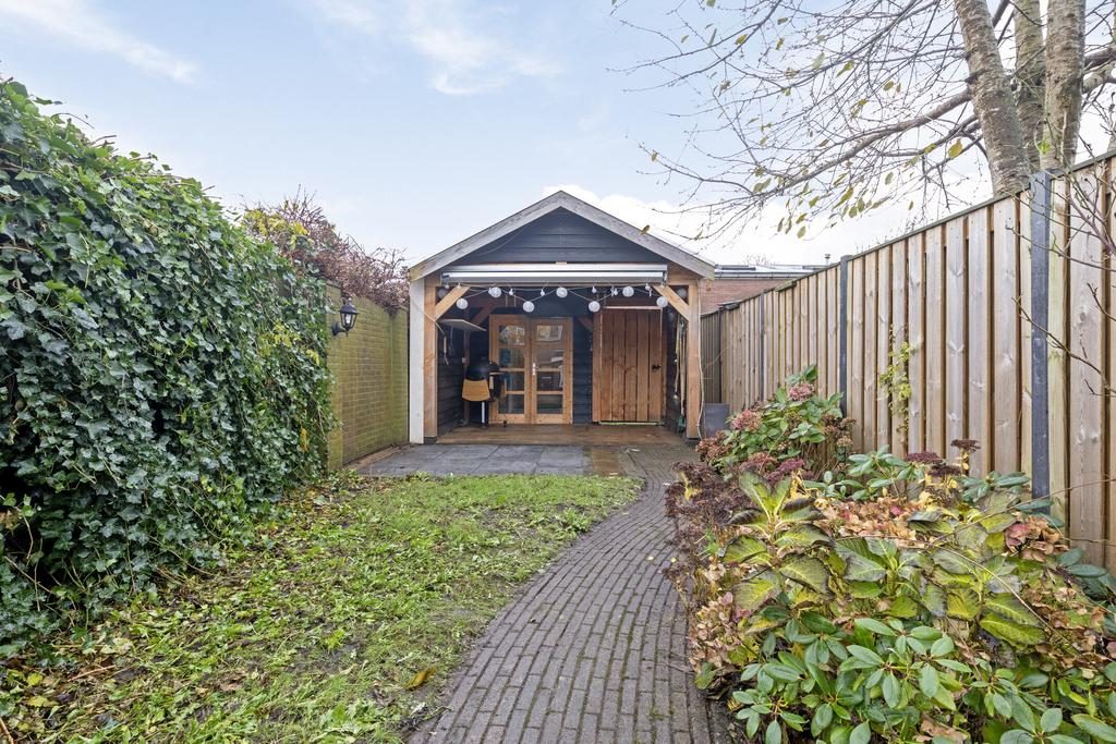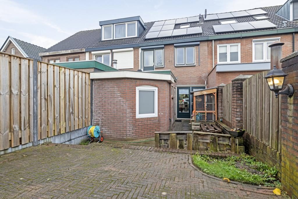 Achter de woning ligt een heerlijk diepe en zonnige tuin, die veel vrijheid biedt. De tuin is op het oosten gelegen, waardoor u hier van veel zonuren kunt genieten. Achterin de tuin staat twee bergingen. Hiervan wordt er één gebruikt voor de fietsen en de 2e voor opslag van gereedschap en andere spullen. Uiteraard mag een gezellige veranda niet ontbreken!