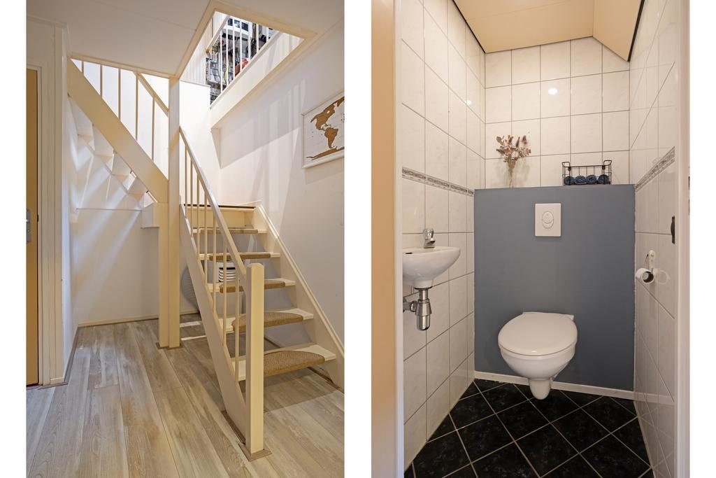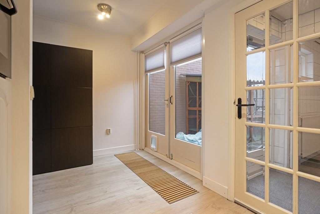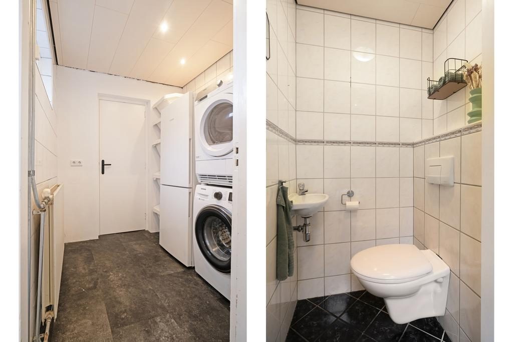 Vanuit de keuken is de hal met toilet en de bijkeuken te bereiken. In de bijkeuken bevinden zich de aansluitingen voor de wasmachine en droger. Er is ook ruimte voor een losse koelkast/vriezer. Vanuit de bijkeuken bereik je de badkamer. De badkamer is in (2021) vernieuwd en voorzien van een ligbad met douche, wastafelmeubel met enkele wastafel, een radiator en een te openen raam voor de gewenste natuurlijke ventilatie.