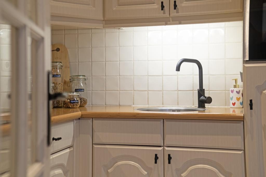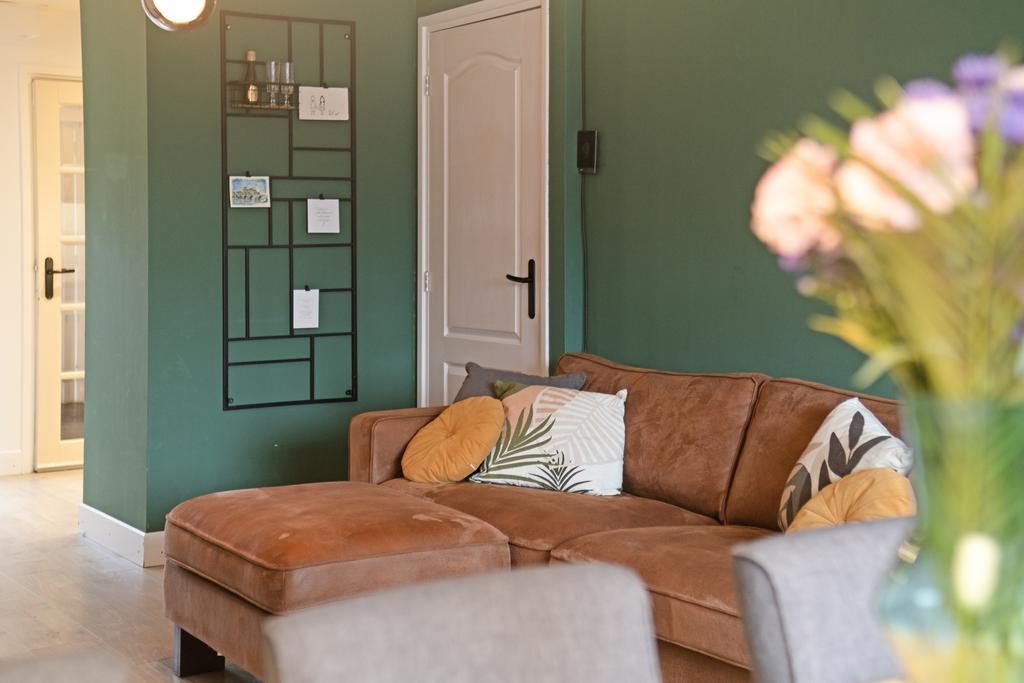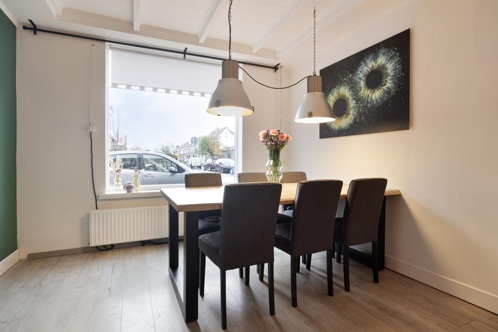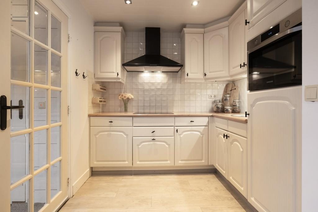 Blikvangers in de woonkamer zijn het karakteristieke balkenplafond, de mooie paneeldeuren met zwarte handgrepen en de houtlook laminaatvloer. Aan de achterzijde van de woning bevindt zich de open keukenruimte met openslaande deuren naar de tuin. We zien hier een nette L-vormige keukenopstelling die is afgewerkt met lichte fronten, een kunststof aanrechtblad in een houtstructuur en zwarte elementen als handgrepen. Alle gemakken zijn aanwezig zoals een inductiekookplaat, zwarte afzuigkap, combi-oven, koelkast en een vaatwasser. Woonkamer en keuken bieden samen circa 39m² aan stijlvol ingerichte leefruimte.