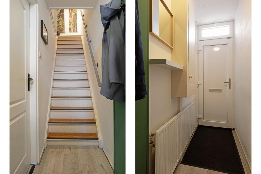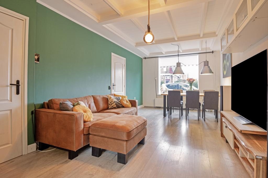 Bij aankomst is de mooie jaren '30 sfeer voelbaar. Zo valt direct het gedetailleerde metselwerk met rollagen op. De verwarmde entree met meterkast en trapopgang naar de 1e verdieping brengt je via een toegangsdeur naar de leefruimte. Eenmaal in de woonkamer zien we dat de huidige bewoners ervoor hebben gekozen om de eettafel aan de voorzijde en het zitgedeelte centraal te positioneren. Een grote raampartij aan de voorzijde voorziet zowel de eetkamer als woonkamer van veel daglicht.