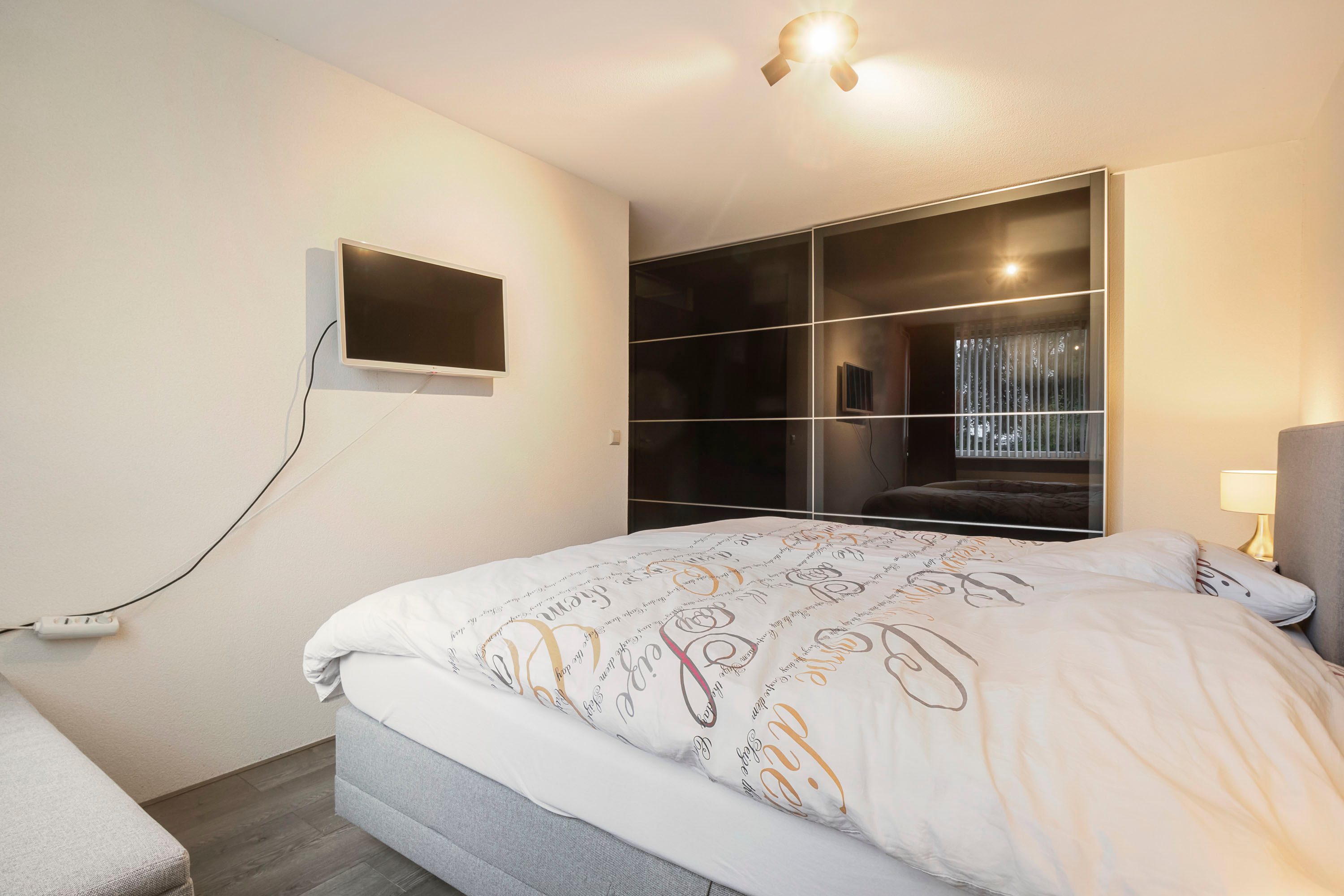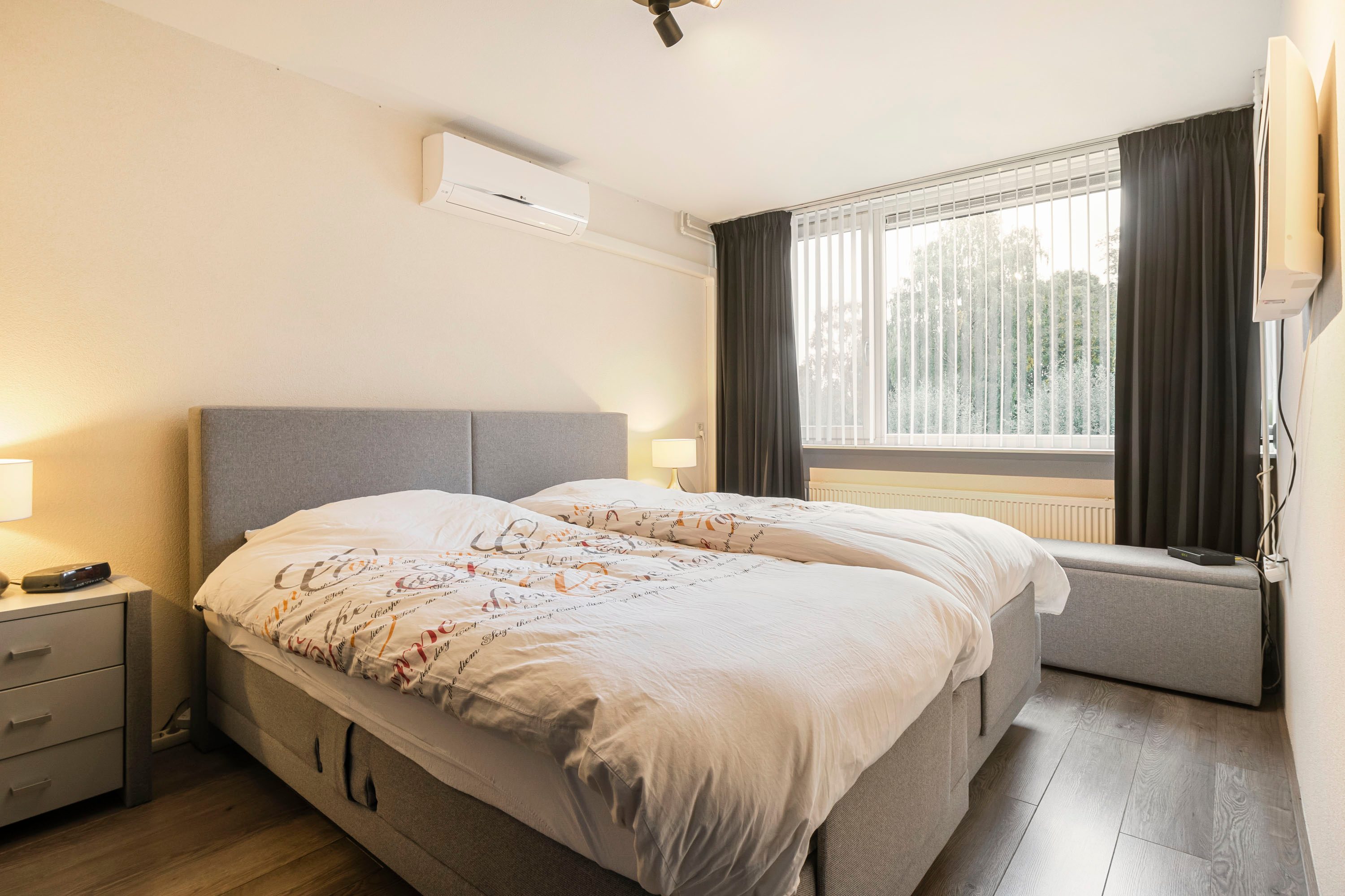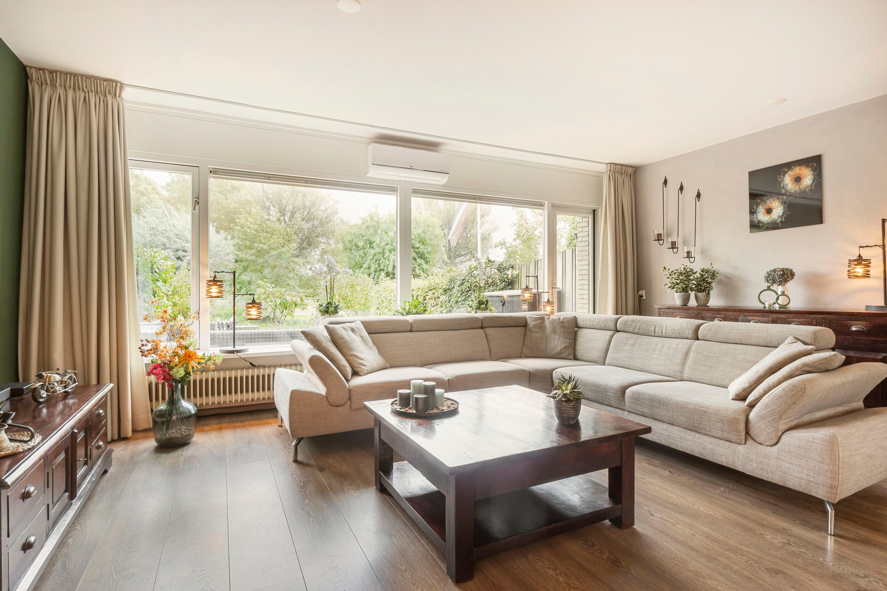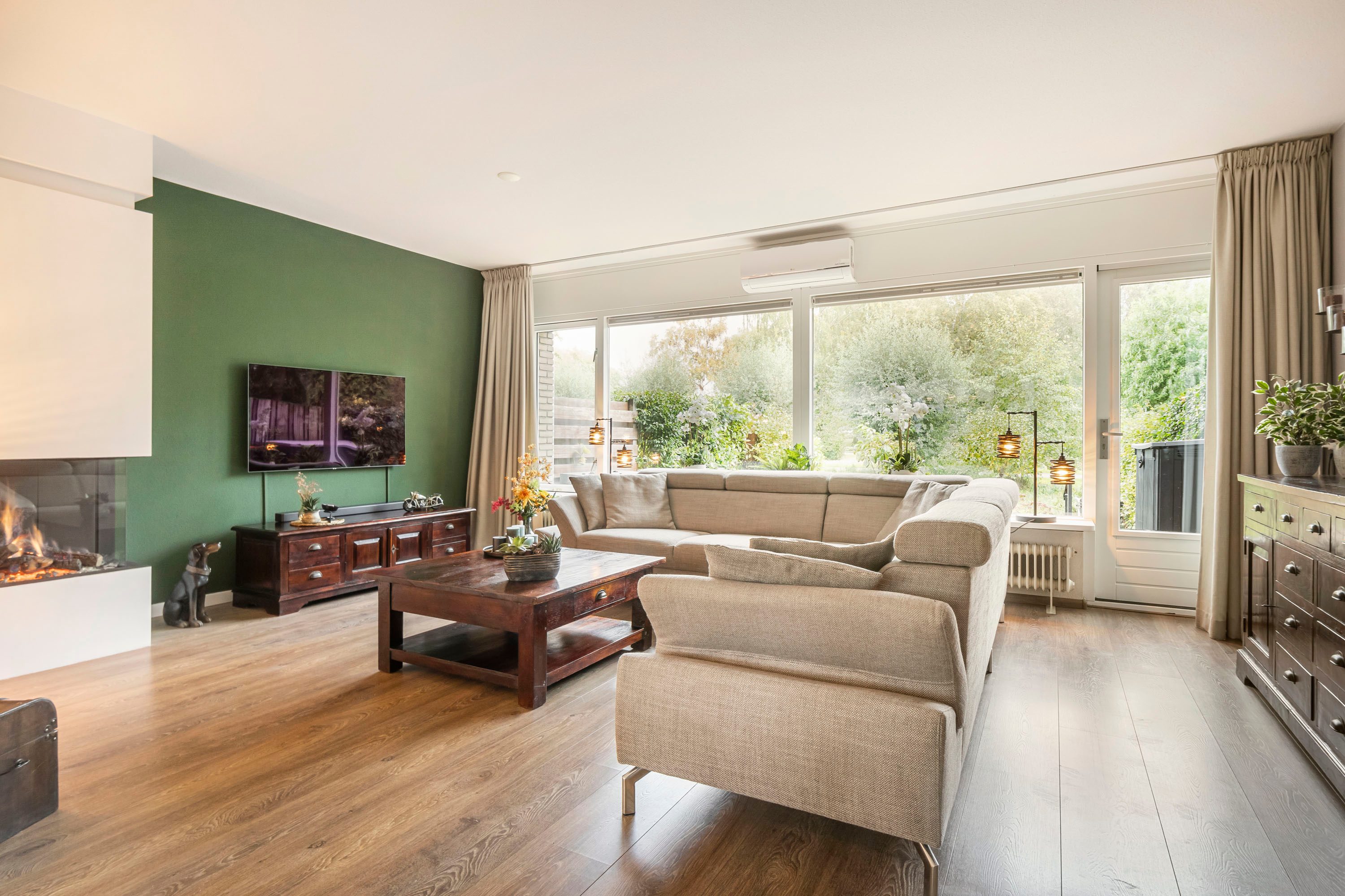 De woonkamer is bovendien voorzien van een airconditioning, die op warme zomerdagen zorgt voor een aangename koelte en in de winter juist heerlijk kan verwarmen. Een comfortabel en energiezuinig systeem dat bijdraagt aan het woongenot het hele jaar door.