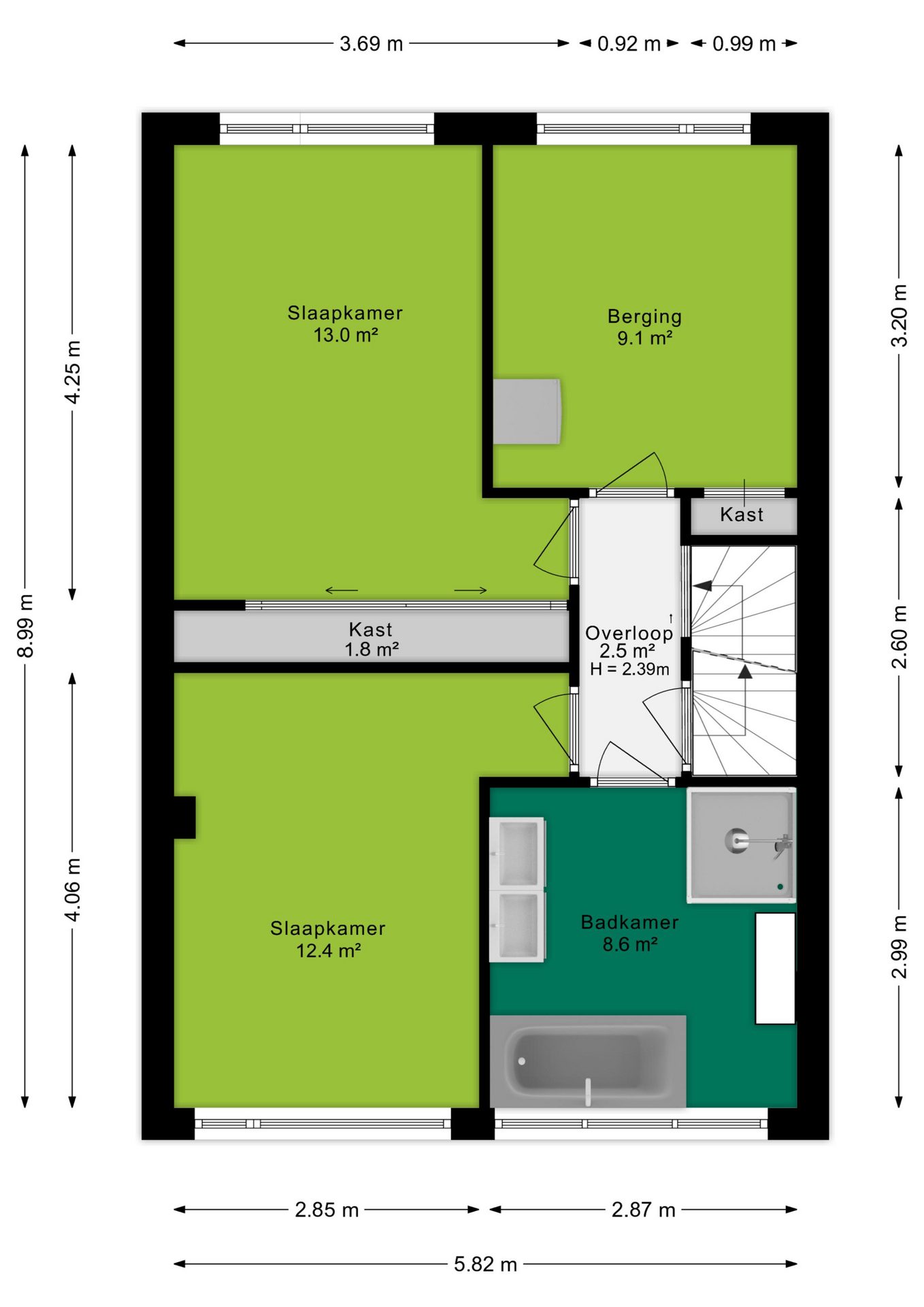 De open trap in de woonkamer leidt naar de overloop met toegang tot drie ruime slaapkamers van 13 m², 12,4 m² en 9,1 m². De kamers aan de achterzijde beschikken over handige ingebouwde kasten en de grootste slaapkamer is extra uitgerust met airconditioning, waardoor je zelfs tijdens warme zomernachten heerlijk koel in slaap kunt vallen.