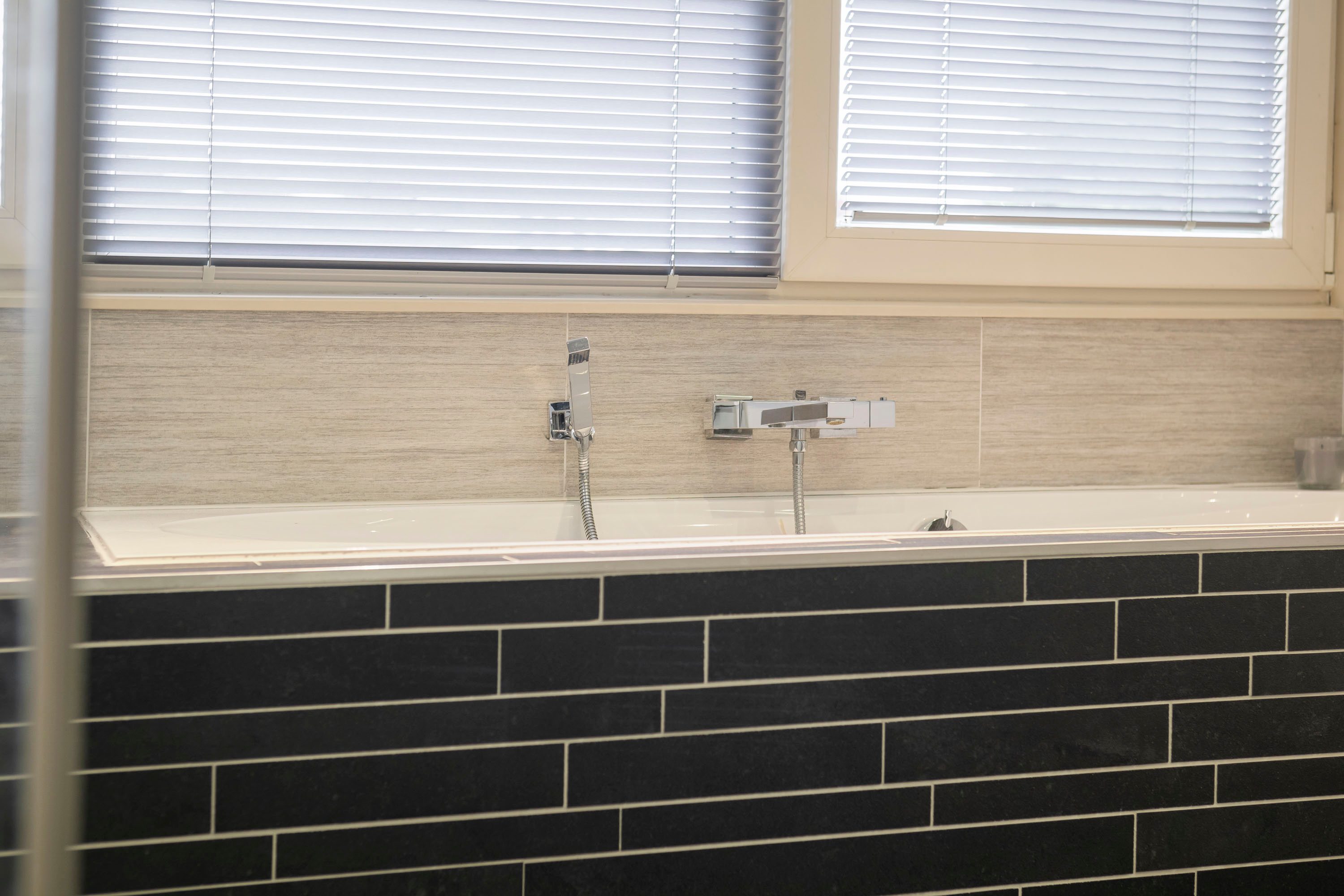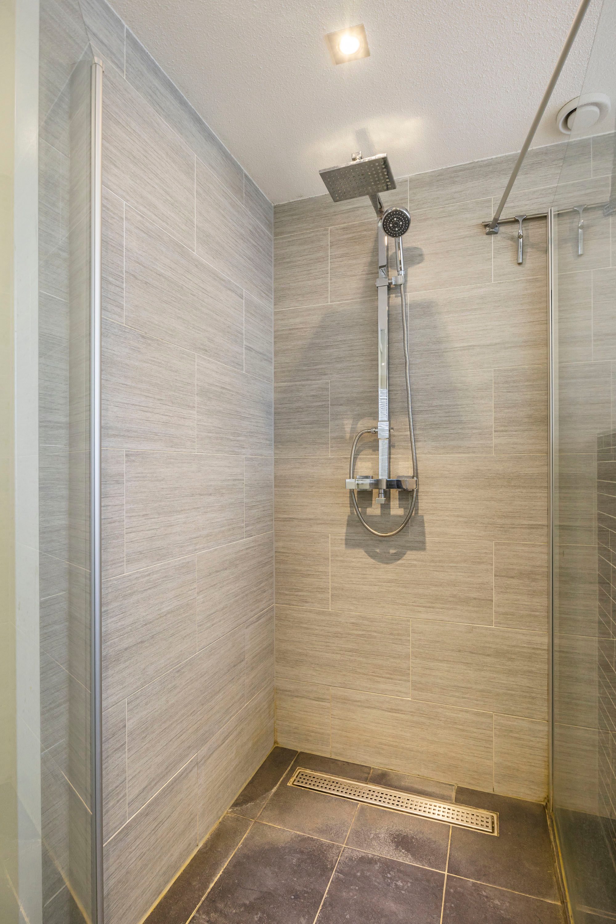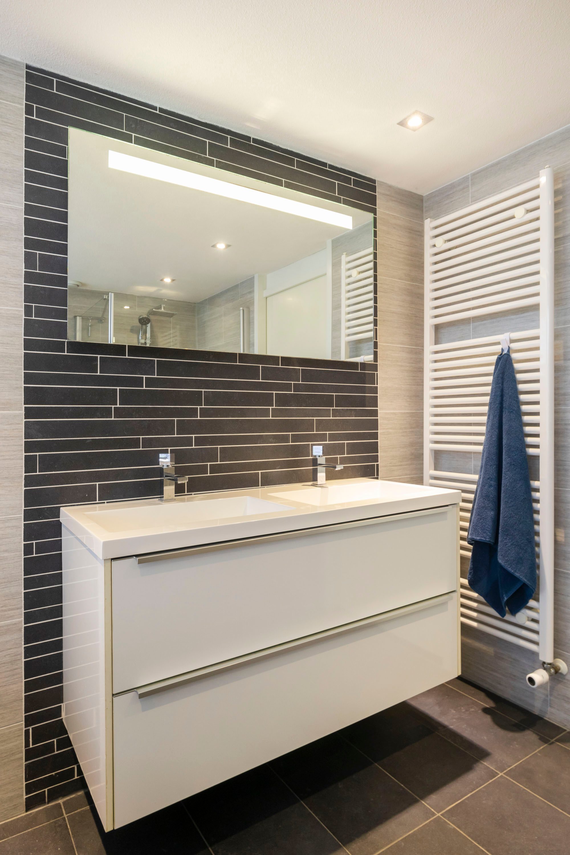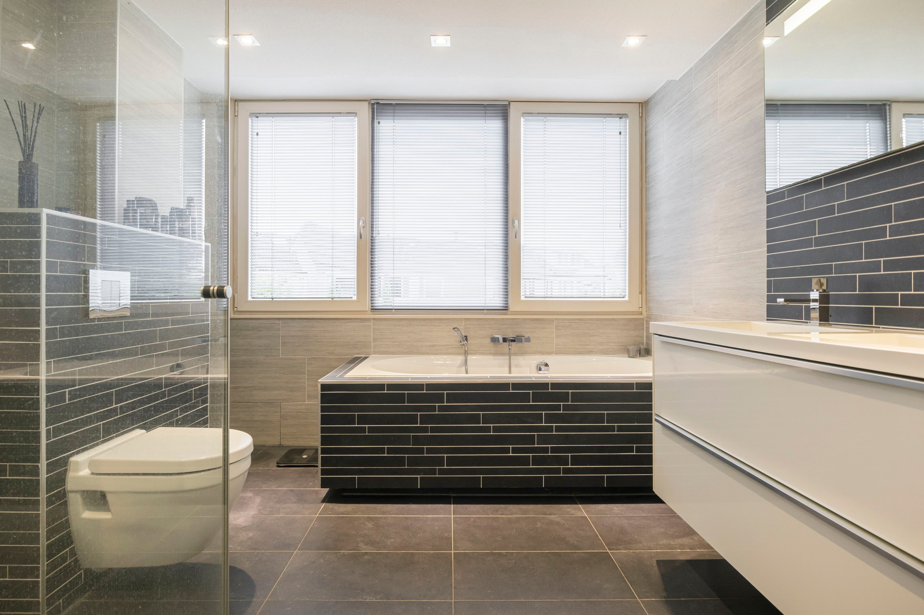 De moderne badkamer (8,6 m²) is compleet ingericht met een wastafelmeubel, tweede toilet, inloopdouche en ligbad. Dankzij het te openen raam geniet je van natuurlijke ventilatie en daglicht.