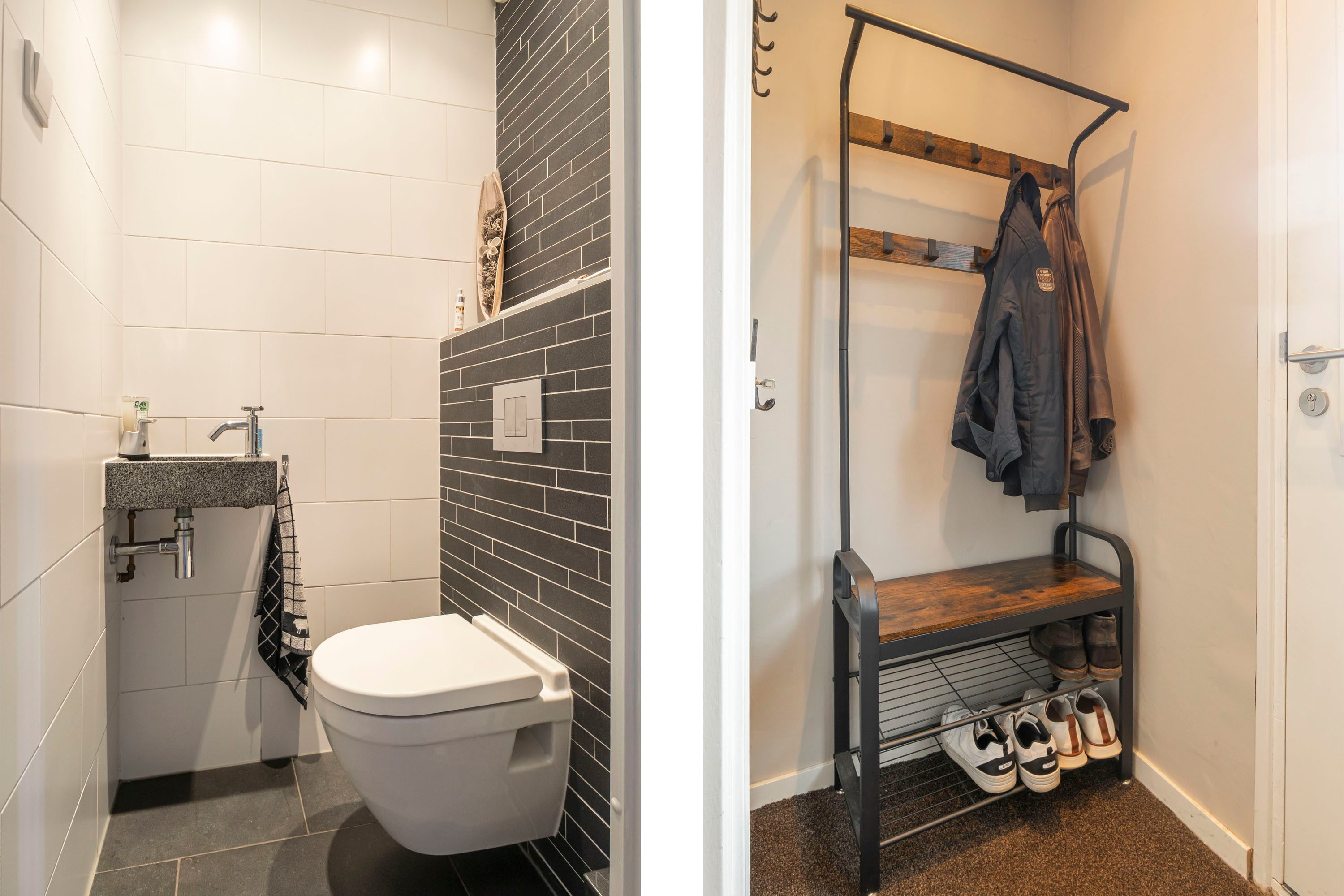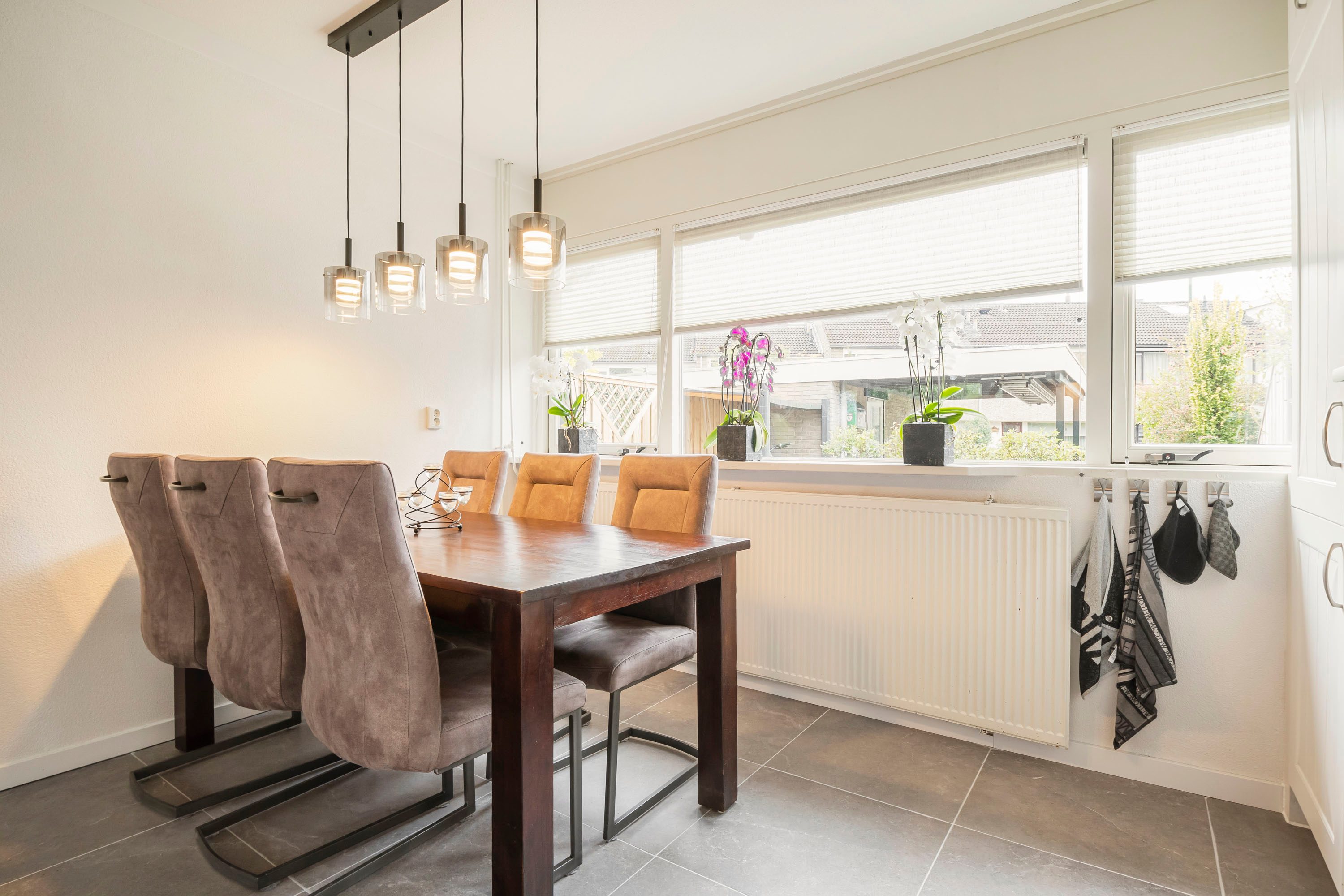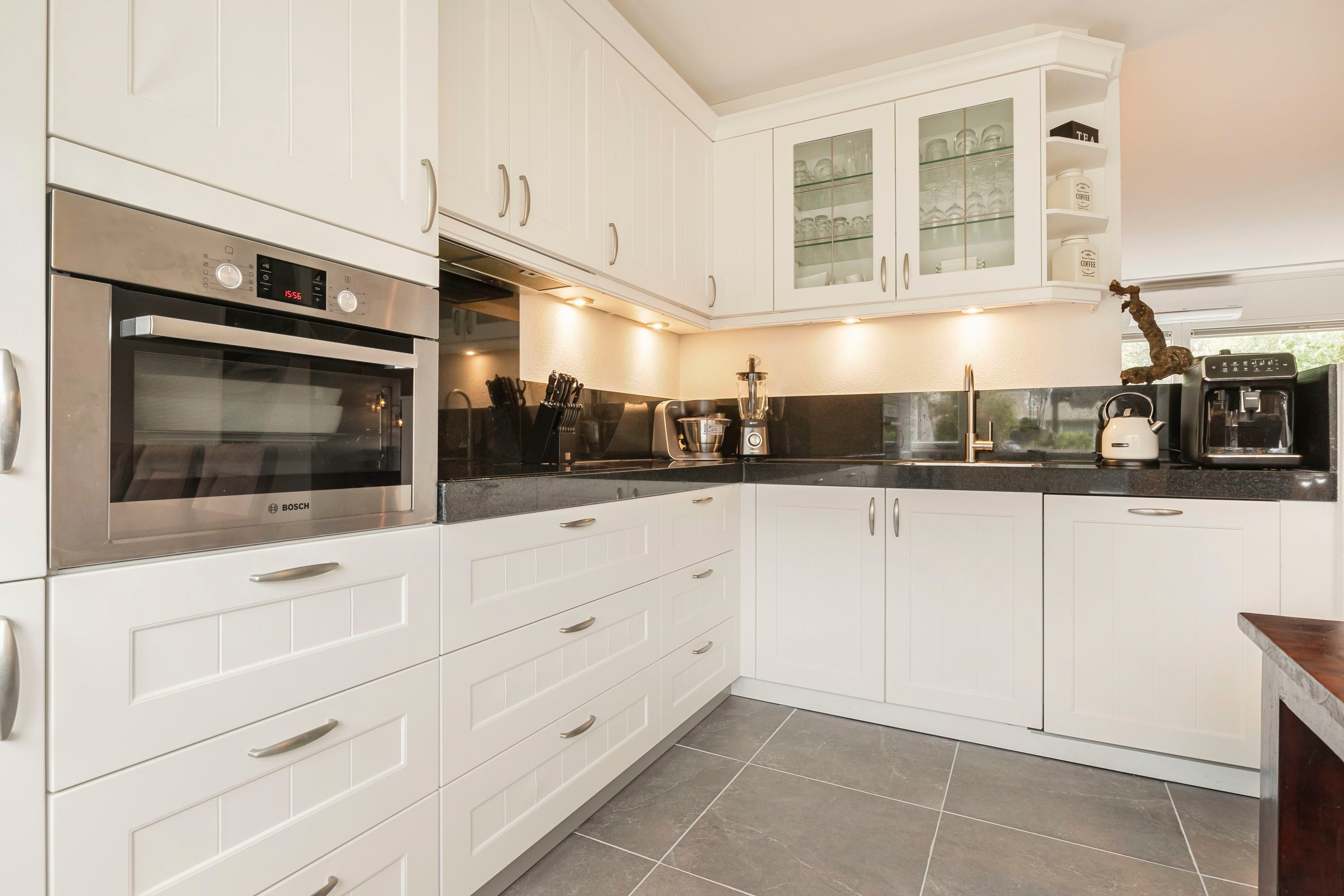 Aan de achterzijde vind je het eetgedeelte en de moderne L-vormige keuken met strakke witte kastjes, een donker marmer werkblad en hoogwaardige inbouwapparatuur, zoals een inductiekookplaat, oven, afzuigkap, koel-vriescombinatie en vaatwasser. Een heerlijke plek om te koken en samen te eten!