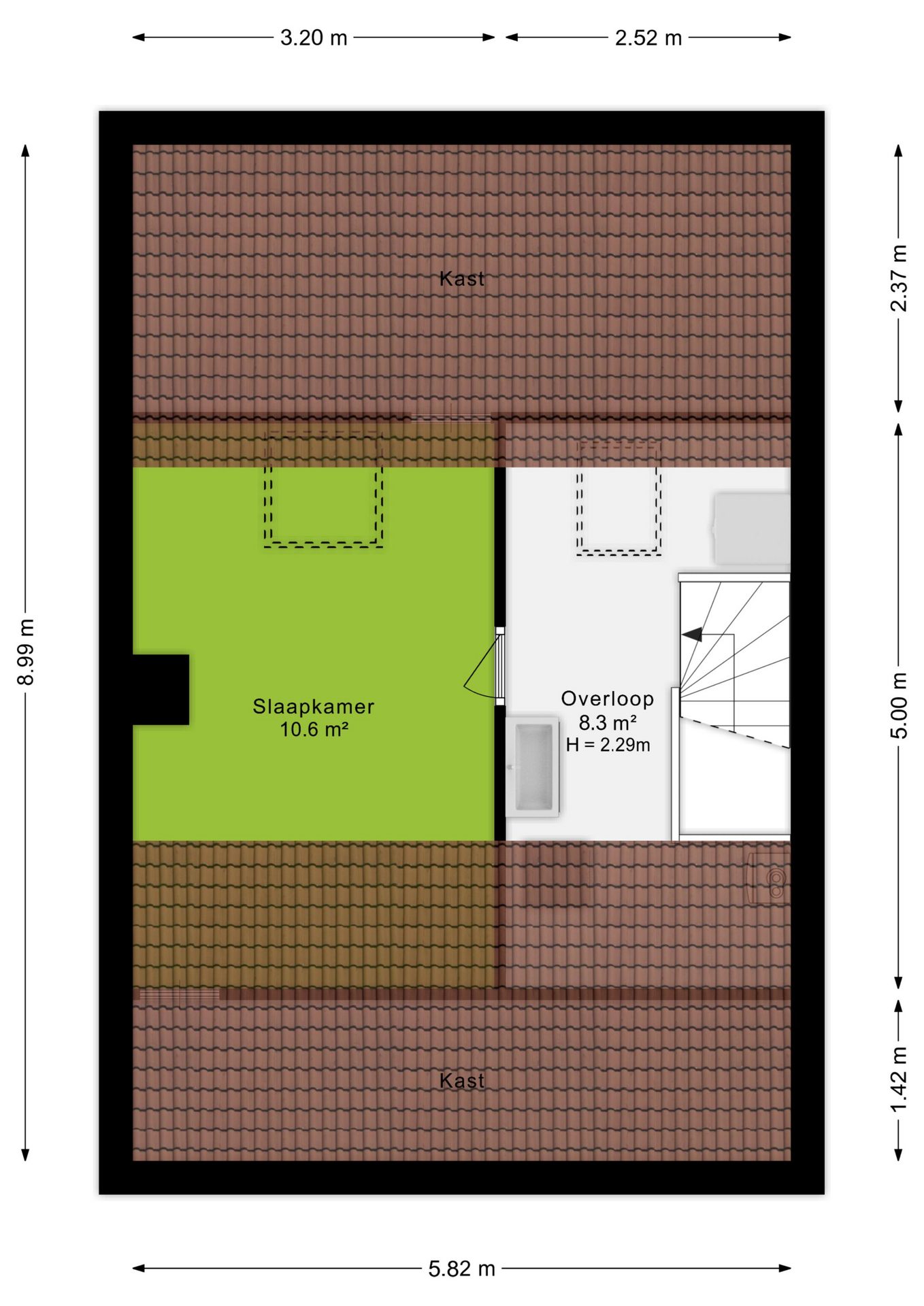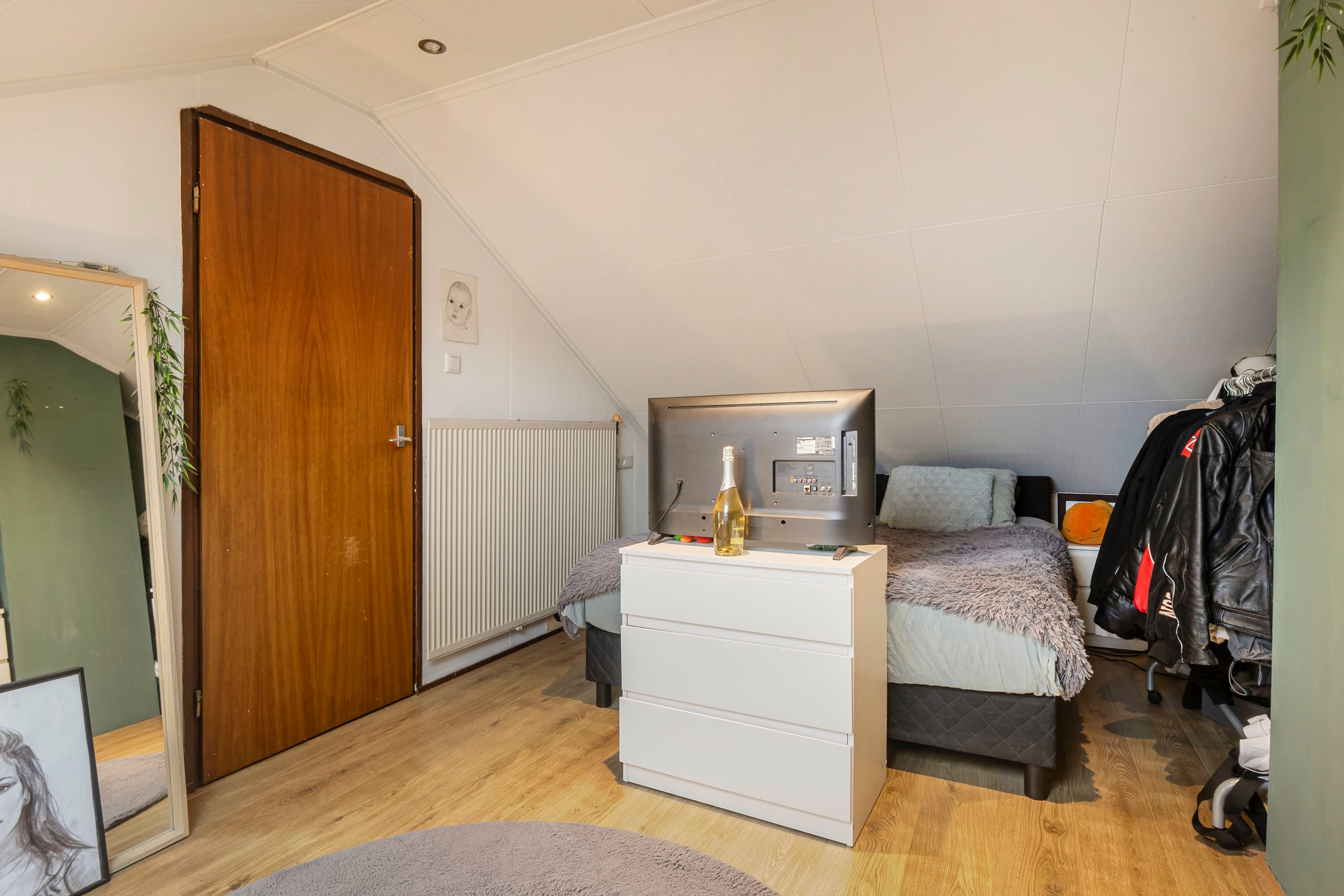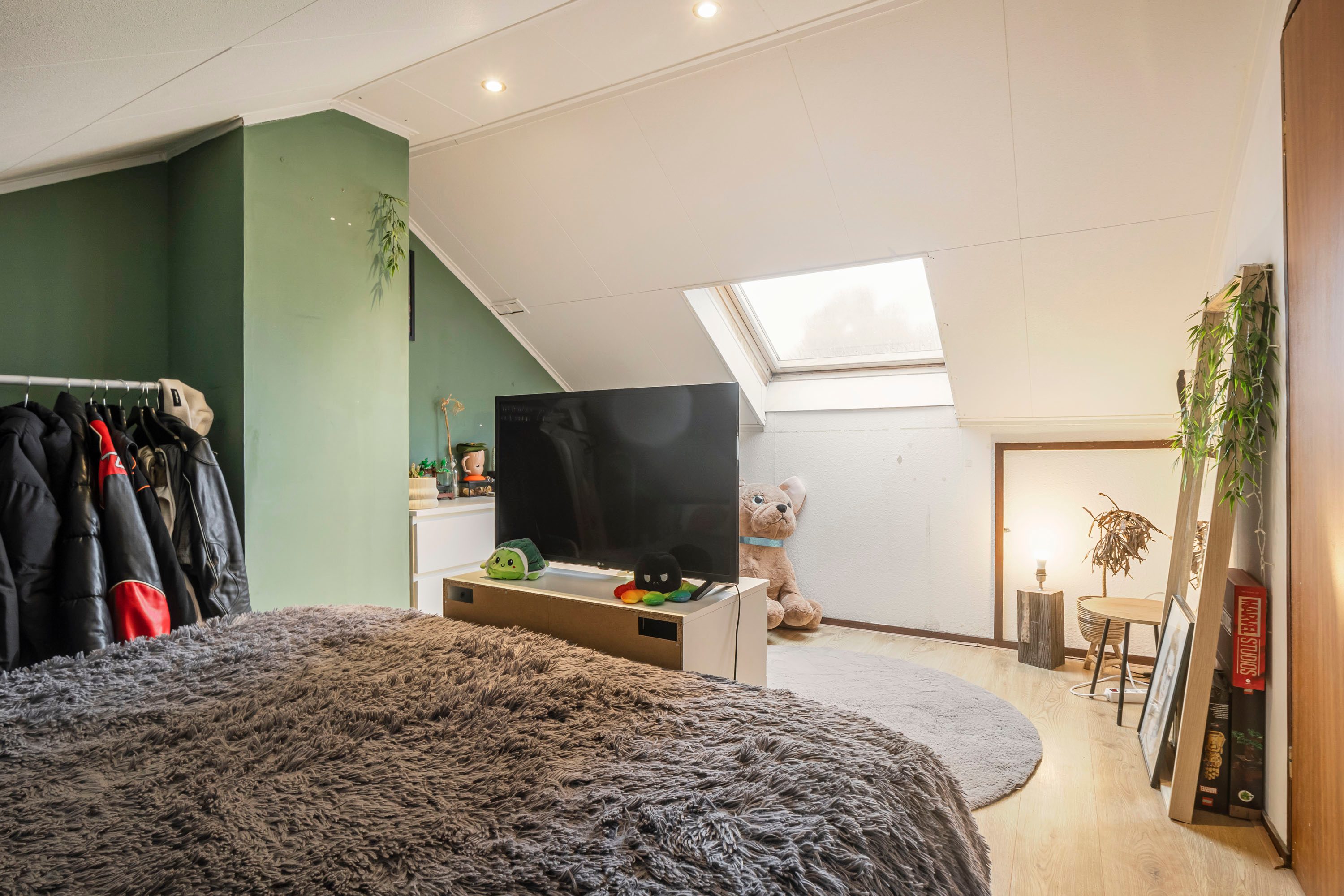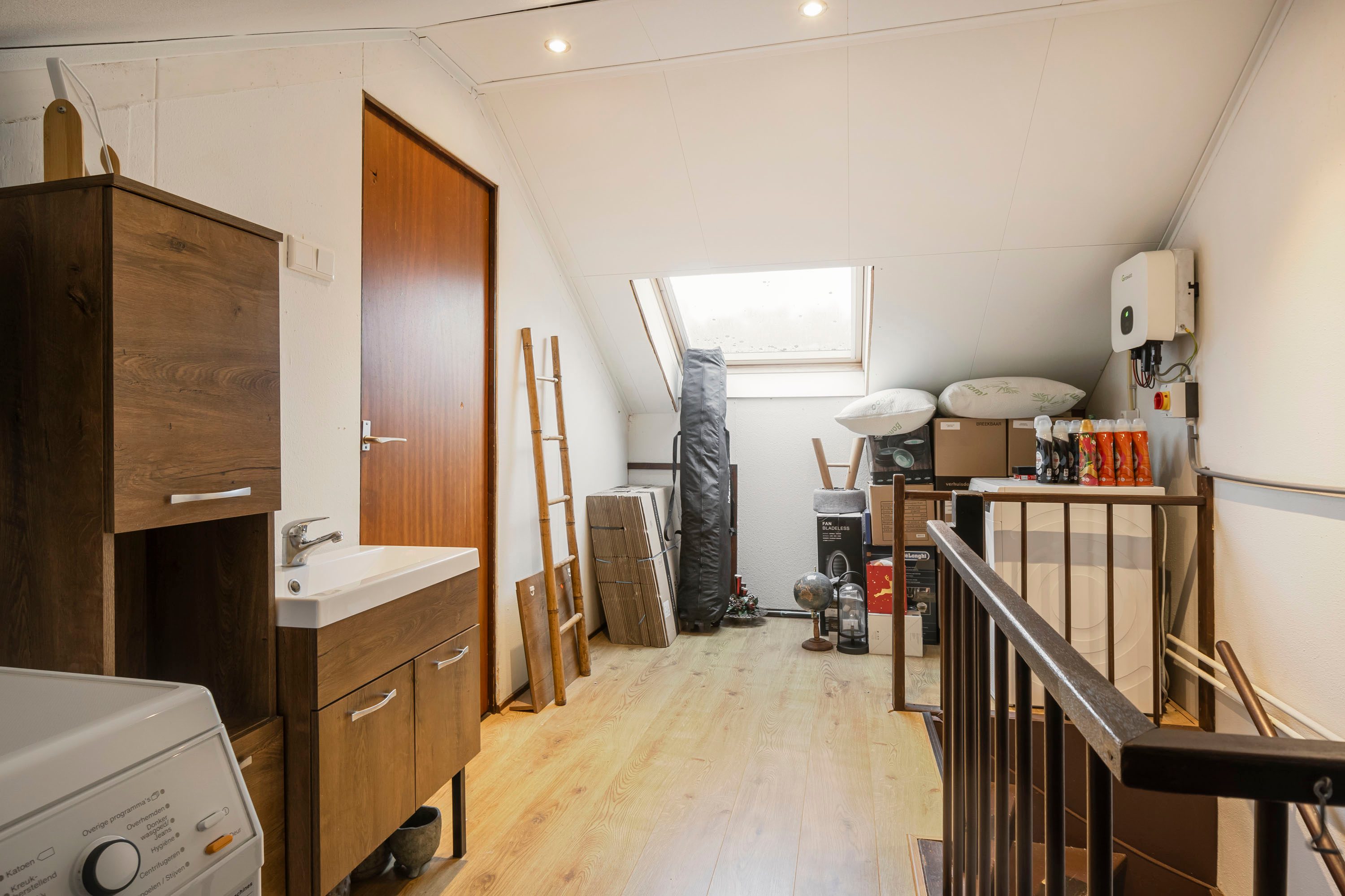 Via een vaste trap bereik je de zolderverdieping. Hier bevindt zich een ruime vierde slaapkamer (10,6 m²), ideaal als logeerkamer, werkruimte of hobbykamer. Op de overloop zijn de aansluitingen voor wasmachine en droger aanwezig en de beide grote dakramen zorgen voor veel lichtinval.