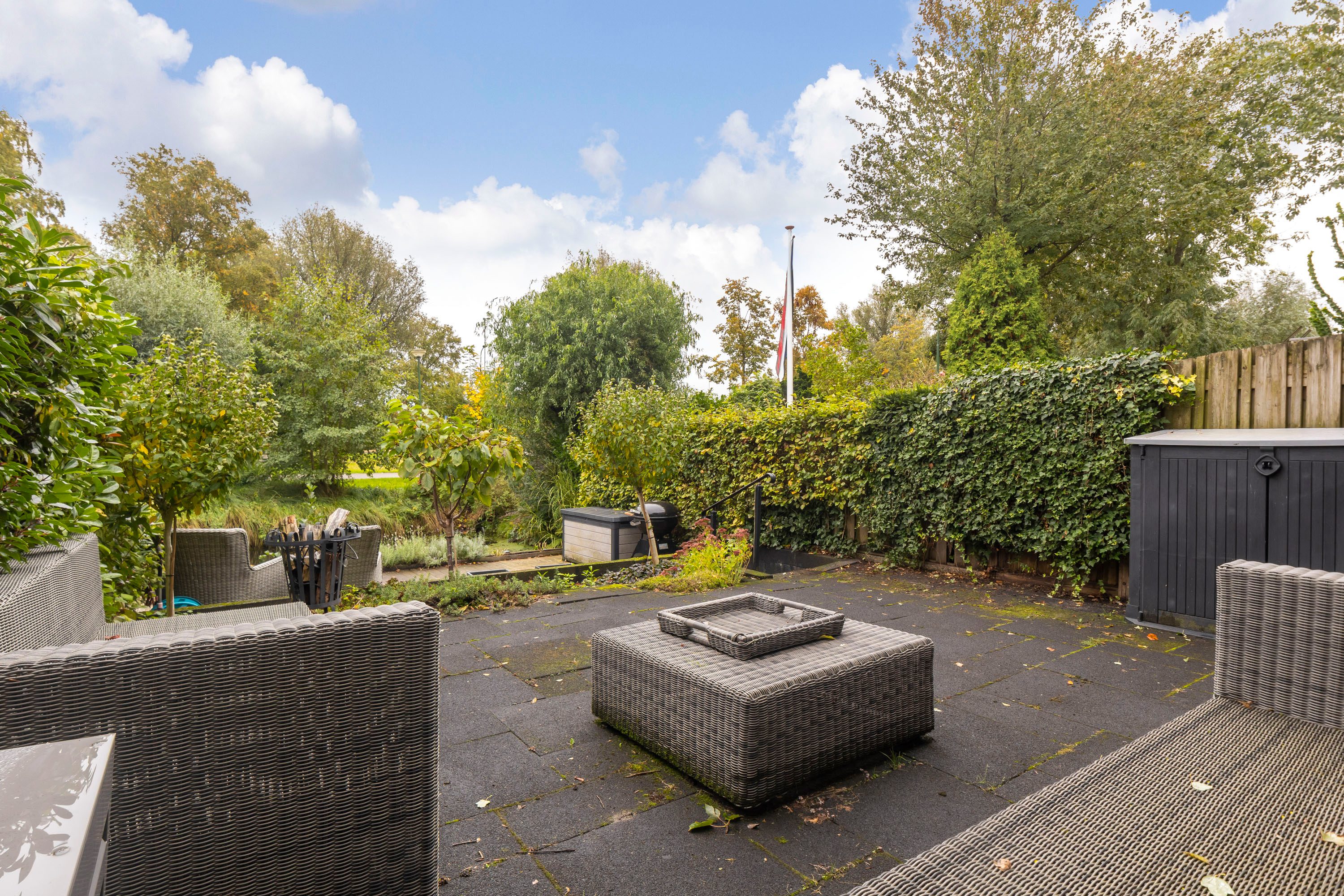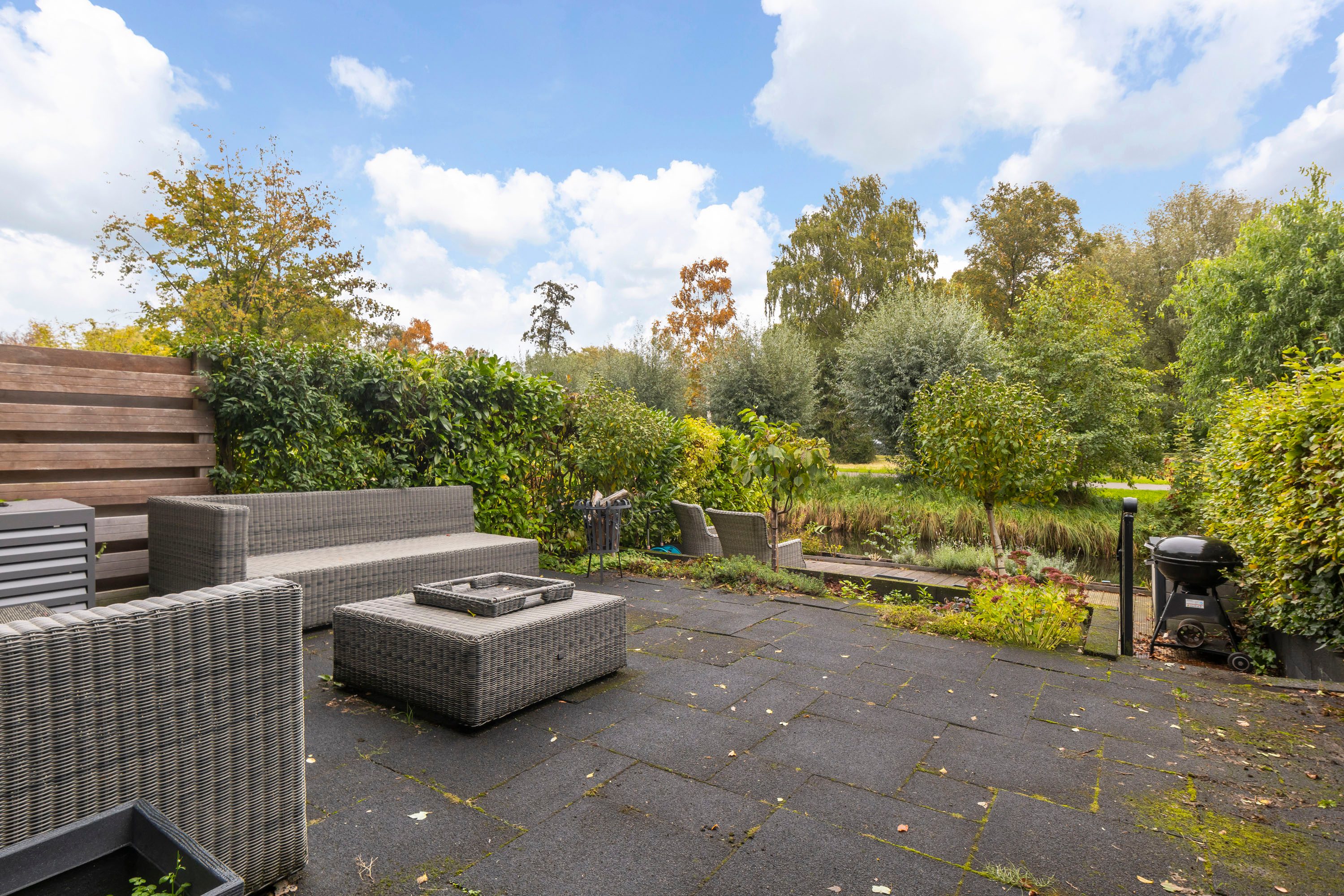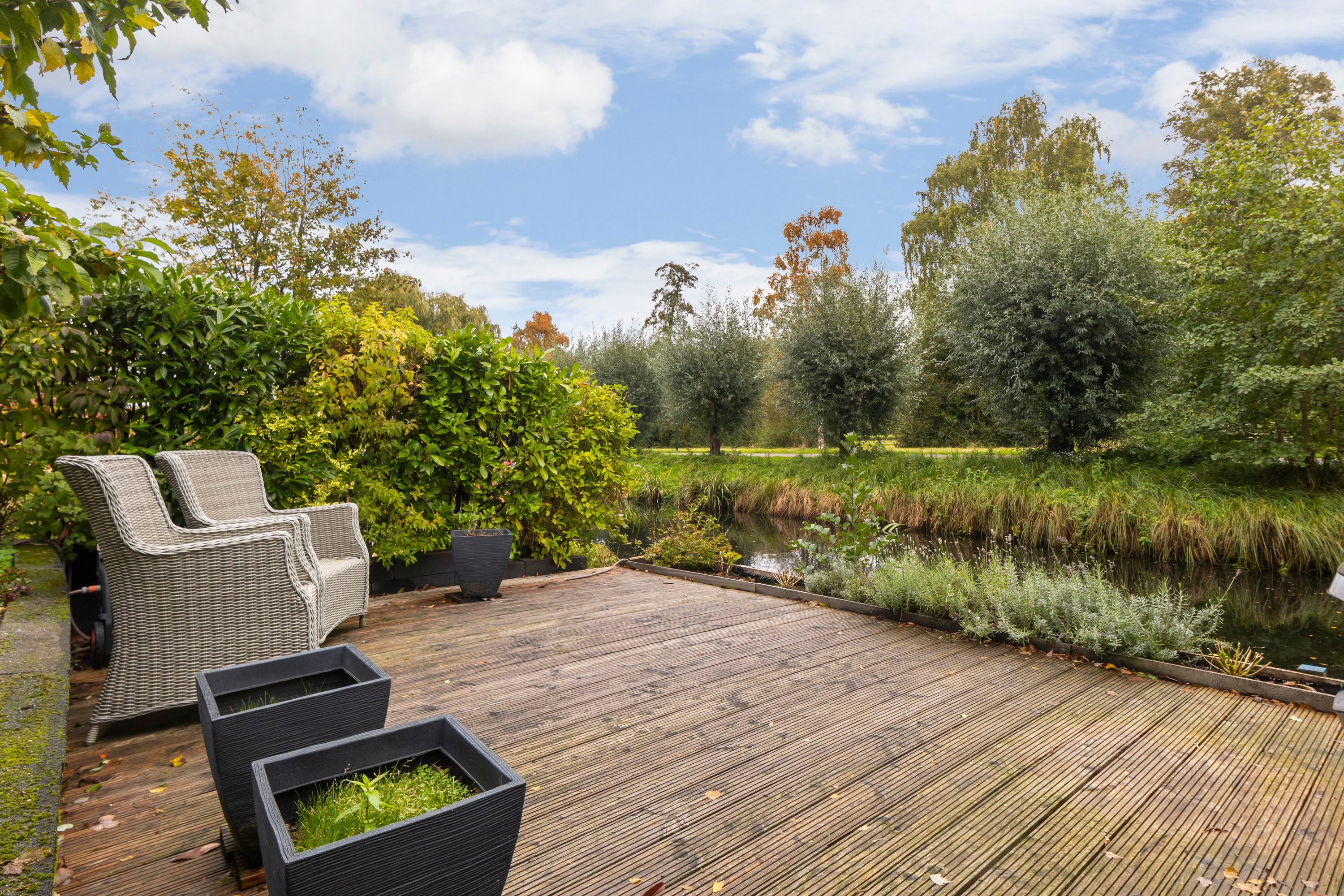 De fraai aangelegde tuin (58 m²) ligt op het oosten en grenst direct aan het water – een heerlijke plek om te ontspannen en te genieten van de zon. Er is voldoende ruimte voor een loungehoek en een eettafel om gezellig buiten te zitten. Hier ervaar je iedere dag het vakantiegevoel aan huis.
