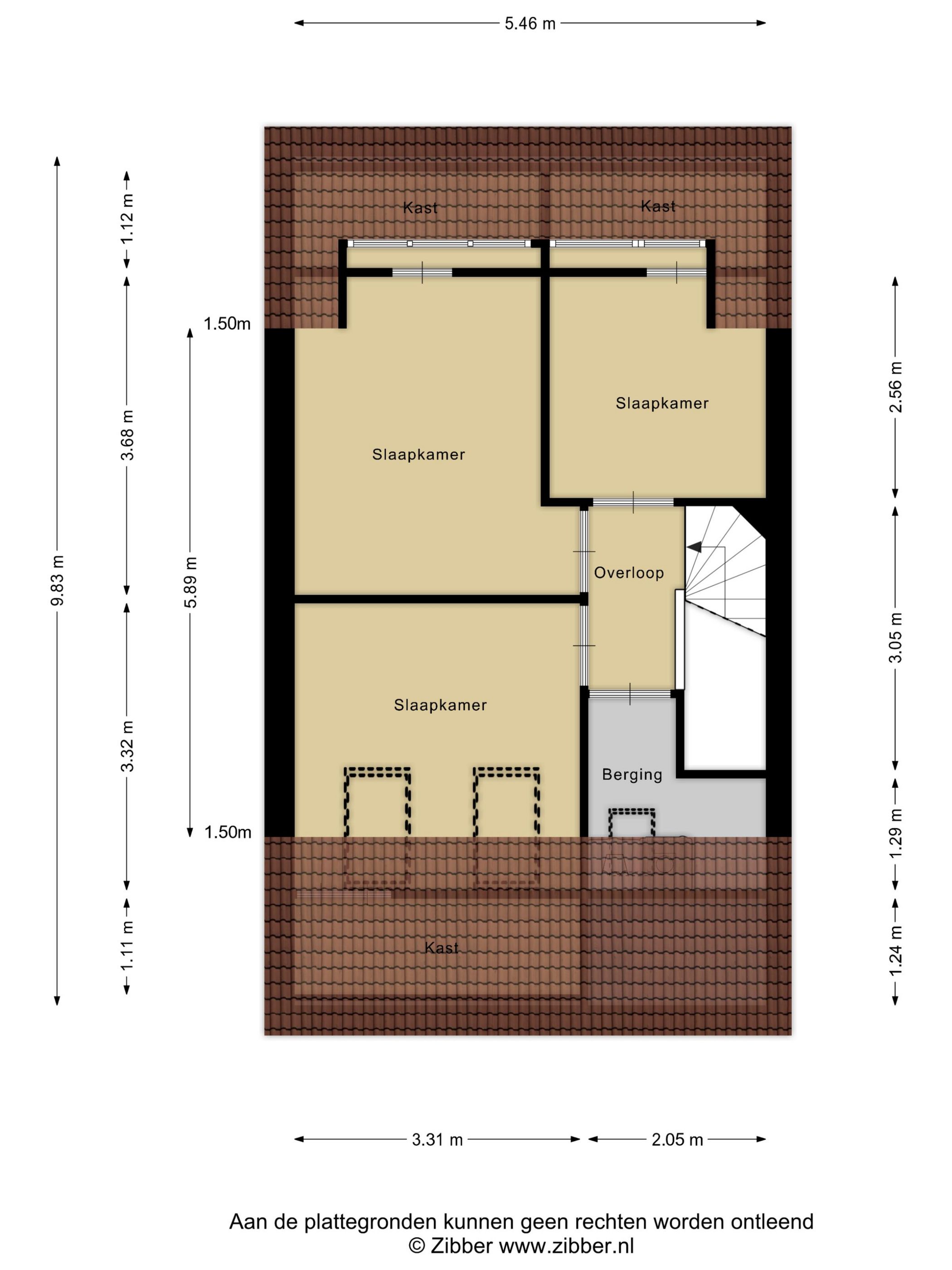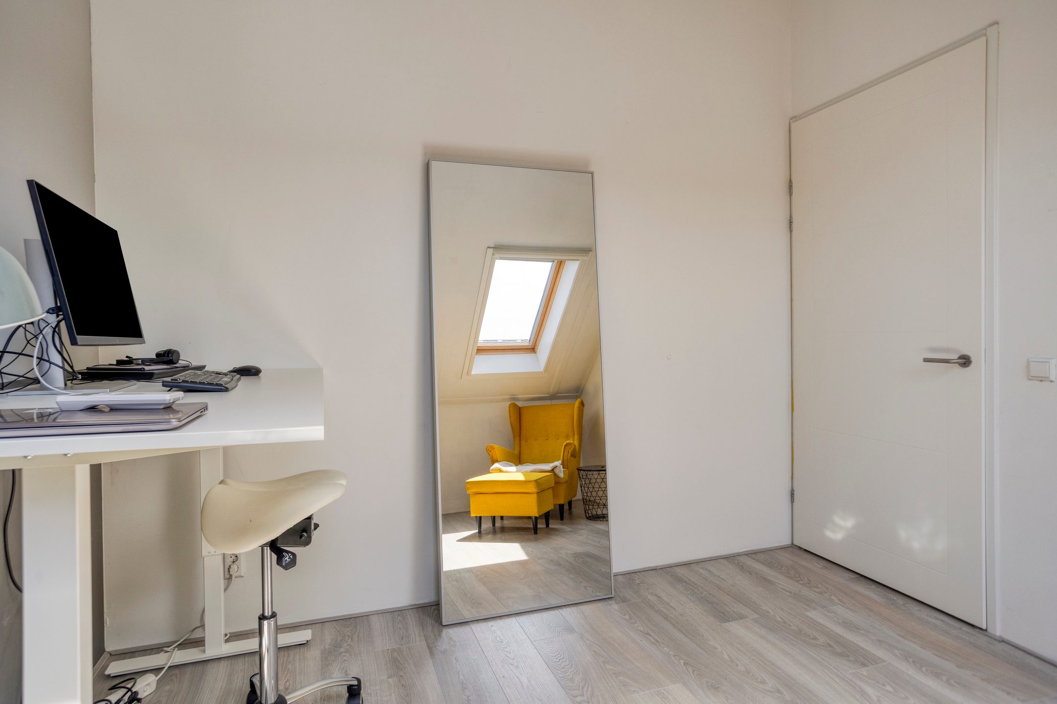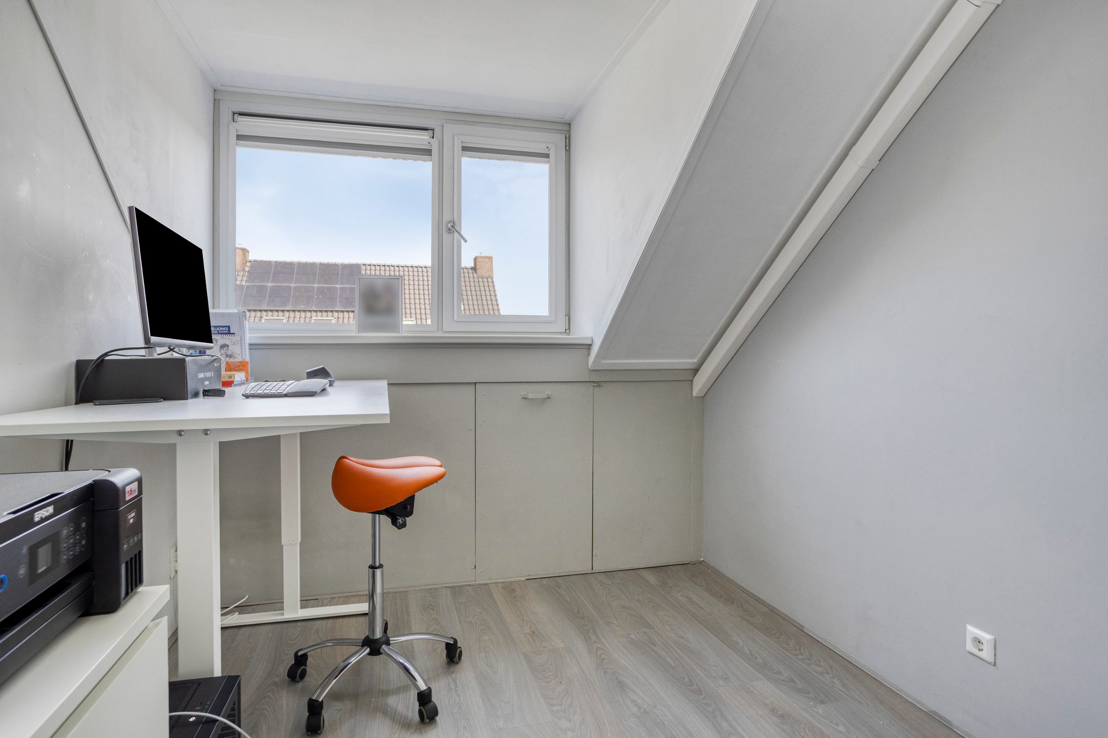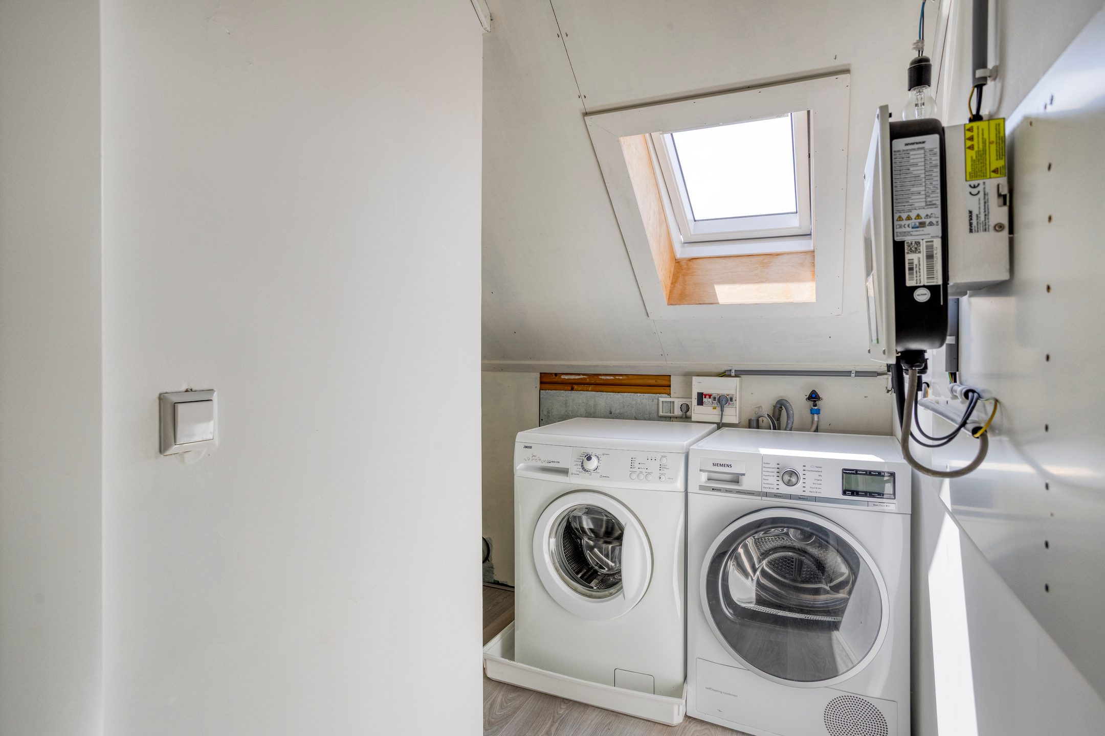 De zolder is bereikbaar via een vaste trap en biedt drie extra kamers, met afmetingen van 8,7 m², 10,6 m² en 6 m². Twee van deze kamers wordt momenteel gebruikt als werkkamer. Daarnaast bevinden zich op deze verdieping de aansluitingen voor de wasmachine en droger. De zolder is voorzien van een combinatie van een dakkapel en dakramen, wat zorgt voor volop daglicht.