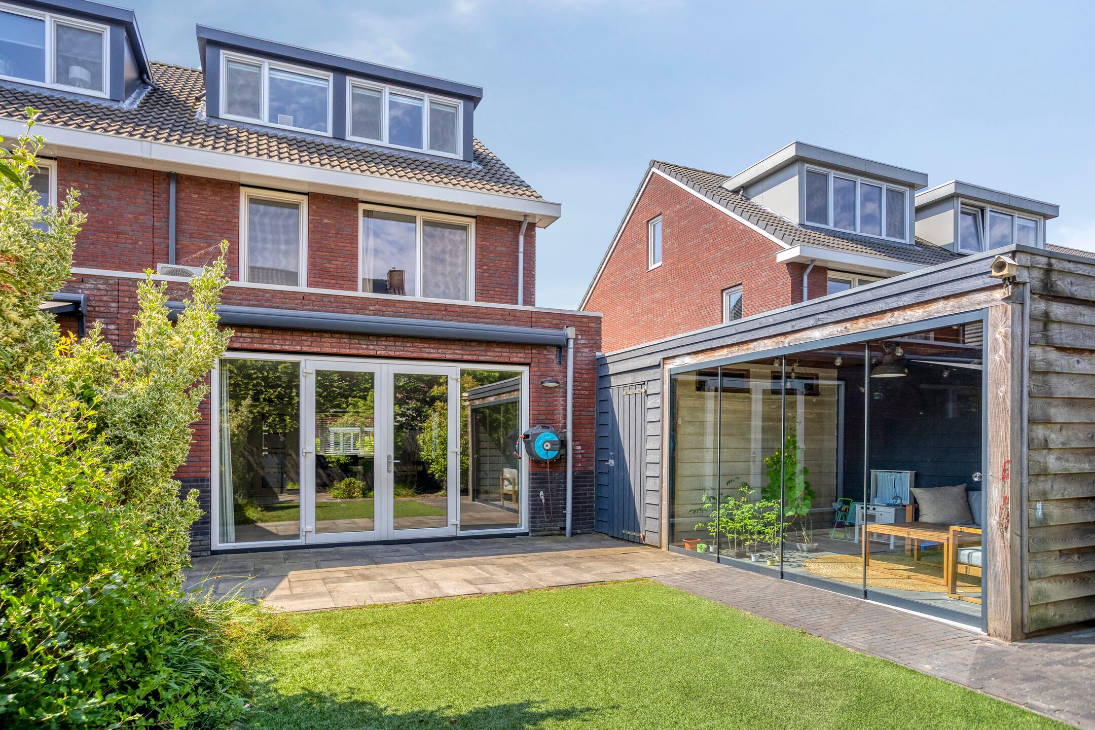 De fraai aangelegde tuin is gelegen op het oosten, wat betekent dat je in de ochtend en vroege middag kunt genieten van heerlijk zonlicht. De tuin is voorzien van diverse groenstroken en beplanting. Verder is er een sfeervolle veranda, ideaal om 's avonds buiten te zitten of te dineren, ongeacht het weer. Bovendien is de tuin ook eenvoudig bereikbaar via de garage. Deze veelzijdige buitenruimte nodigt uit om te ontspannen en te genieten van privacy.