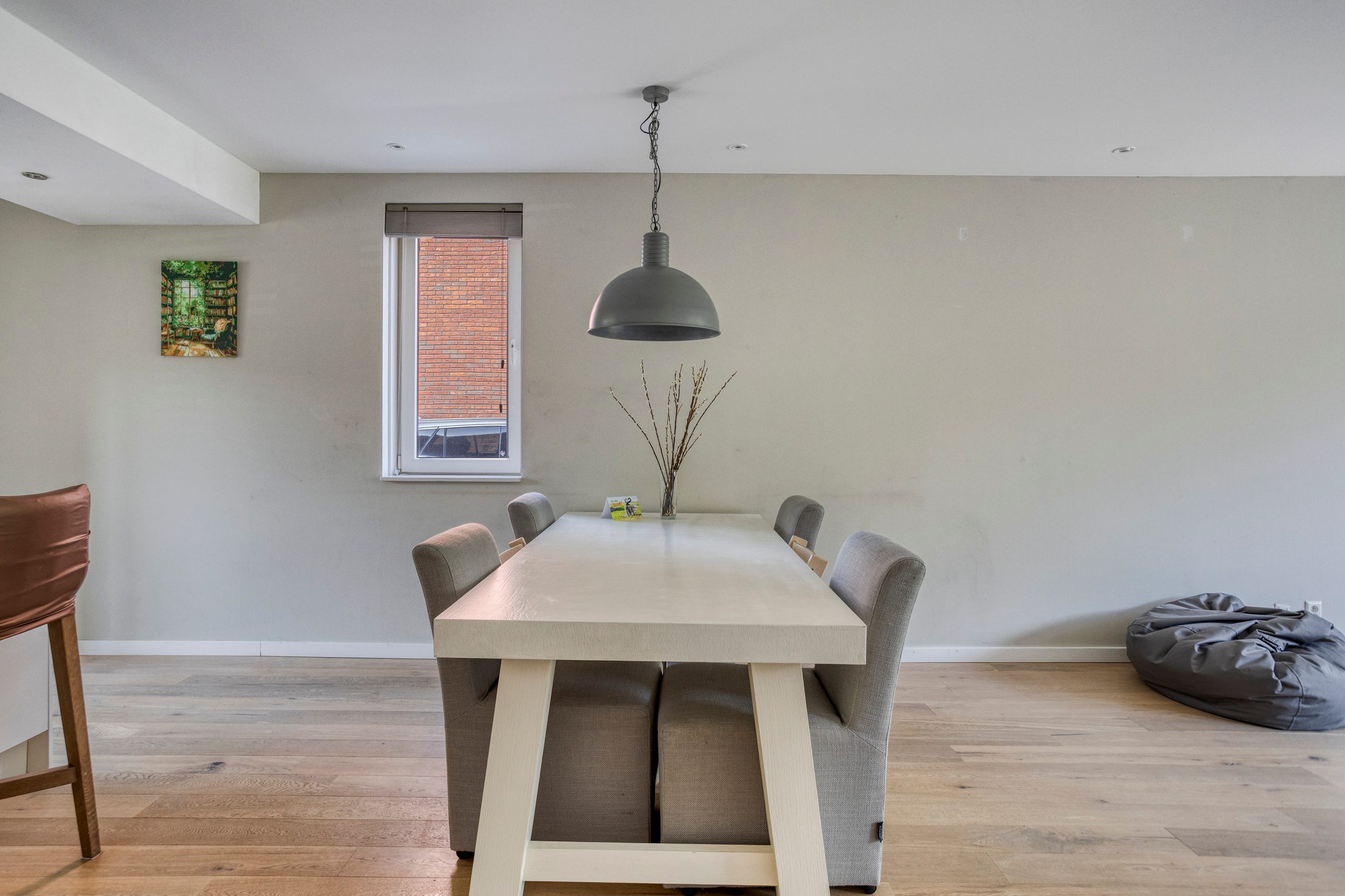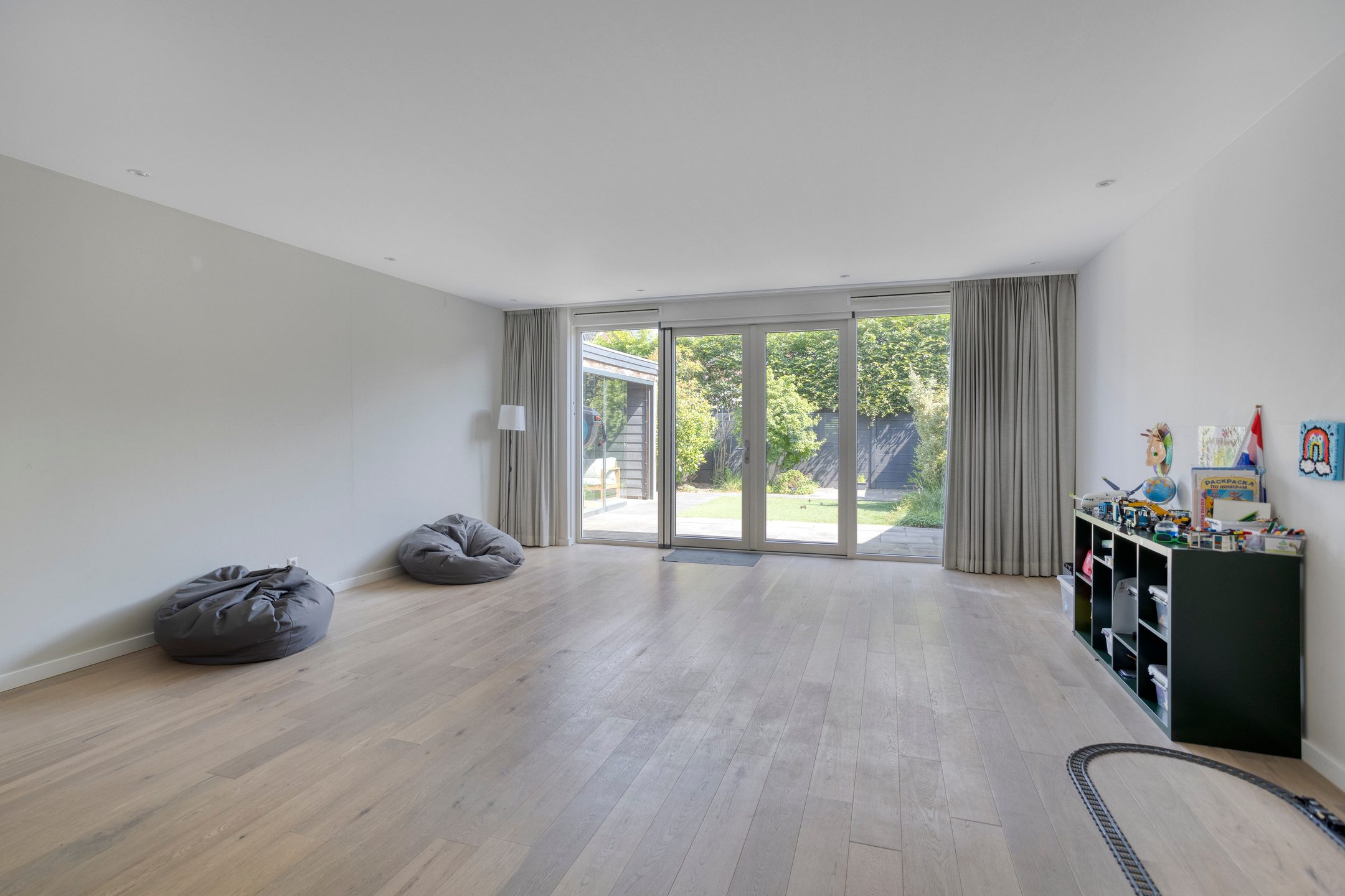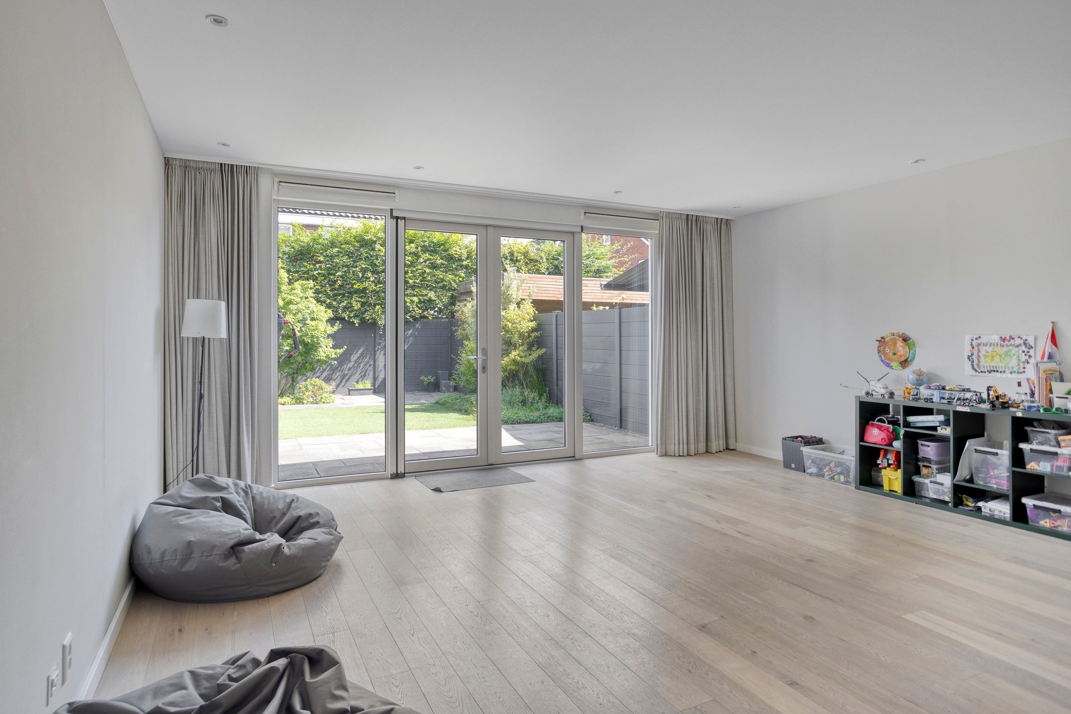 Via de entree, waar zich de meterkast en een modern toilet bevinden, betreed je de sfeervolle woonkamer. De woonkamer is ruim opgezet en wordt gekenmerkt door een grote glazen pui, die niet alleen zorgt voor een prachtig natuurlijk lichtinval, maar ook directe toegang biedt tot de achtertuin. Het strakke plafond is voorzien van inbouwverlichting, wat bijdraagt aan een moderne en afgewerkte uitstraling.