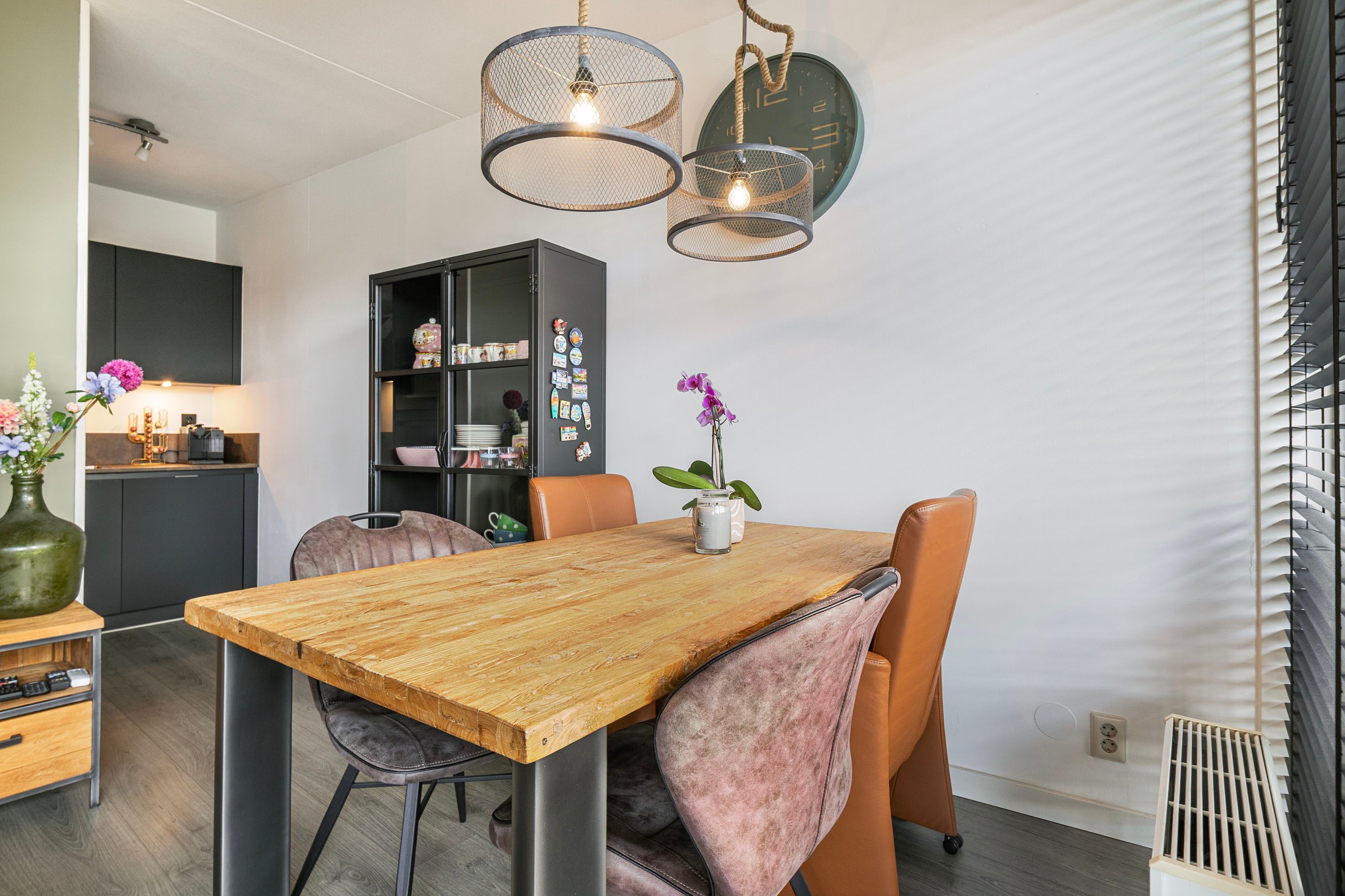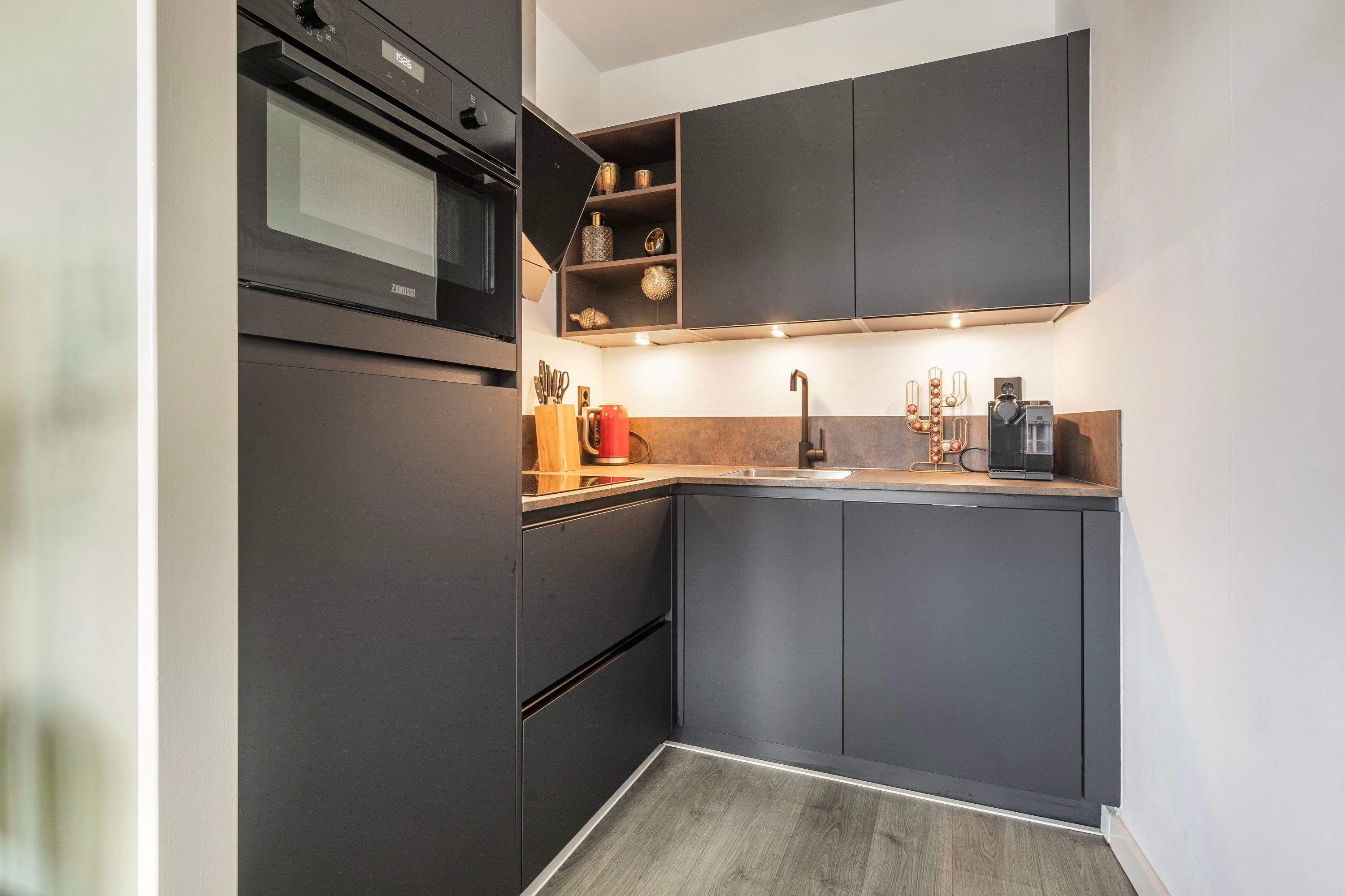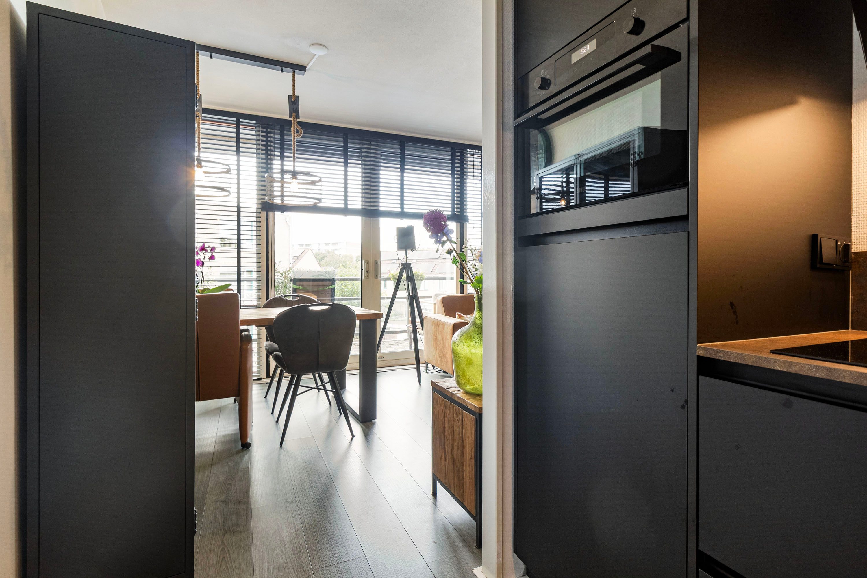 Via de ruime entree, waar tevens de meterkast bevindt, kom je in de lichte woonkamer terecht. Dankzij de grote raampartij aan de achterzijde beschikt de ruimte over genoeg natuurlijk licht. Er is volop plek voor een comfortabele hoekbank en een tv-meubel. Het aangrenzende eetgedeelte biedt voldoende ruimte voor een ruime eettafel. Vanuit deze zone bereik je de L-vormige compacte keuken, uitgevoerd in mat zwart met een licht werkblad. De moderne keuken uit 2022 is uitgerust met diverse inbouwapparatuur, zoals een kookplaat, afzuigkap, combi-oven, koelkast en vaatwasser.