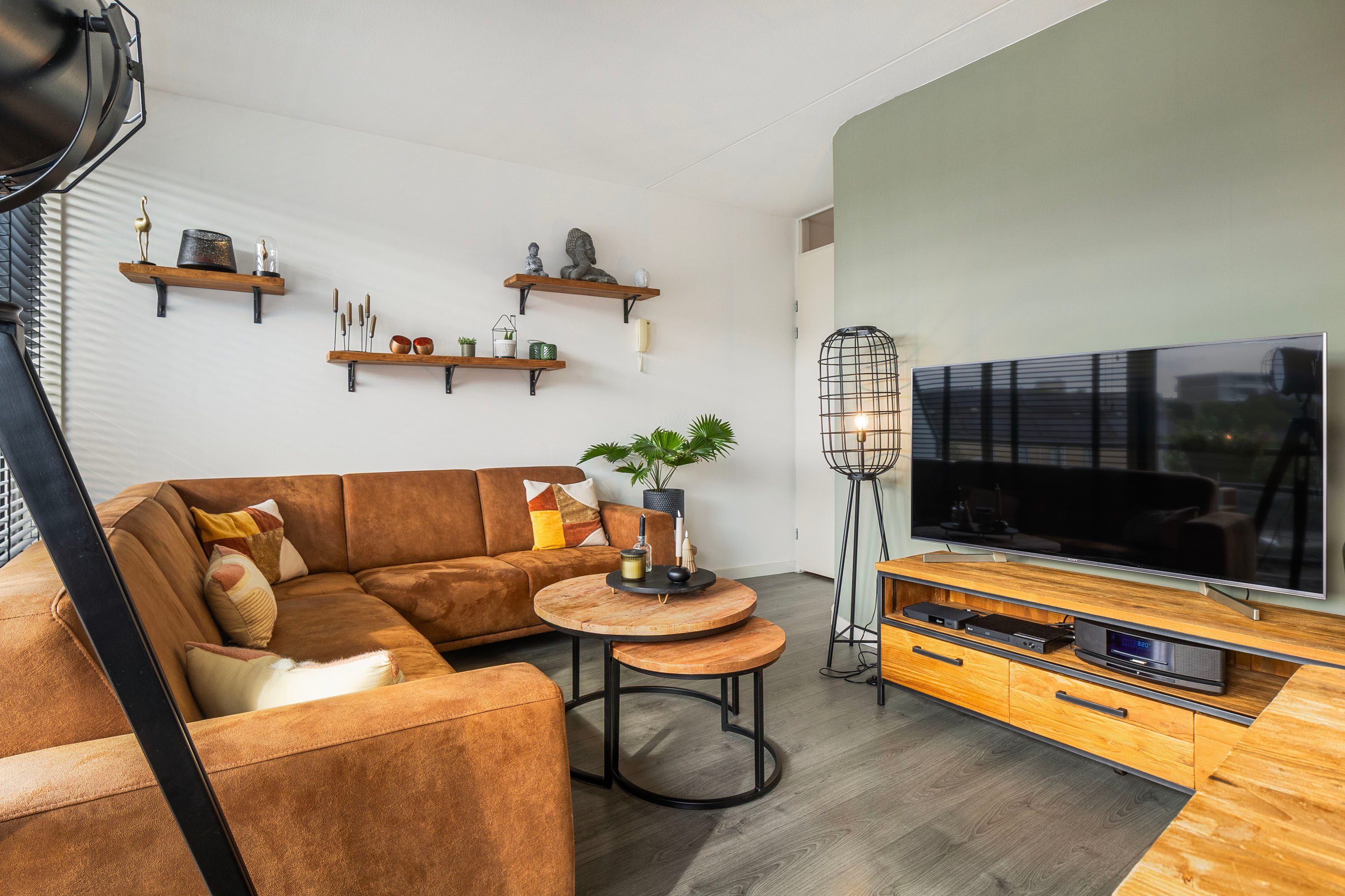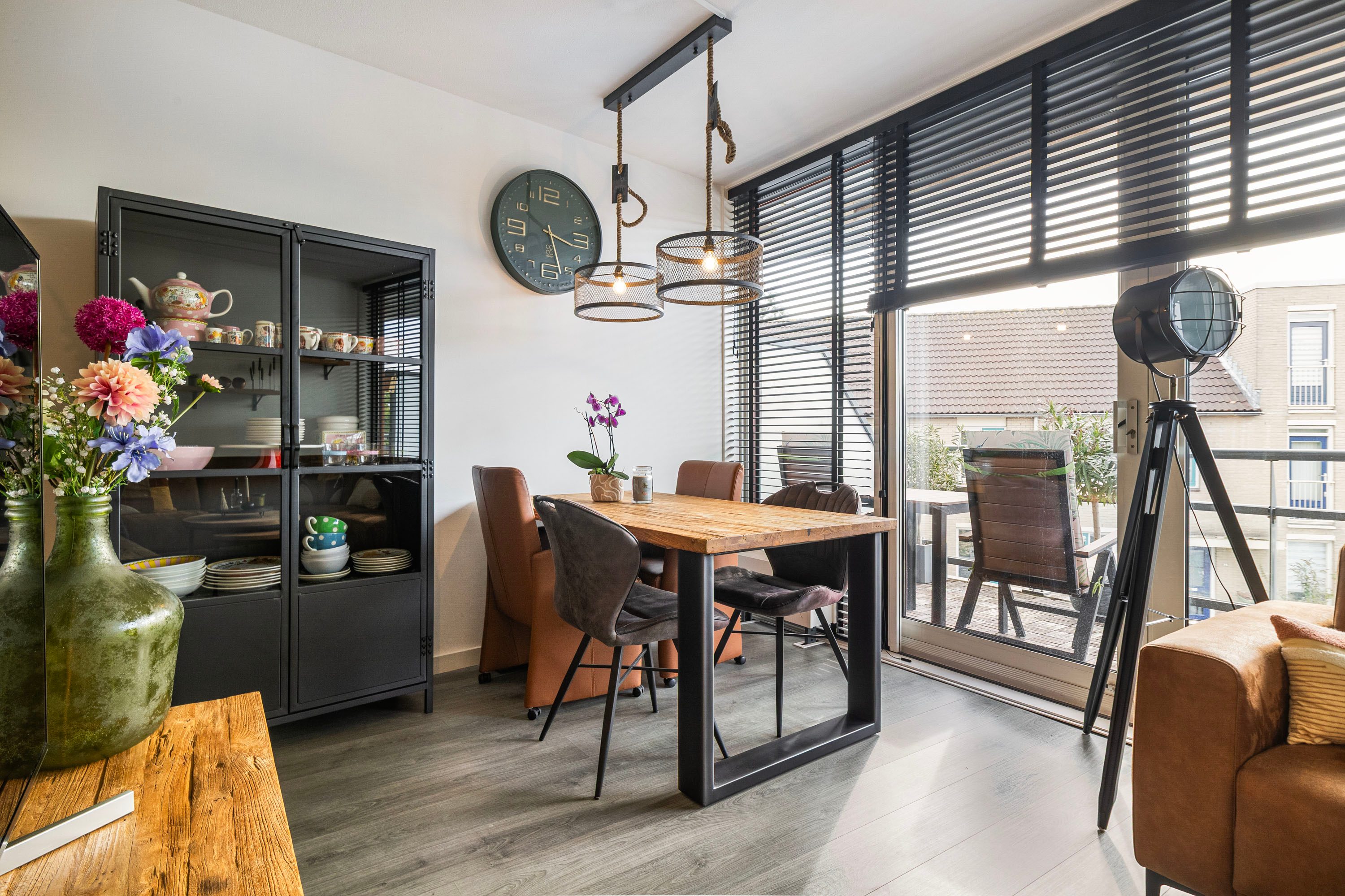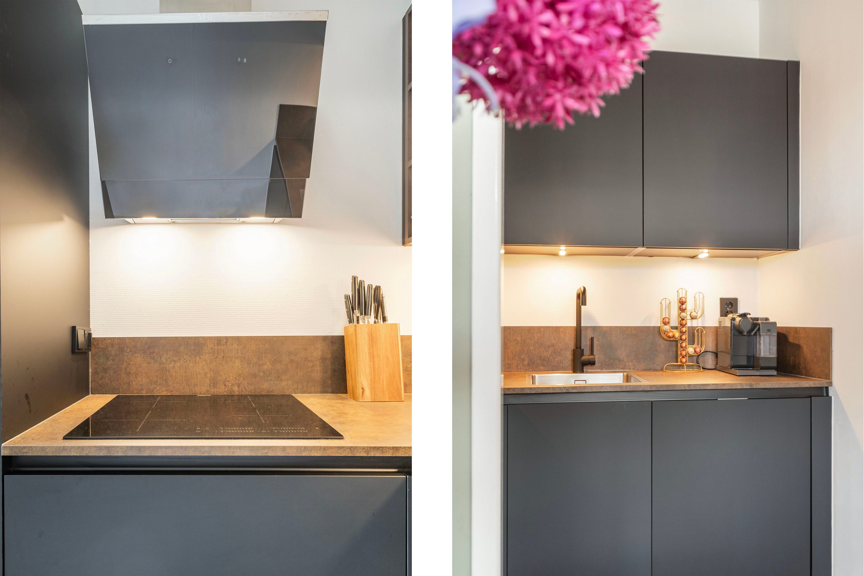 Via de ruime entree, waar tevens de meterkast bevindt, kom je in de lichte woonkamer terecht. Dankzij de grote raampartij aan de achterzijde beschikt de ruimte over genoeg natuurlijk licht. Er is volop plek voor een comfortabele hoekbank en een tv-meubel. Het aangrenzende eetgedeelte biedt voldoende ruimte voor een ruime eettafel. Vanuit deze zone bereik je de L-vormige compacte keuken, uitgevoerd in mat zwart met een licht werkblad. De moderne keuken uit 2022 is uitgerust met diverse inbouwapparatuur, zoals een kookplaat, afzuigkap, combi-oven, koelkast en vaatwasser.