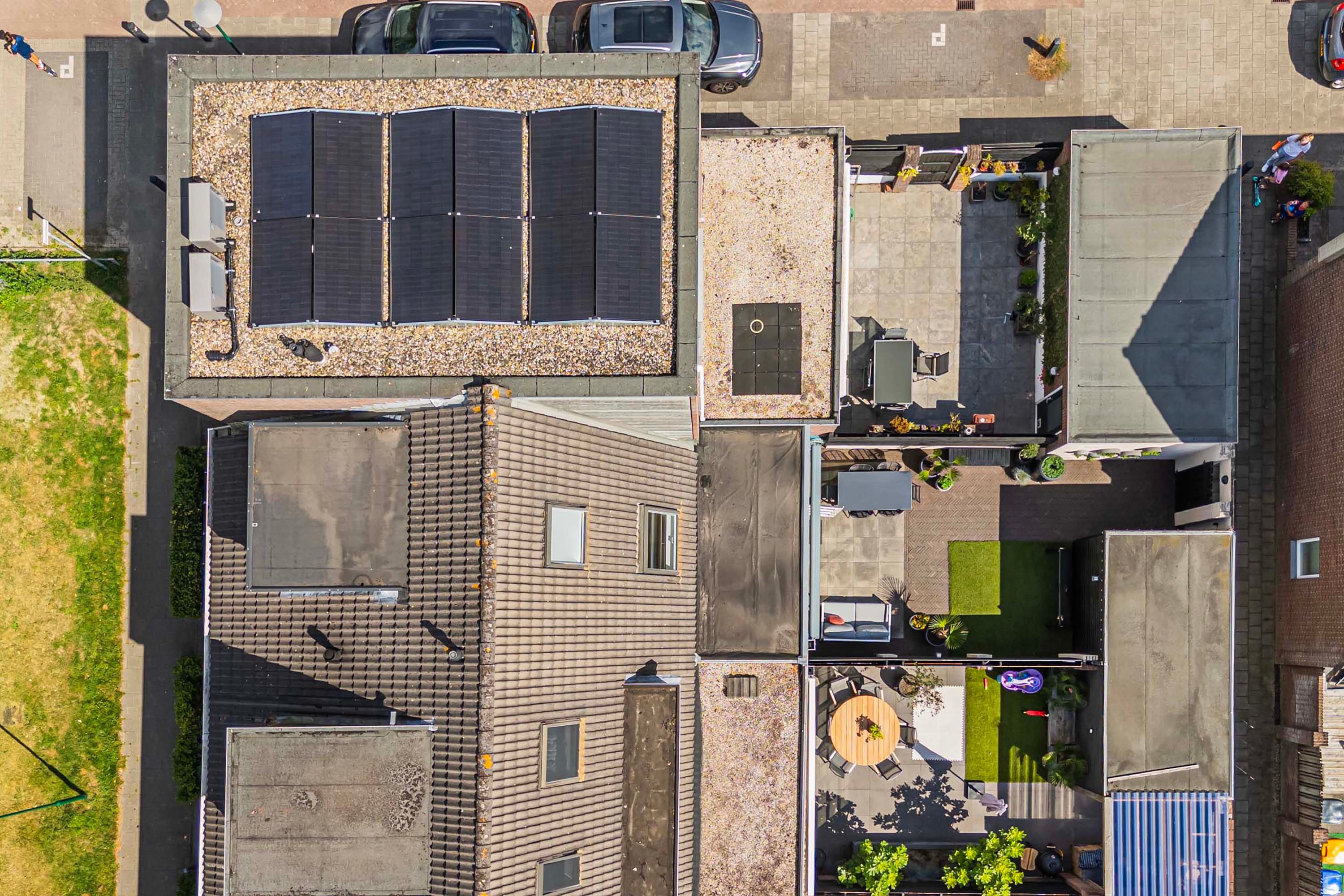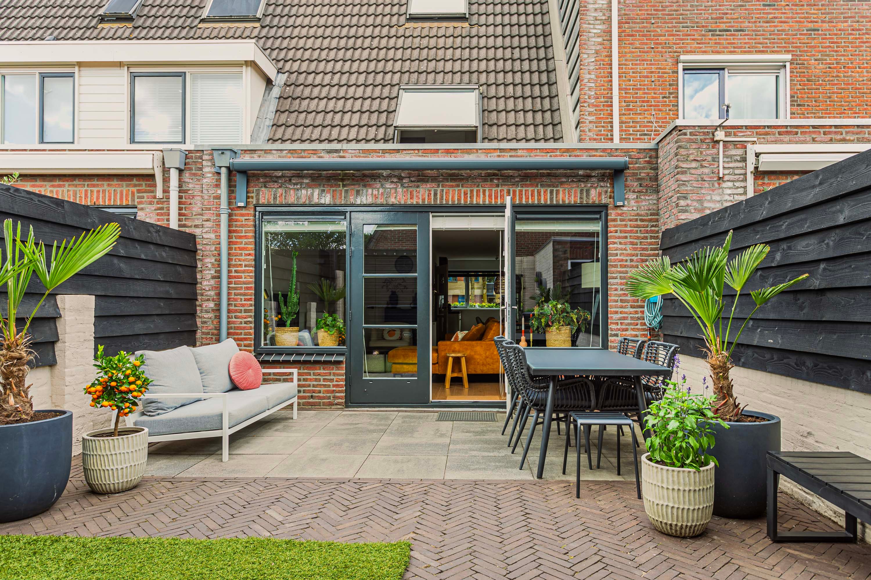 De achtertuin is onderhoudsvriendelijk aangelegd met een combinatie van grote tegels, waaltjes en kunstgras. Aan beide zijden van de tuin zijn erfafscheidingen geplaatst, bestaande uit een mix van steen en houten planken. Verschillende zithoeken zorgen voor een gezellige en uitnodigende sfeer. Achterin de tuin vind je een praktische houten berging en een poort die toegang biedt tot het achterpad.