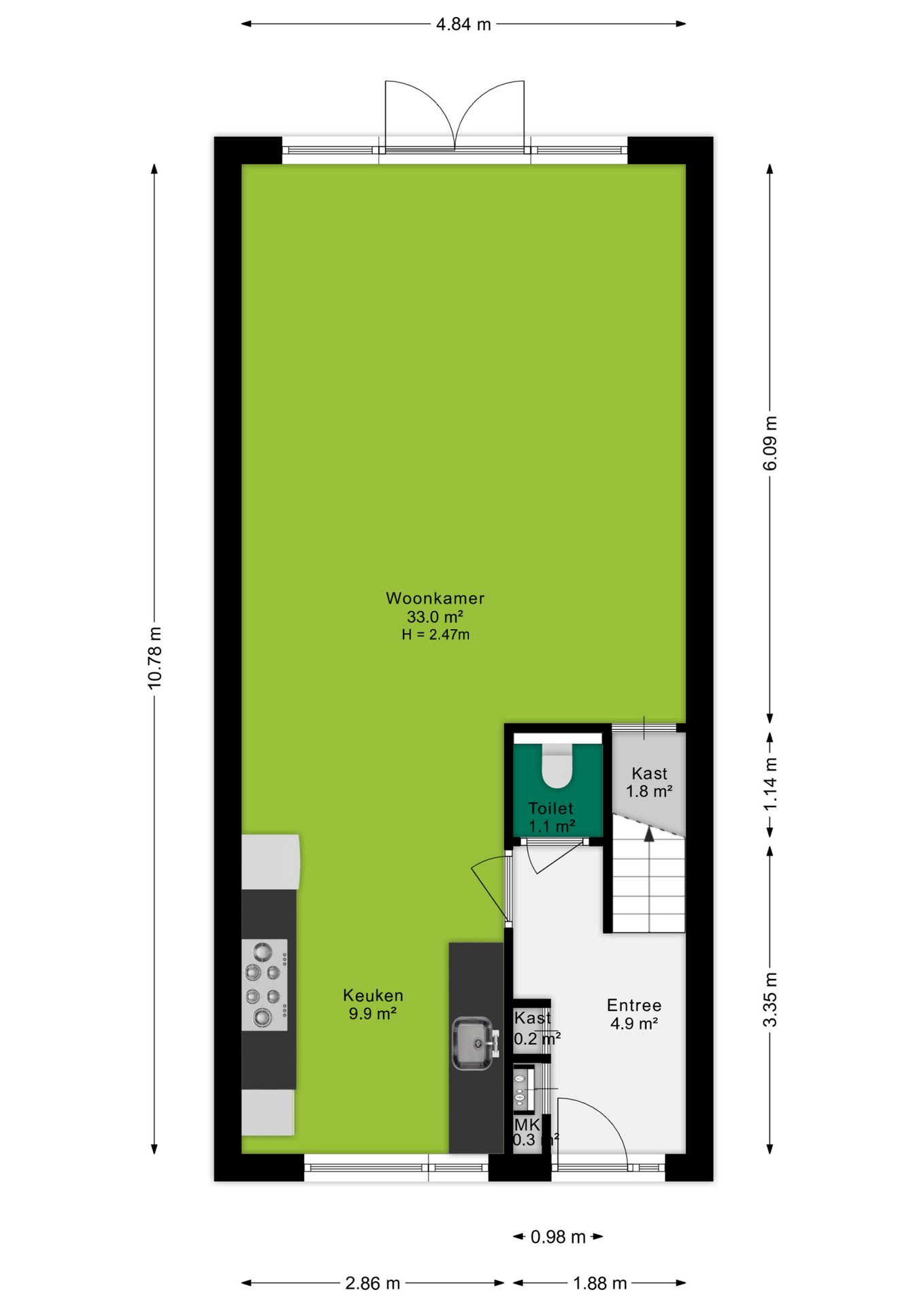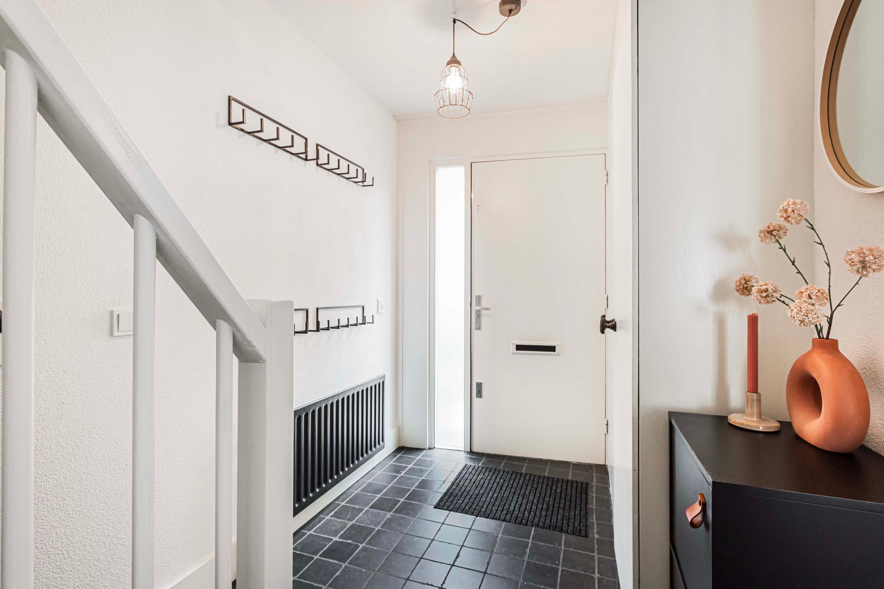 Bij binnenkomst in de hal vind je de meterkast, garderobe, een moderne toiletruimte en de trapopgang naar de eerste verdieping. Vanuit de hal bereik je via een deur zowel de keuken als de woonkamer.