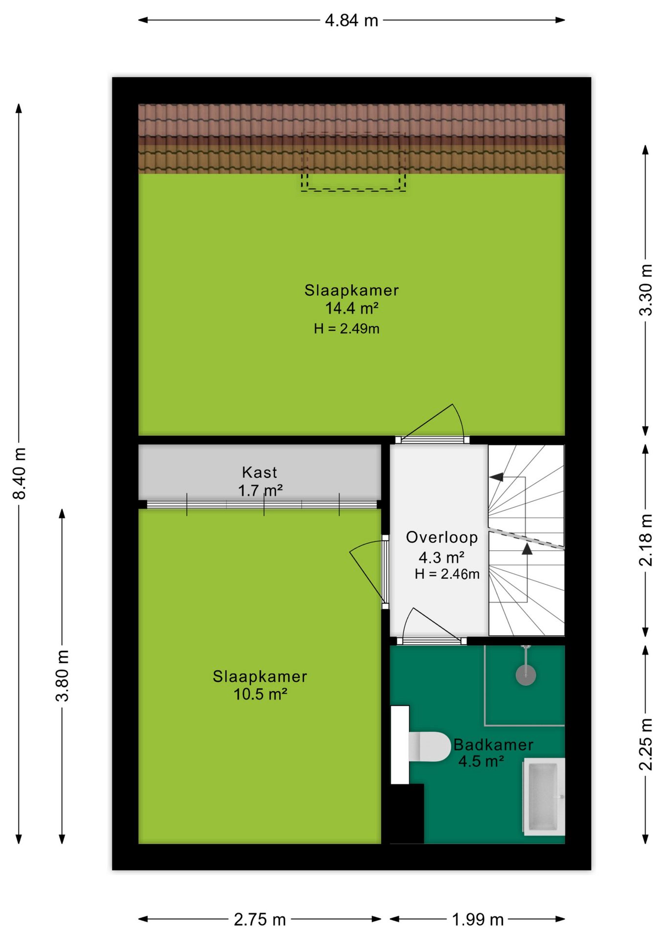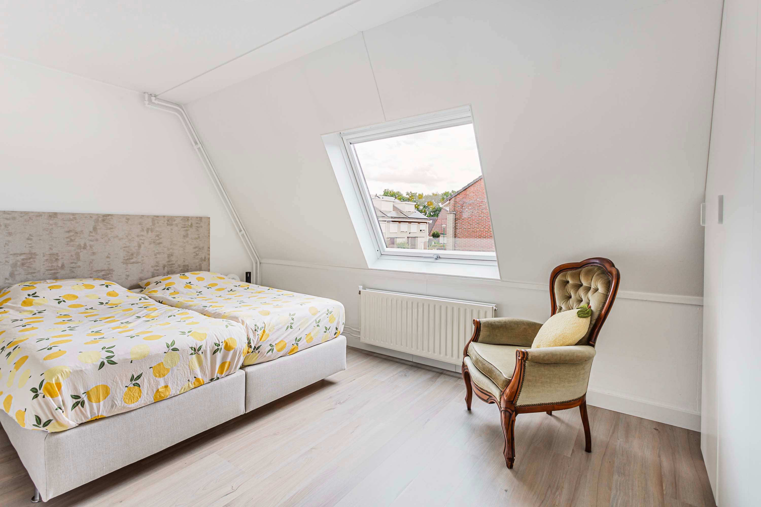 De overloop geeft toegang tot twee ruime slaapkamers. Aan de voorzijde bevindt zich een slaapkamer naast de moderne badkamer, terwijl de royale hoofdslaapkamer aan de achterzijde is gelegen en zich uitstrekt over de volledige breedte van de woning. Deze slaapkamer is tevens voorzien van een op maat gemaakte garderobekastenwand.