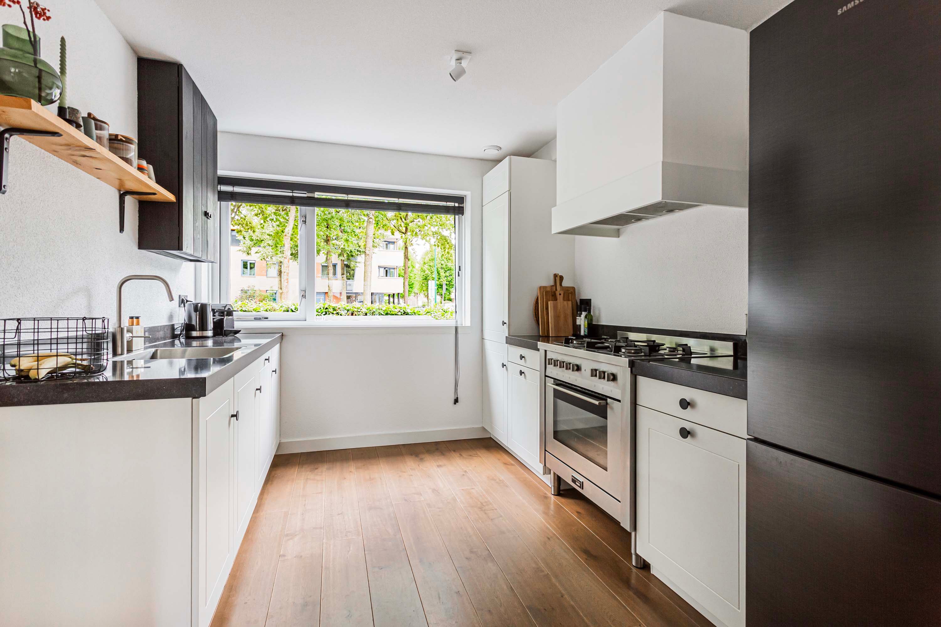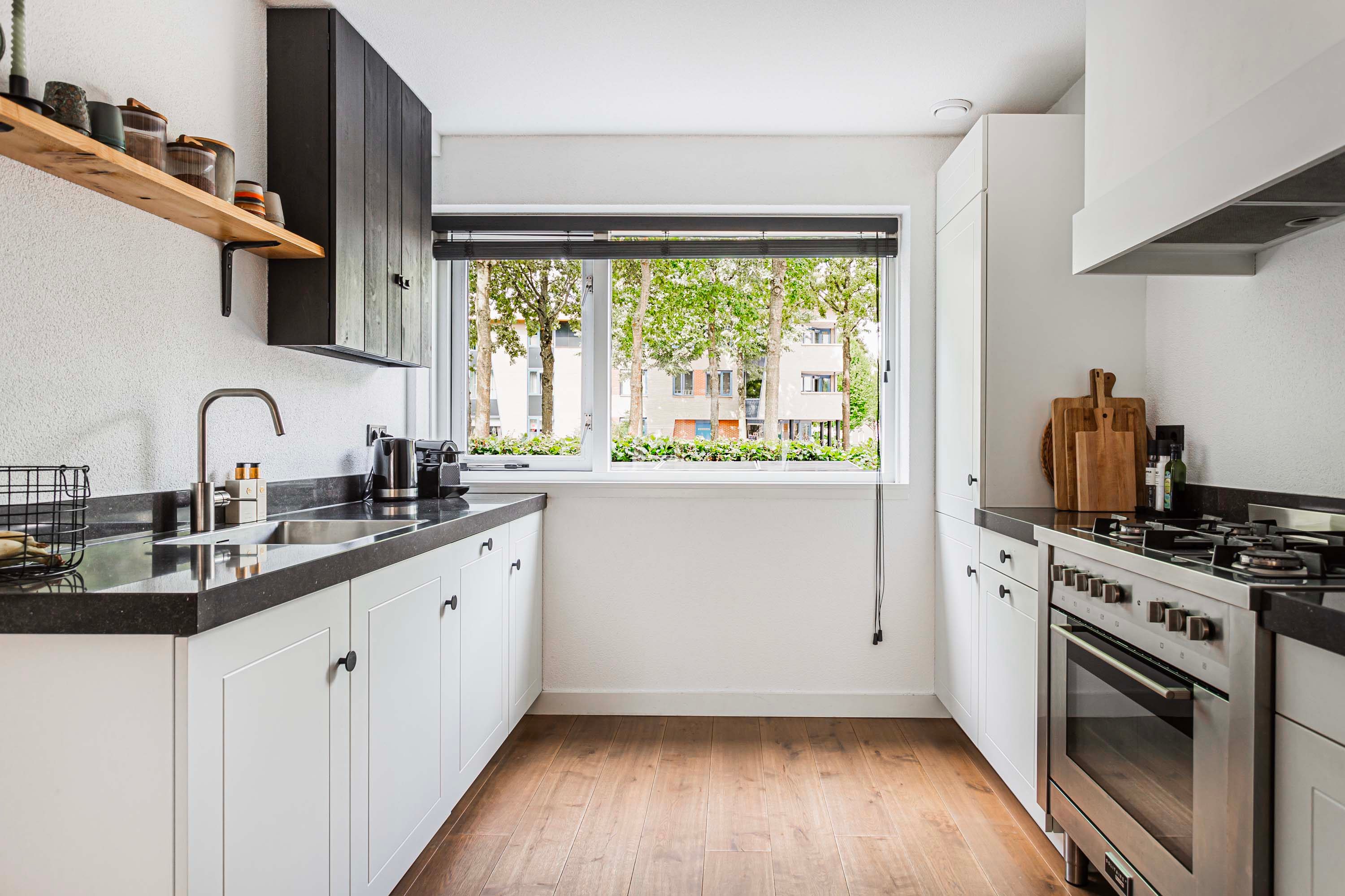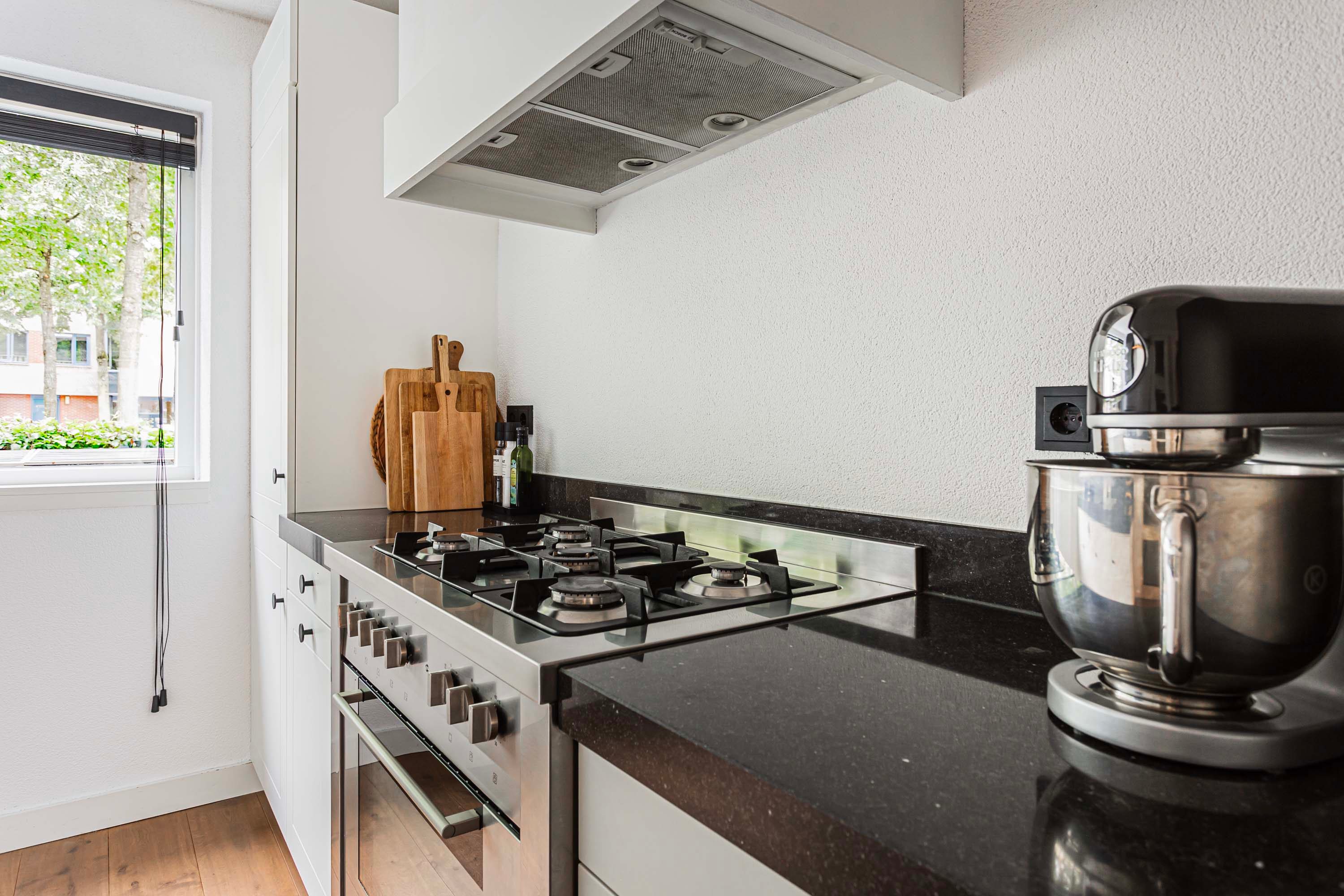 De keuken bevindt zich aan de voorzijde van de woning en is voorzien van granieten werkbladen en hoogwaardige apparatuur, waaronder een RVS 5-pits gasfornuis met oven, een vaatwasser, een afzuigkap en een koel-vriescombinatie.