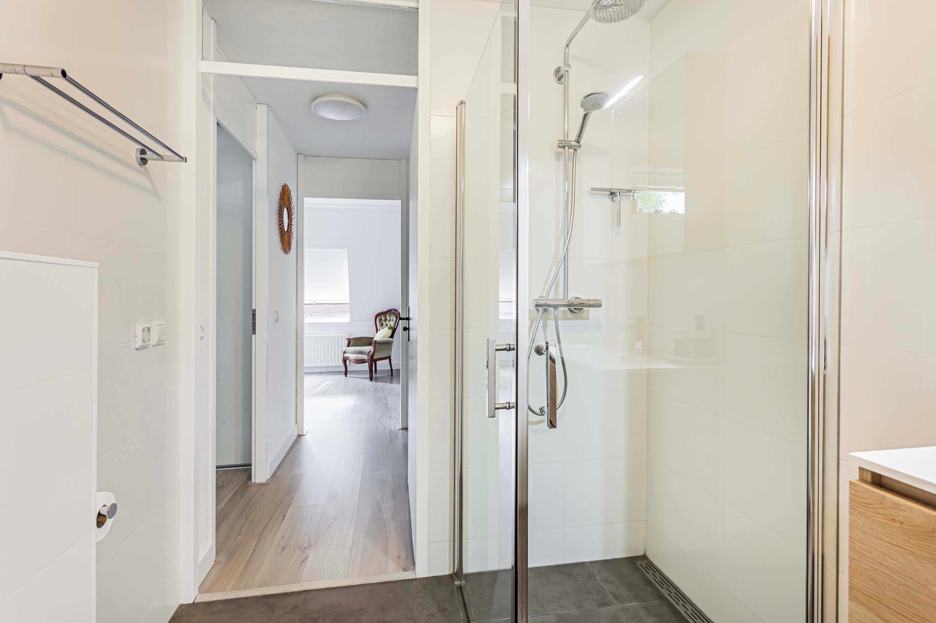 De badkamer is volledig betegeld in een lichte kleurstelling en uitgerust met een inloopdouche, wc, designradiator en een wastafel met meubel en een spiegelkast.