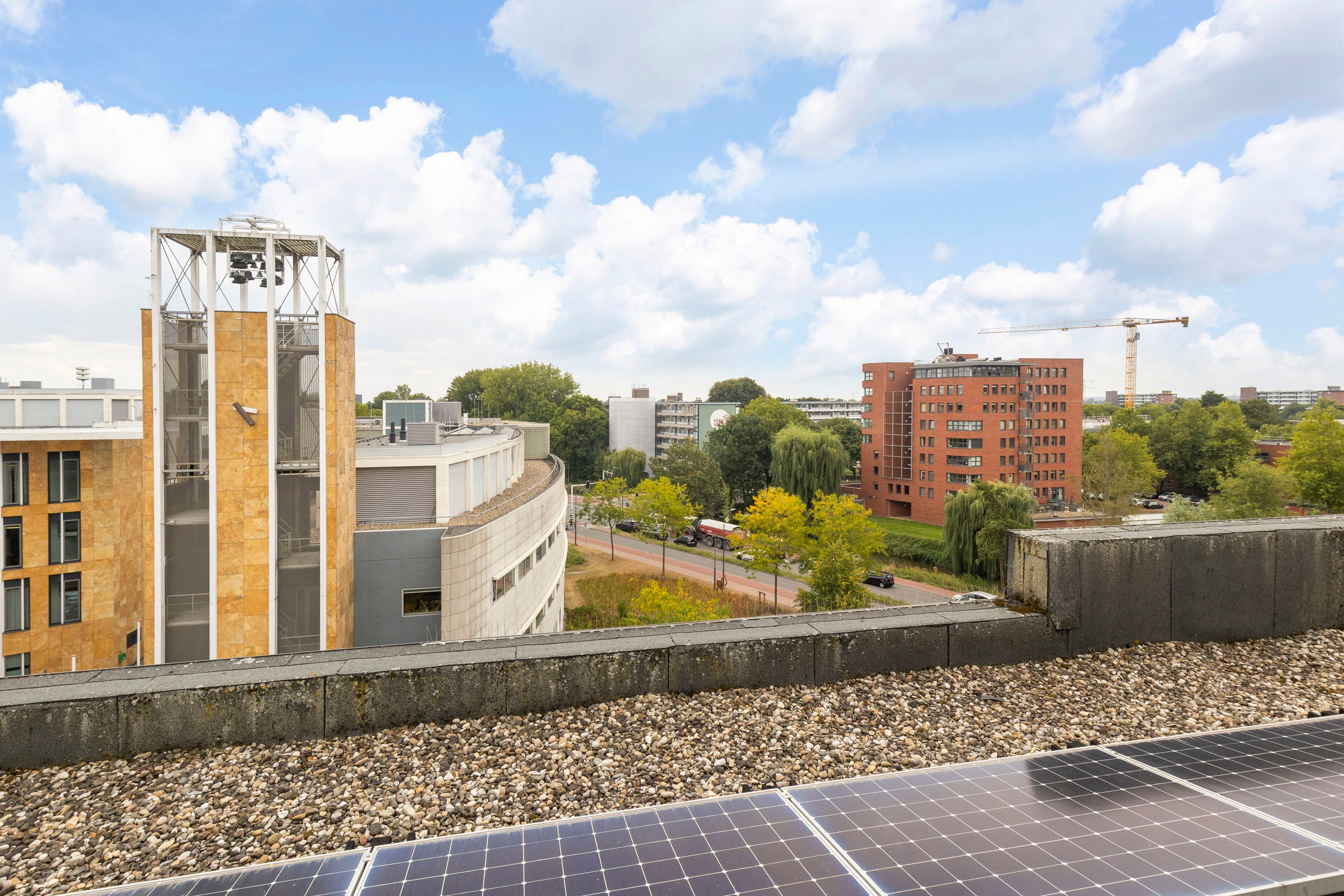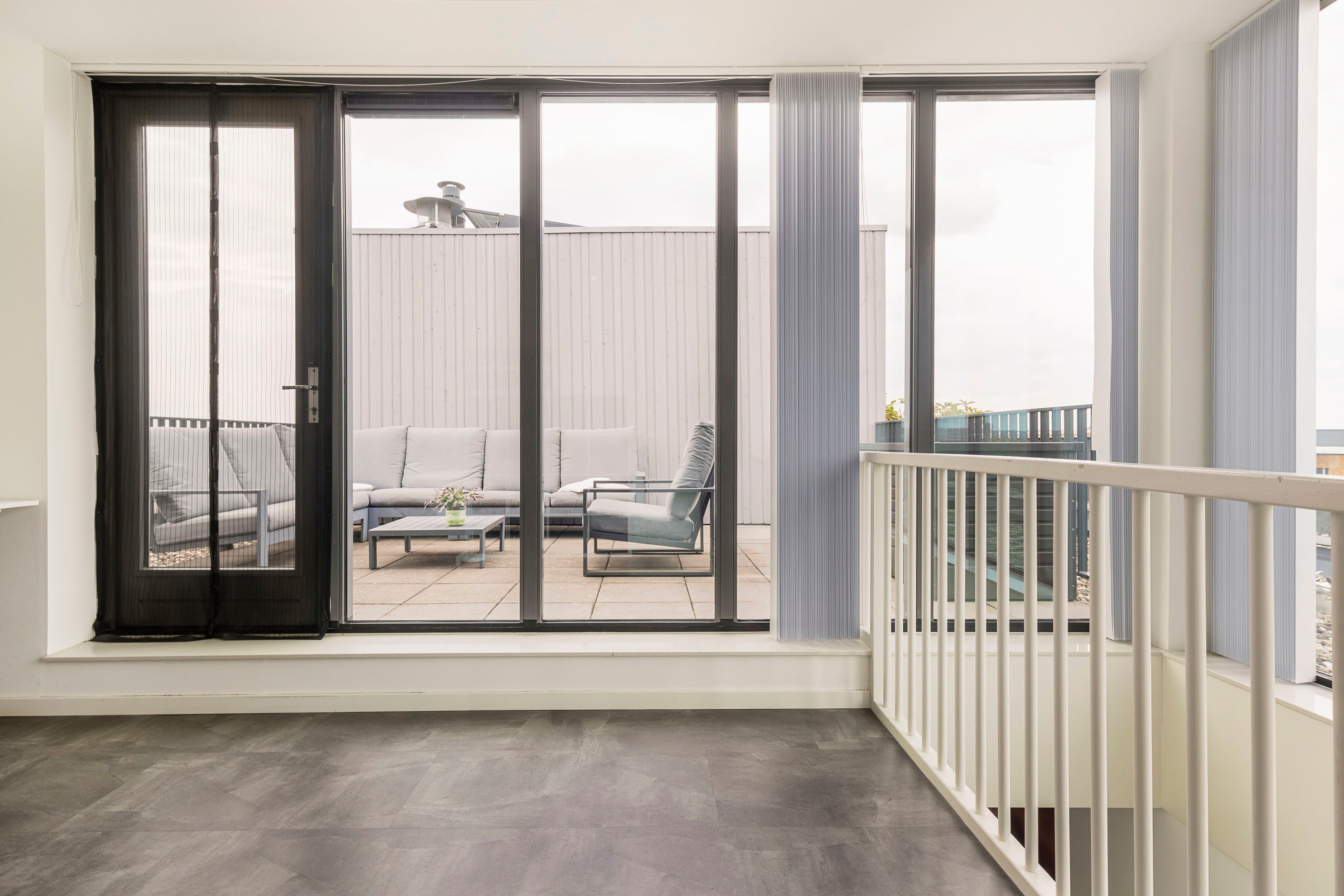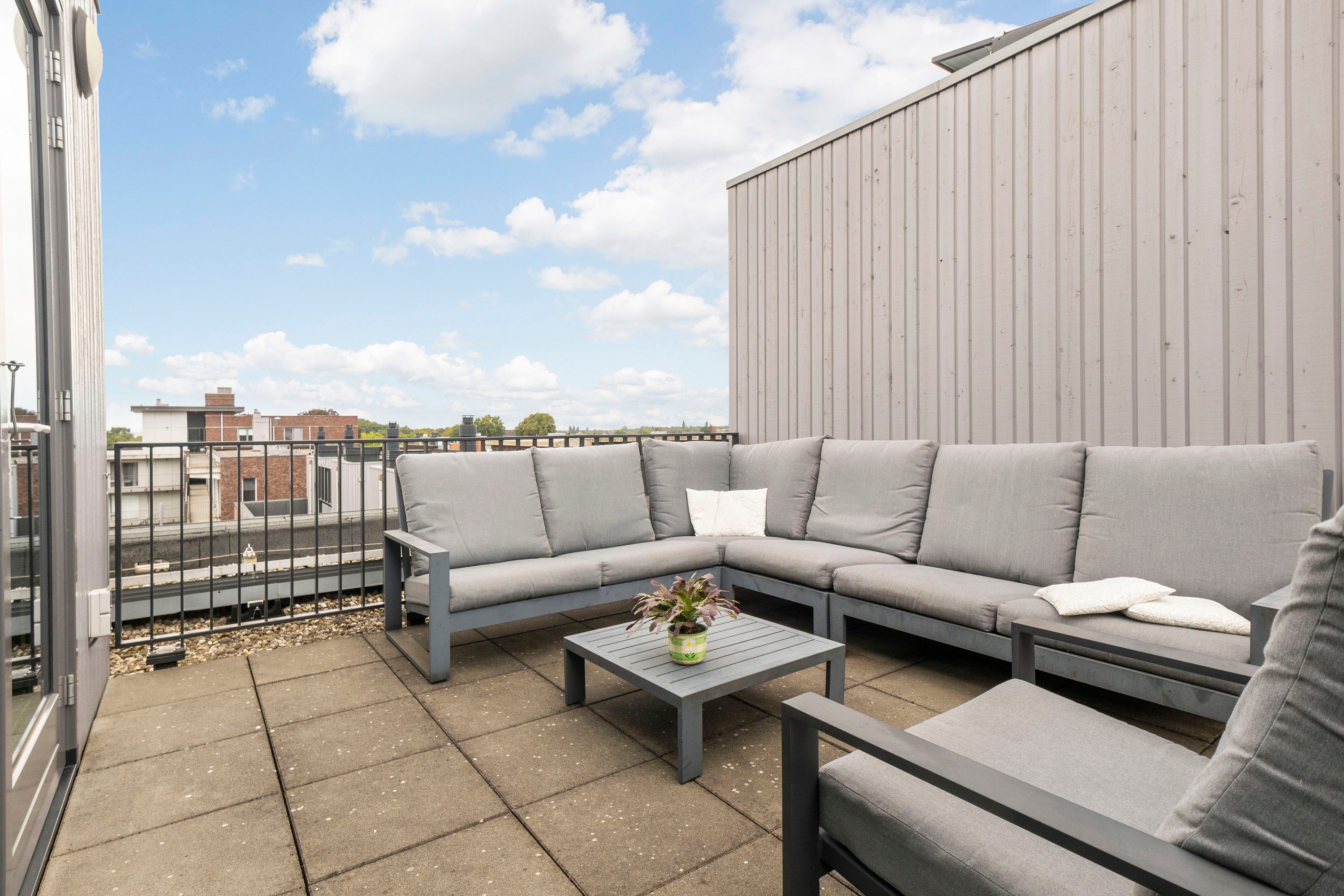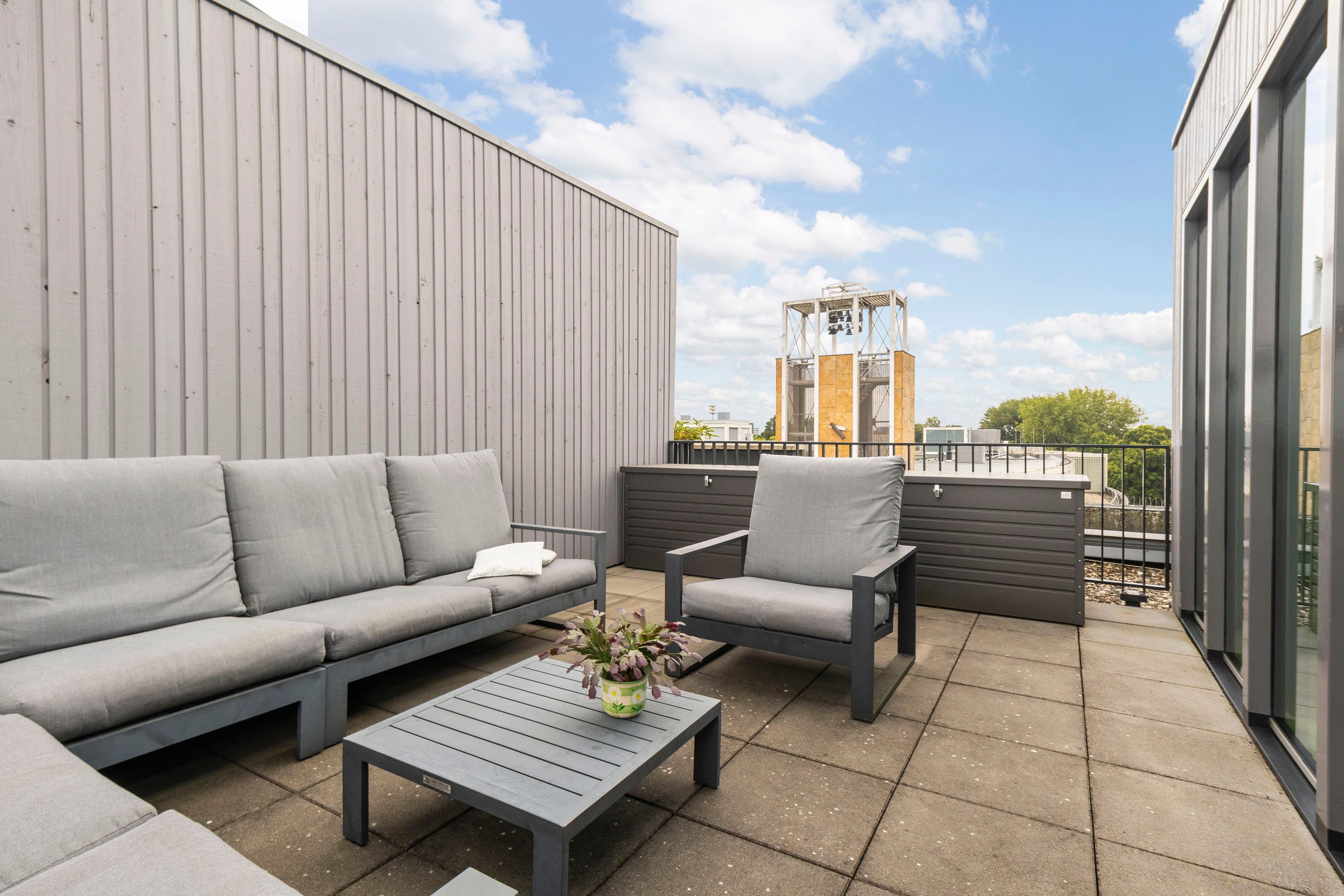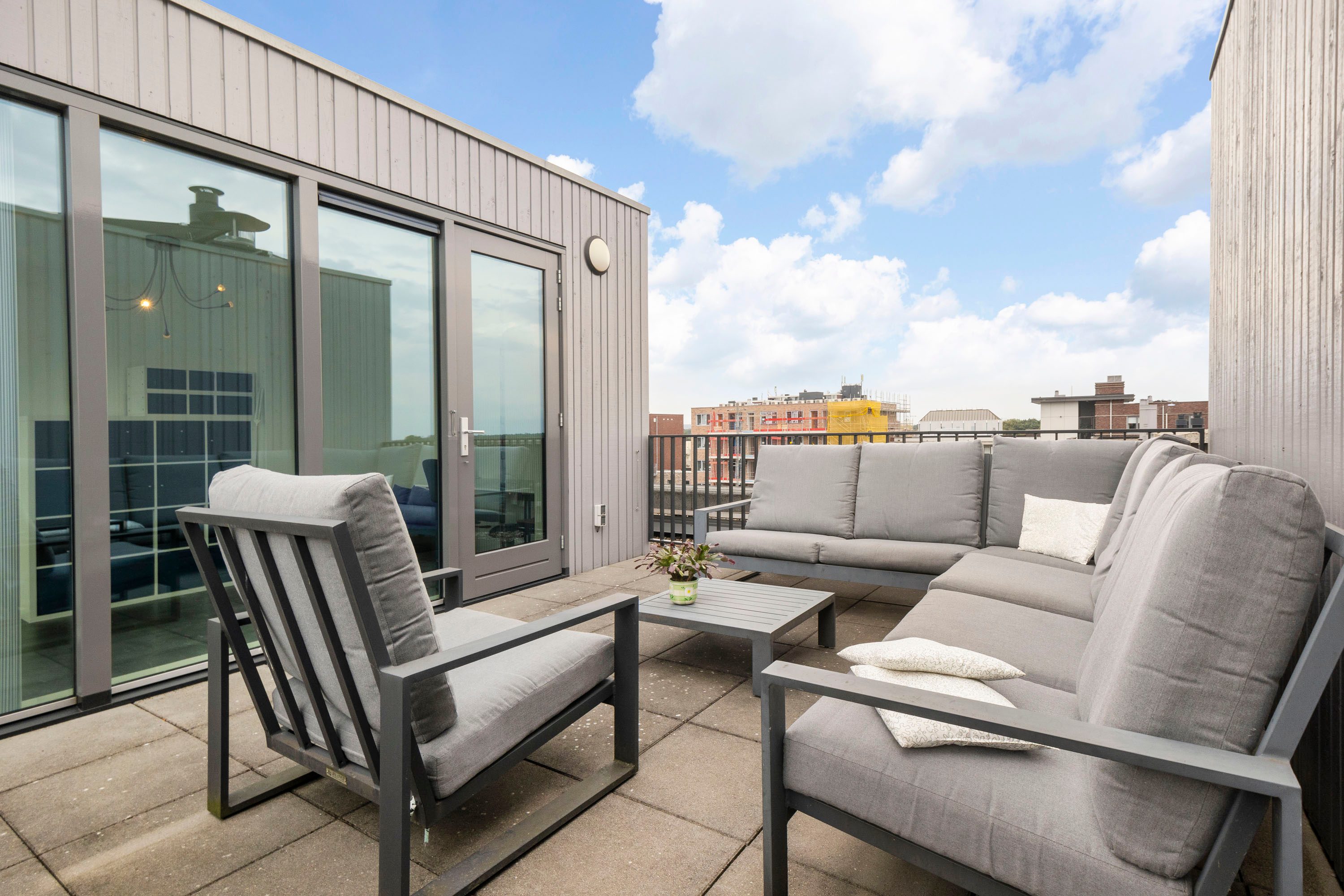 Het dakterras en biedt veel ruimte om buiten te zitten en te genieten van zon en uitzicht.