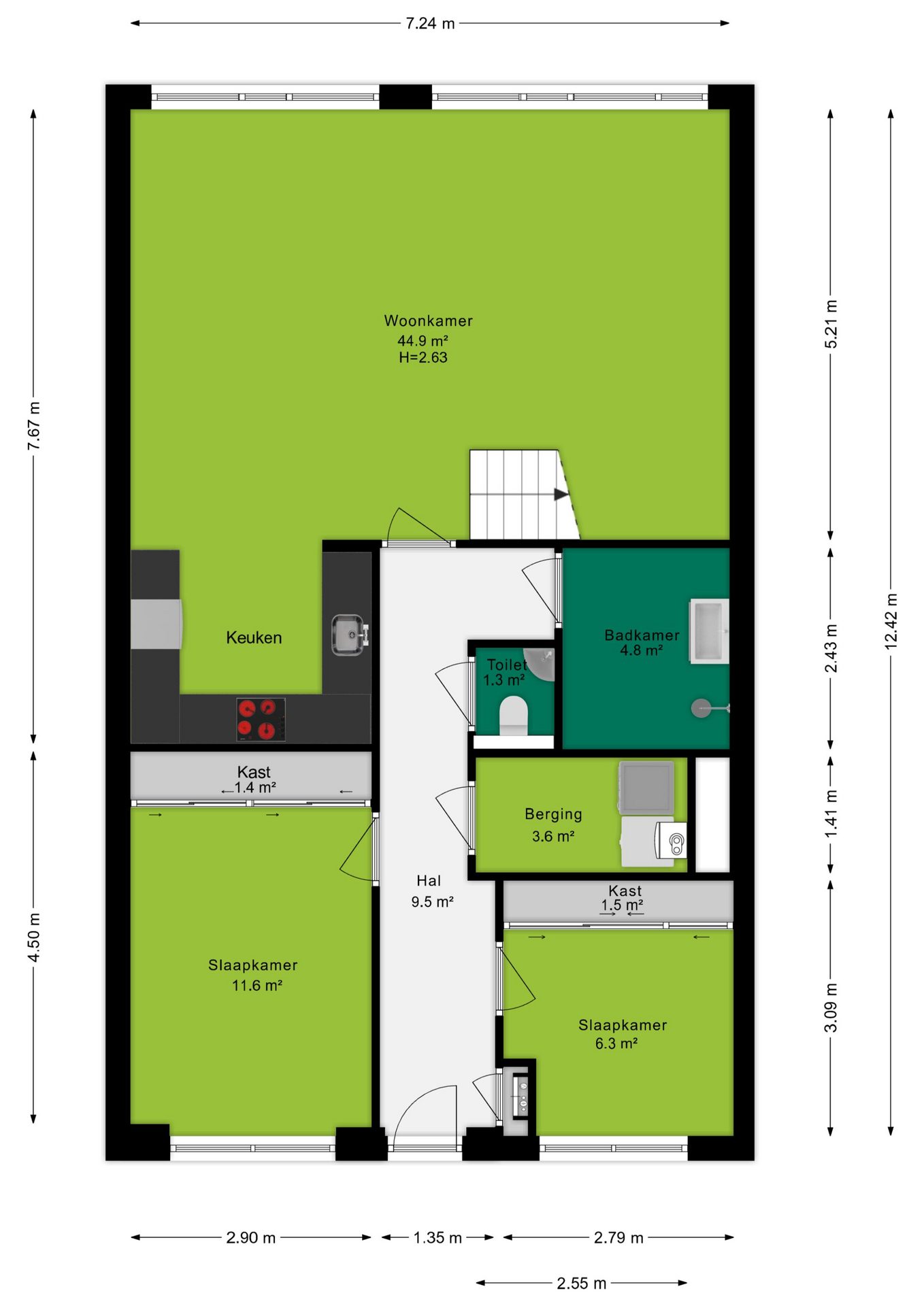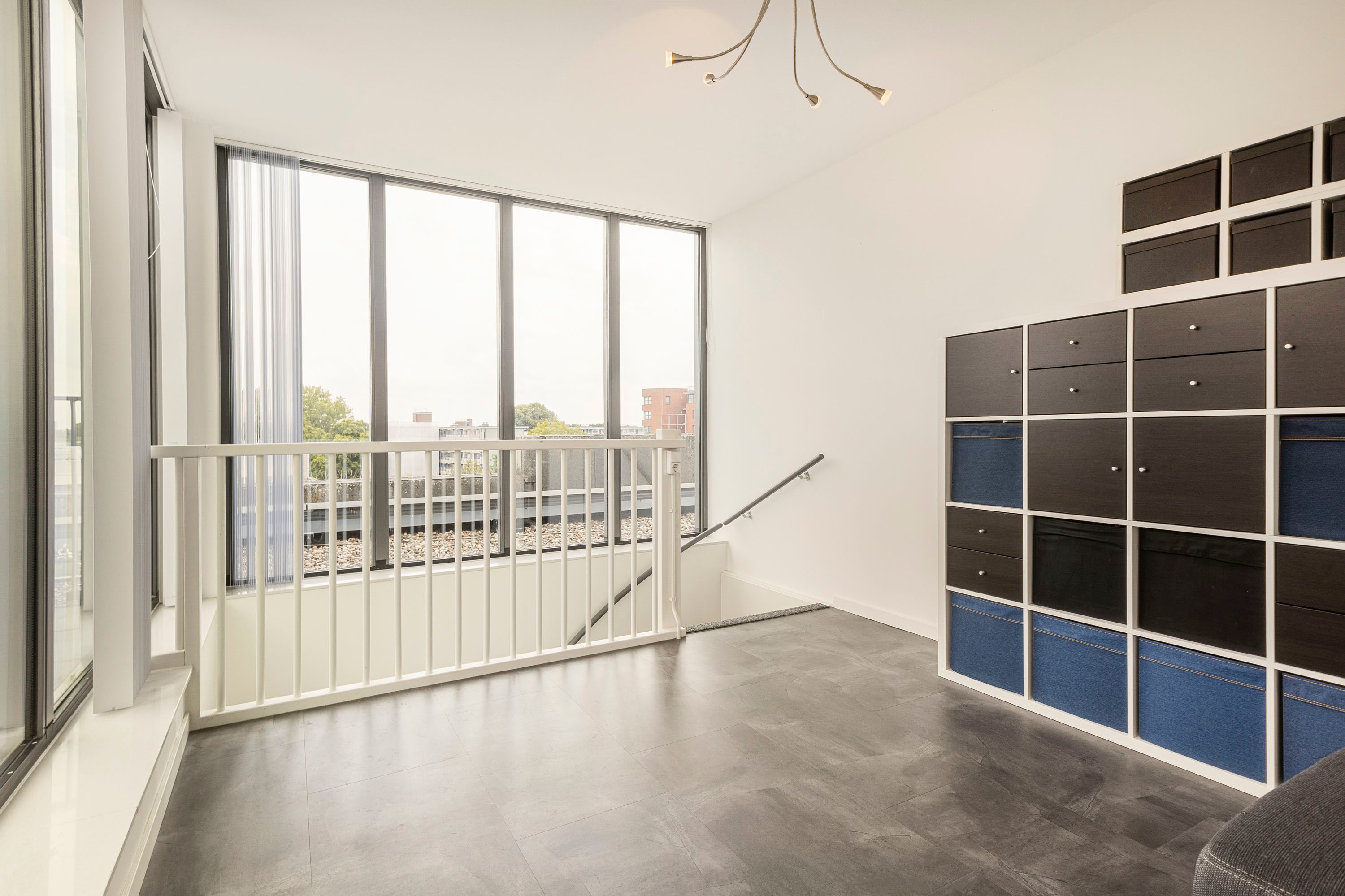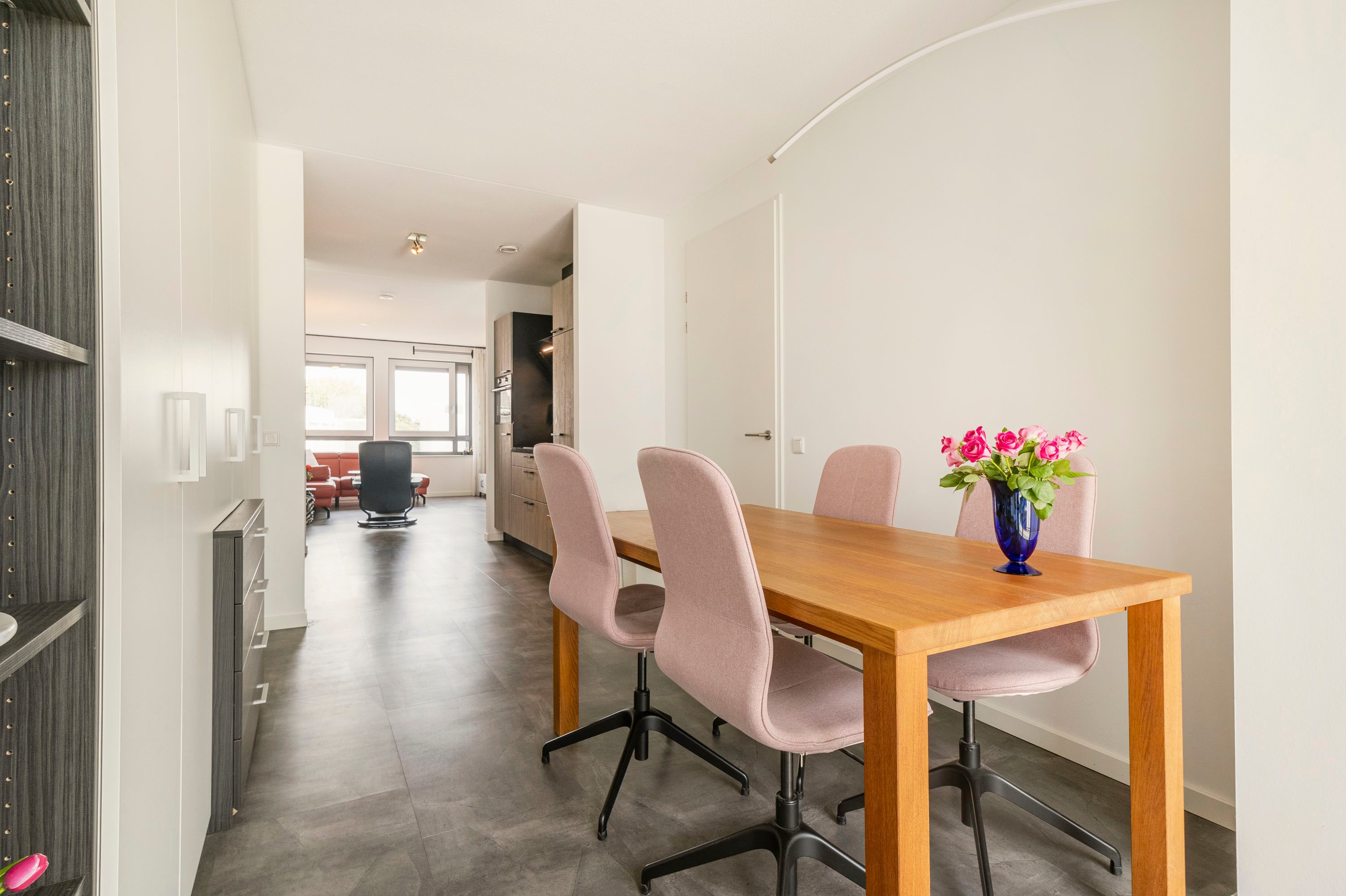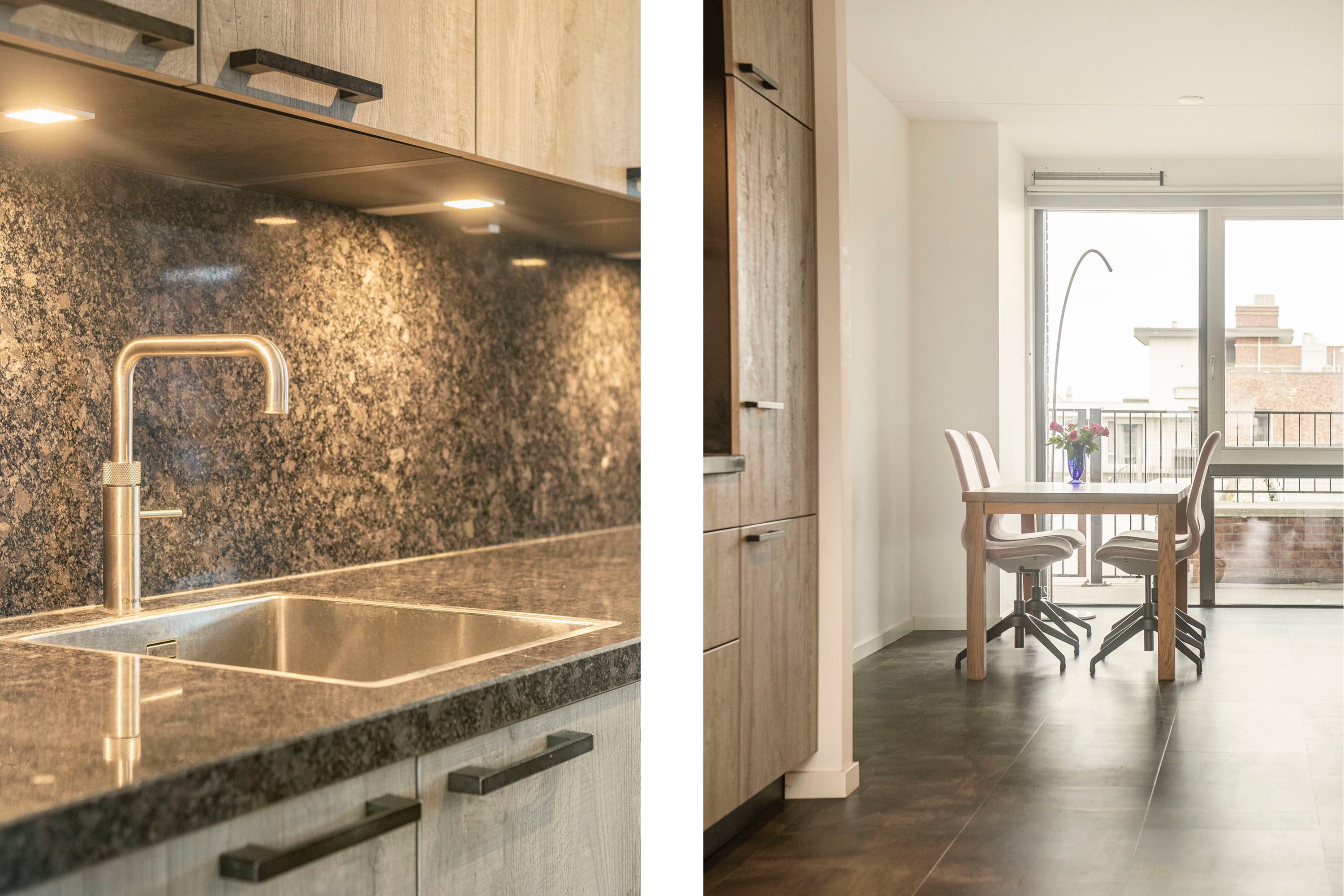 Het appartement is bereikbaar met zowel de lift als de trap. Je komt binnen in de lichte woonkamer waar het daglicht rijkelijk naar binnen valt. (Zie artist impressions om een idee te krijgen hoe de woon- / eetkamer eruit komt te zien, als de slaapkamer naar de galerijkant wordt verplaatst waar nu huidige eetkamer is gepositioneerd). Vanuit hier kijk je langs het gemeentehuis de straat uit. De keuken is centraal in de leefruimte geplaatst, waardoor je tijdens het koken altijd contact hebt met de eetkamer en woonkamer. De keuken is compleet uitgerust met inductiekookplaat, afzuigkap, combi-oven, koelkast, vriezer, vaatwasser, Quooker en veel opbergruimte. In de eetkamer bevindt zich een vaste kastenwand voor extra opslag. (Zie artist impressions voor de mogelijkheden om hier een slaapkamer van te maken).