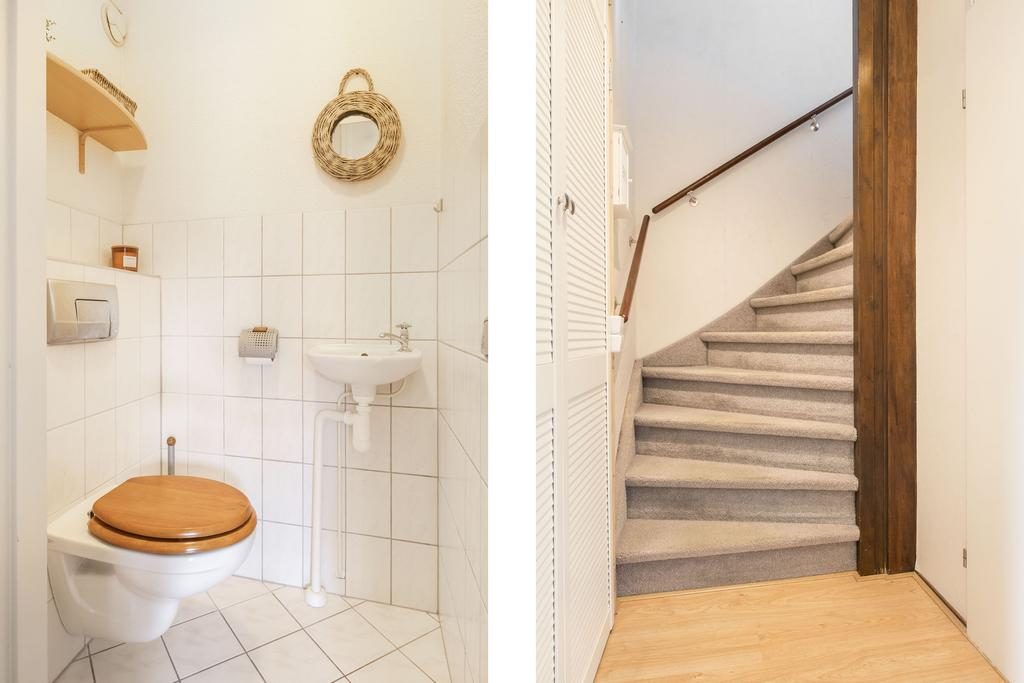 De hal tussen de woonkamer en de keuken geeft toegang tot de toiletruimte en de trap naar de bovenverdieping. Het toilet is deels betegeld in een lichte kleur en voorzien van een hangend toilet en een handwasbakje.