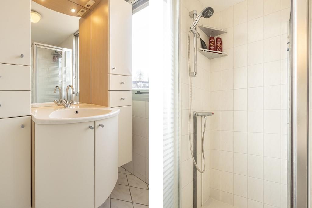 De 1e verdieping is te bereiken via een solide trap, die uitkomt op een ruime overloop. Hier bevinden zich drie slaapkamers en de badkamer. De afmetingen van de slaapkamers zijn respectievelijk 12,1 m², 9,3 m² en 6,6 m². Twee van deze kamers zijn gelegen aan de voorzijde van de woning en hebben uitzicht op de rustige en autoluwe staat. De 3e slaapkamer is samen met de badkamer gelegen aan de achterzijde van de woning en geeft je zicht op de verzorgde achtertuin. De badkamer, met een oppervlakte van circa 4 m², is volledig betegeld met witte tegels en voorzien van een douchecabine, 2e toilet, een wastafelmeubel met enkele wastafel en een te openen raam voor de gewenste natuurlijke ventilatie en daglichttoetreding.