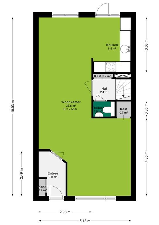 Je betreedt de woning via de fijne voortuin. In de compacte welkomsthal vind je de meterkast en de garderoberuimte. Door een tussendeur betreed je de U-vormige leefruimte. De woonkamer is aan de voorkant van het huis geplaatst en profiteert van natuurlijk licht dankzij een groot voorraam. Vanuit de woonkamer is de trapkast te bereiken.