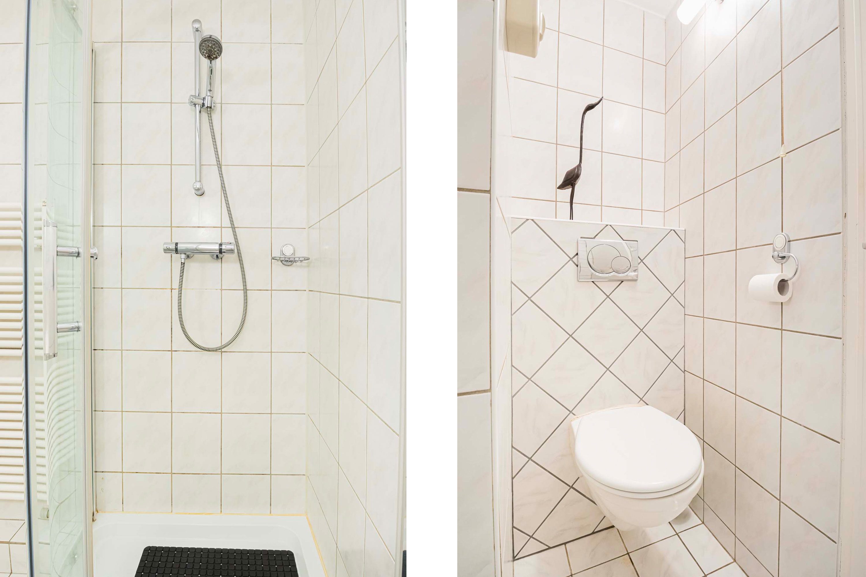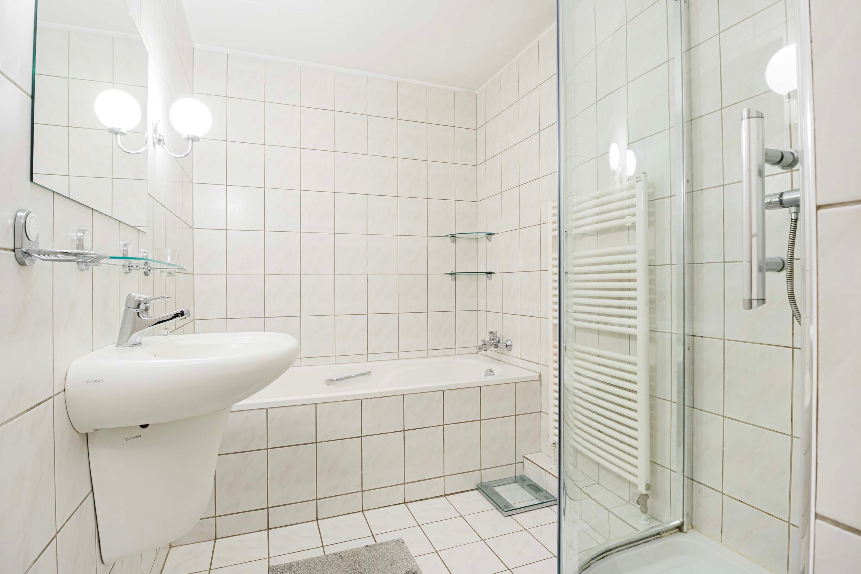 Ook de badkamer is met ruim 6 m² van een prettig formaat. Qua kleurstelling is de badkamer met witte vloer- en wandtegels zeer neutraal uitgevoerd. Met een ligbad, douchecabine, wastafel en 2e toilet beschik je over uitgebreid sanitair.