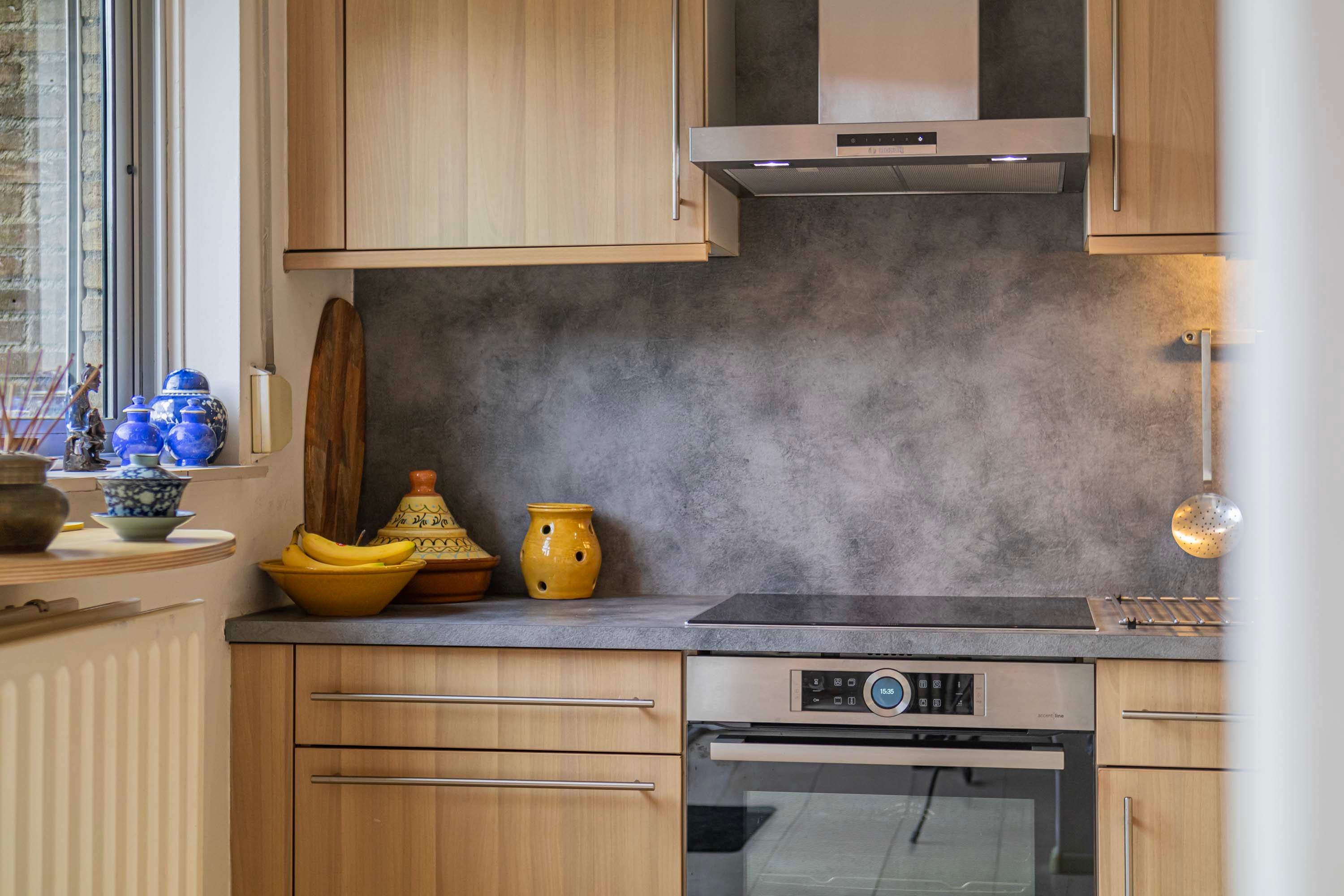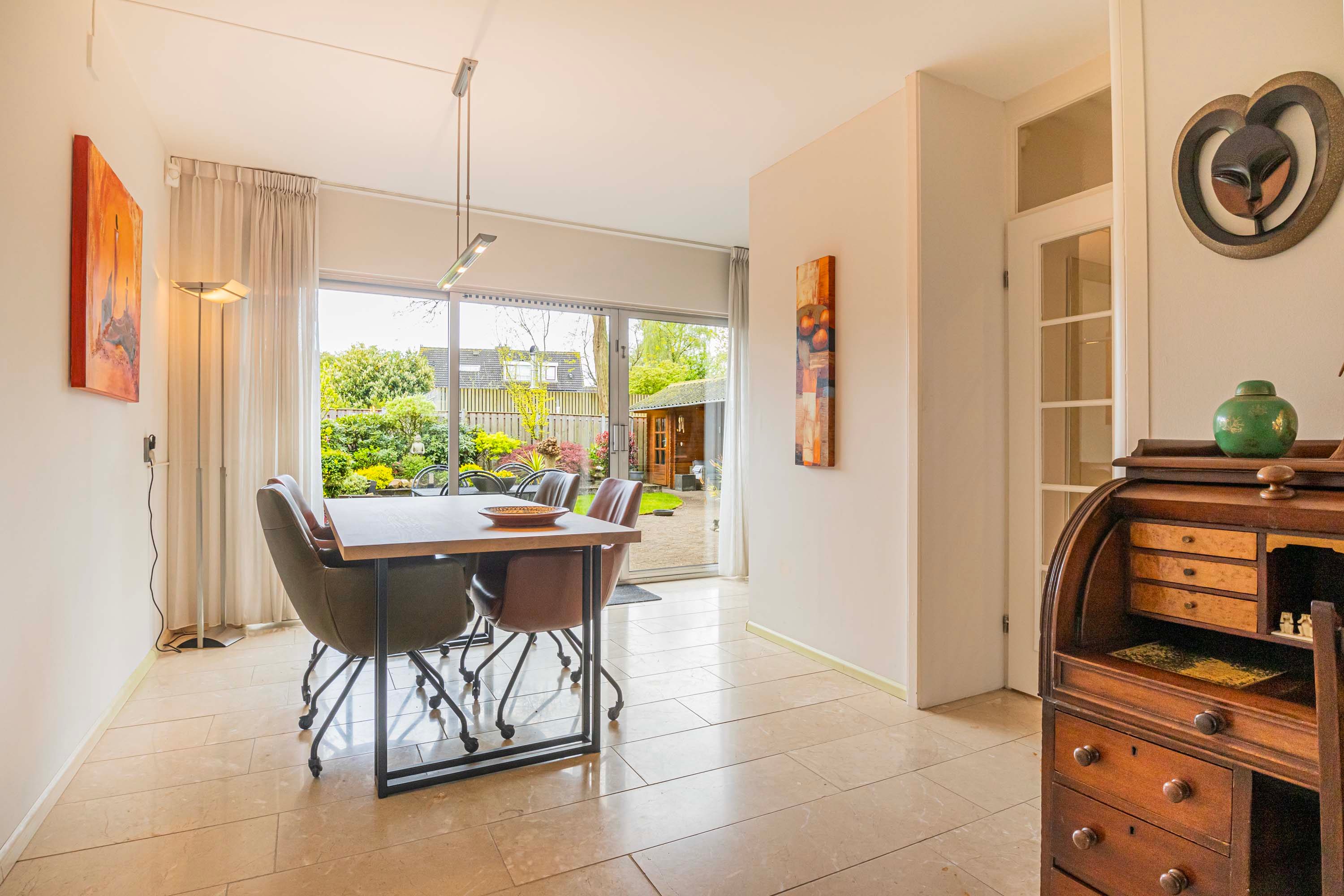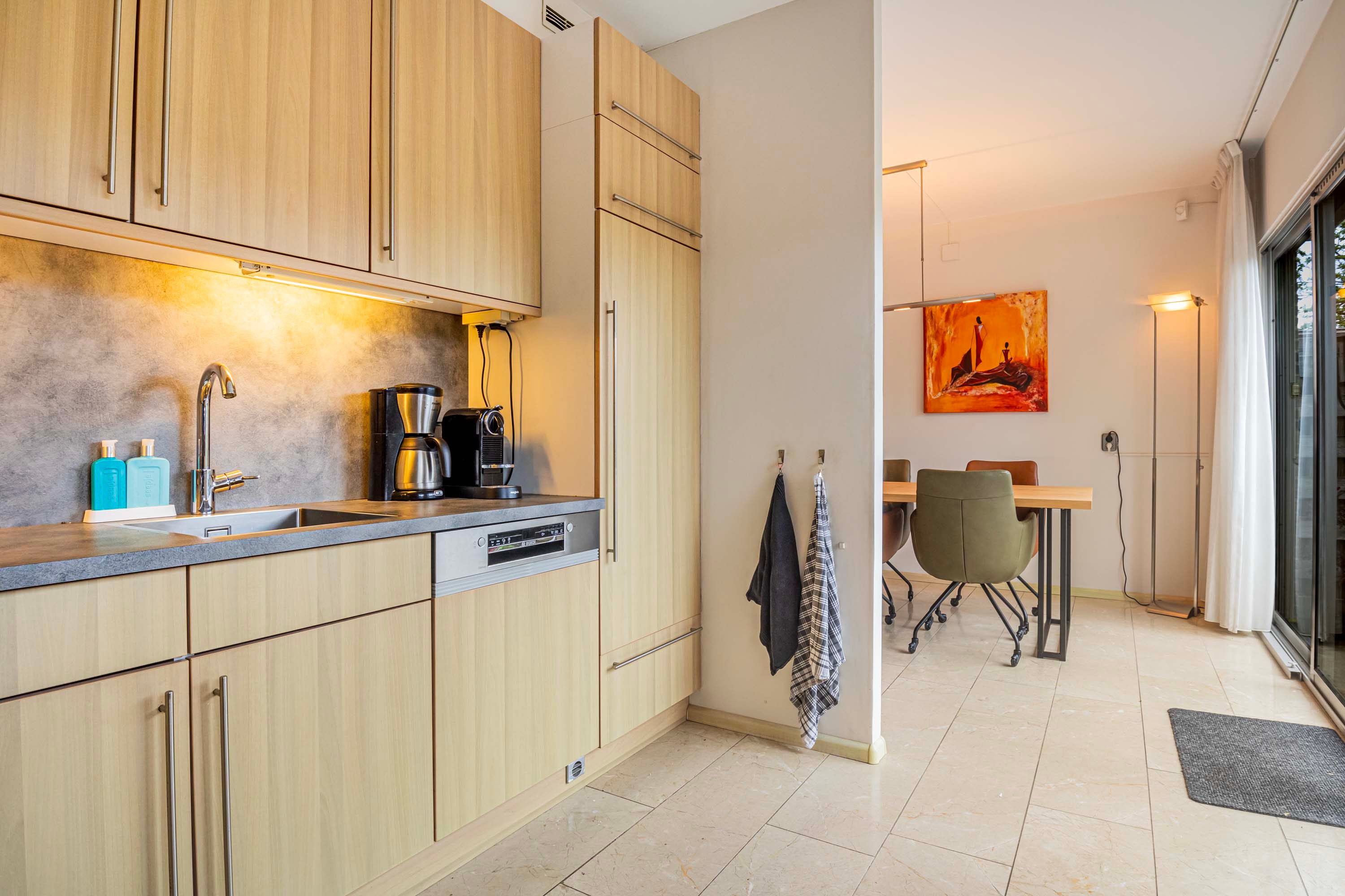 De half open keuken (2019) is samen met het eetgedeelte gelegen aan de achterzijde van de woning. Via een schuifpui is de ruime en zonnige achtertuin te bereiken. De half open keuken in een L-opstelling is uitgevoerd met het benodigde inbouwapparatuur zoals een combi-oven, inductiekookplaat met afzuigkap close-in boiler, vaatwasser (2022) en koelkast (2022). De huidige eigenaren hebben in de garage een separate vriezer neer gezet.