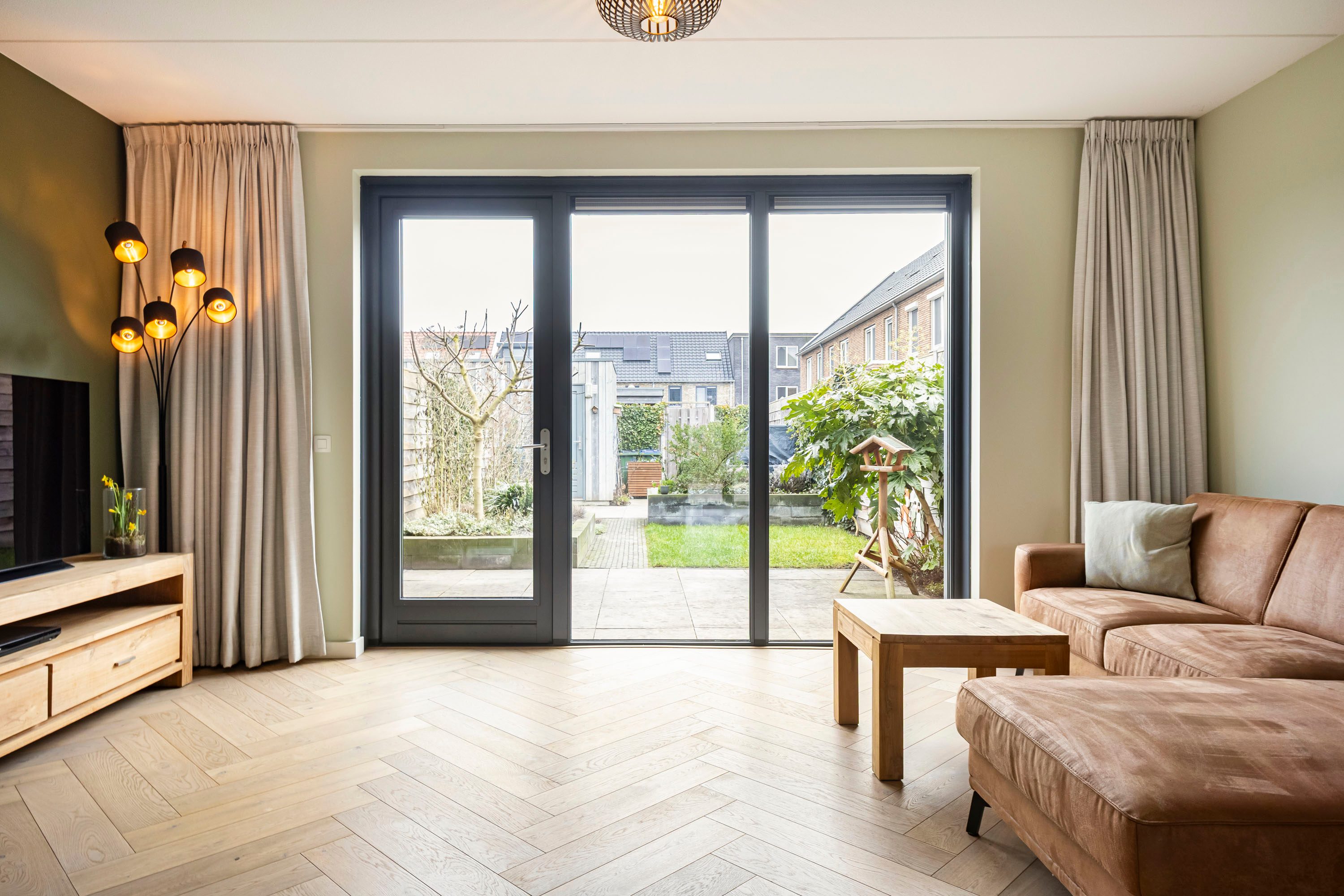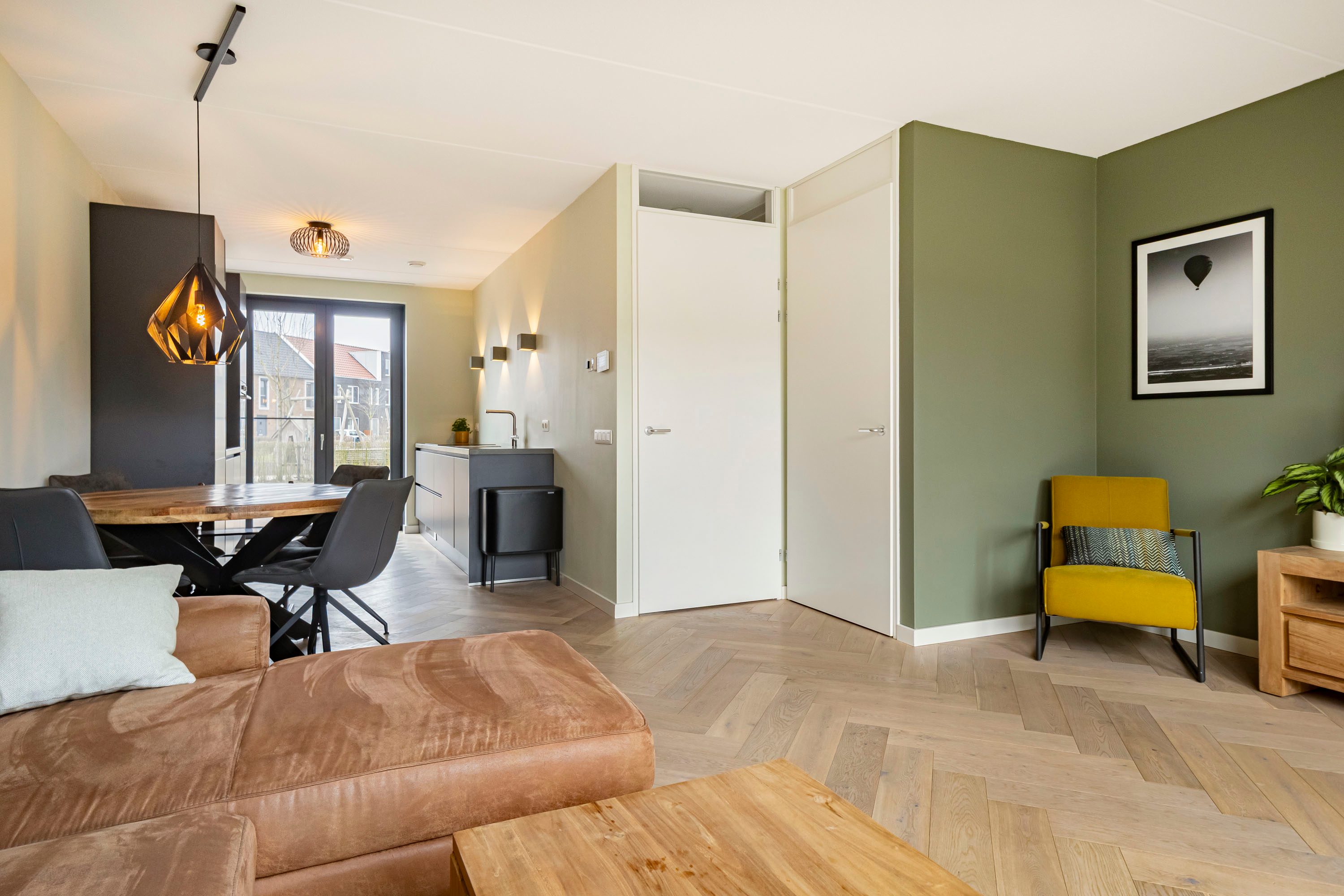 Via de ruime entree met meterkast, toilet en trapopgang kom je in de lichte woonkamer van 21,5 m². De grote glazen raampartijen zorgen voor een prettige en natuurlijke lichtinval. De woonkamer biedt voldoende ruimte voor een comfortabele hoekbank en een gezellige zithoek. Centraal is het eetgedeelte gesitueerd, dat in open verbinding staat met de keuken.