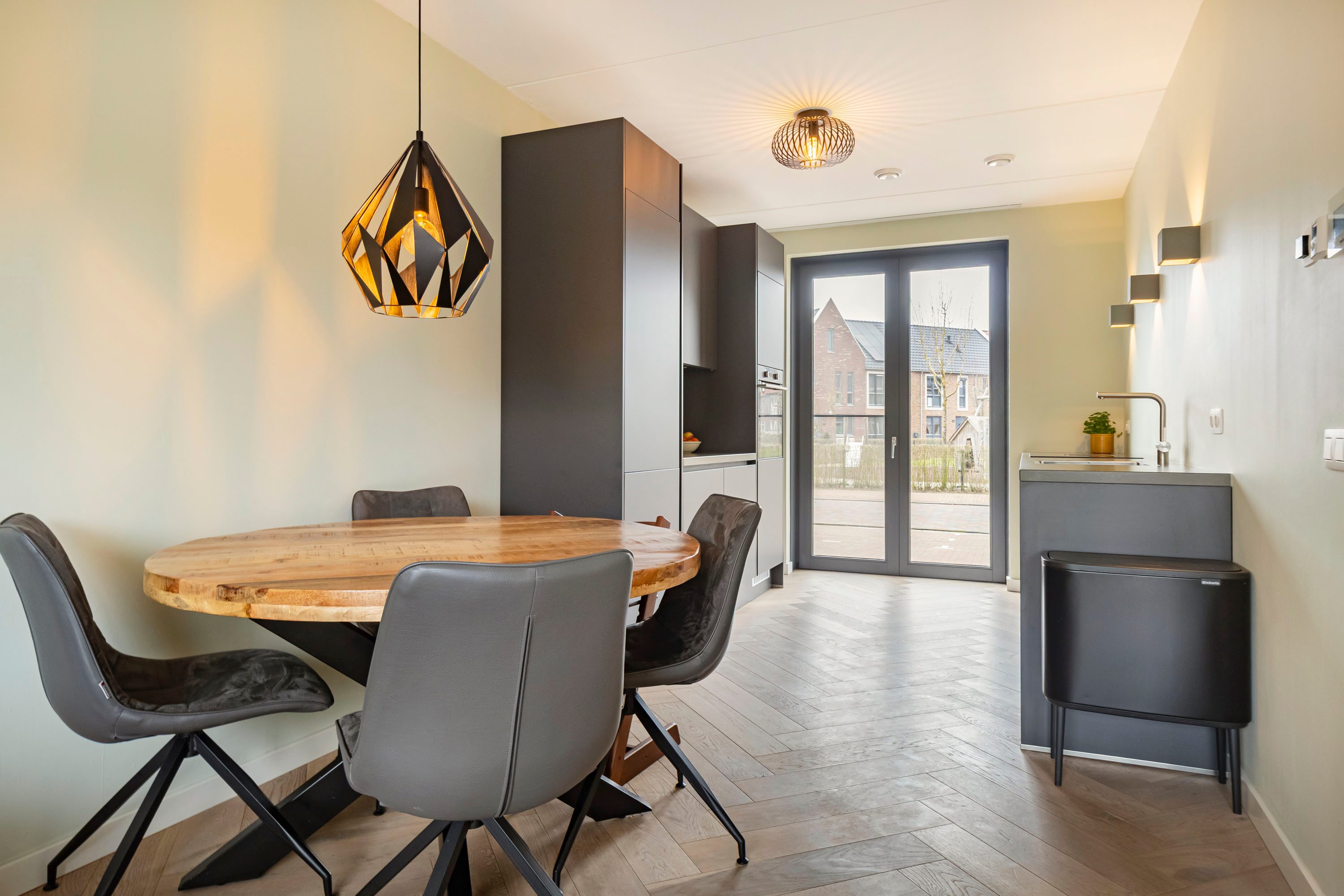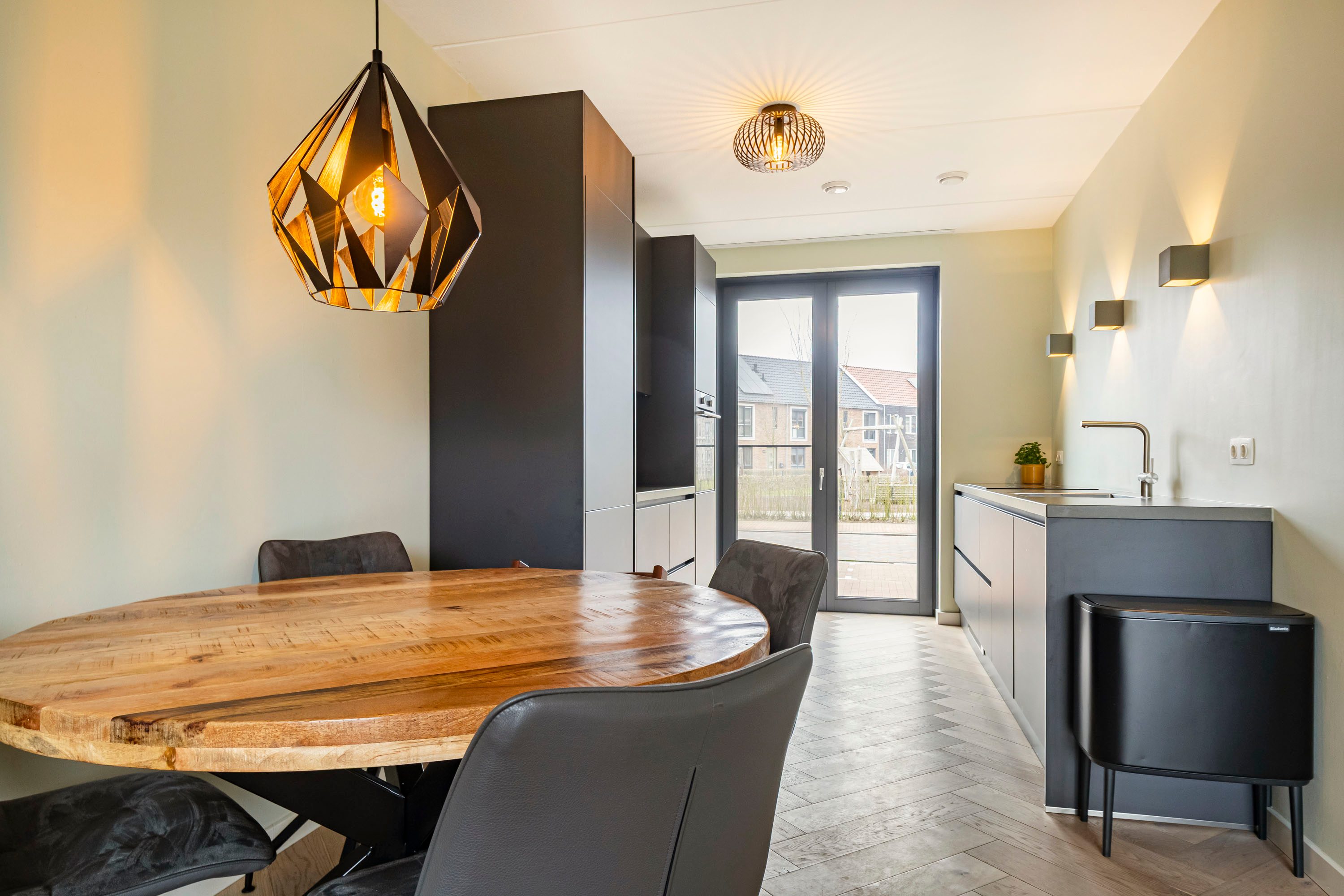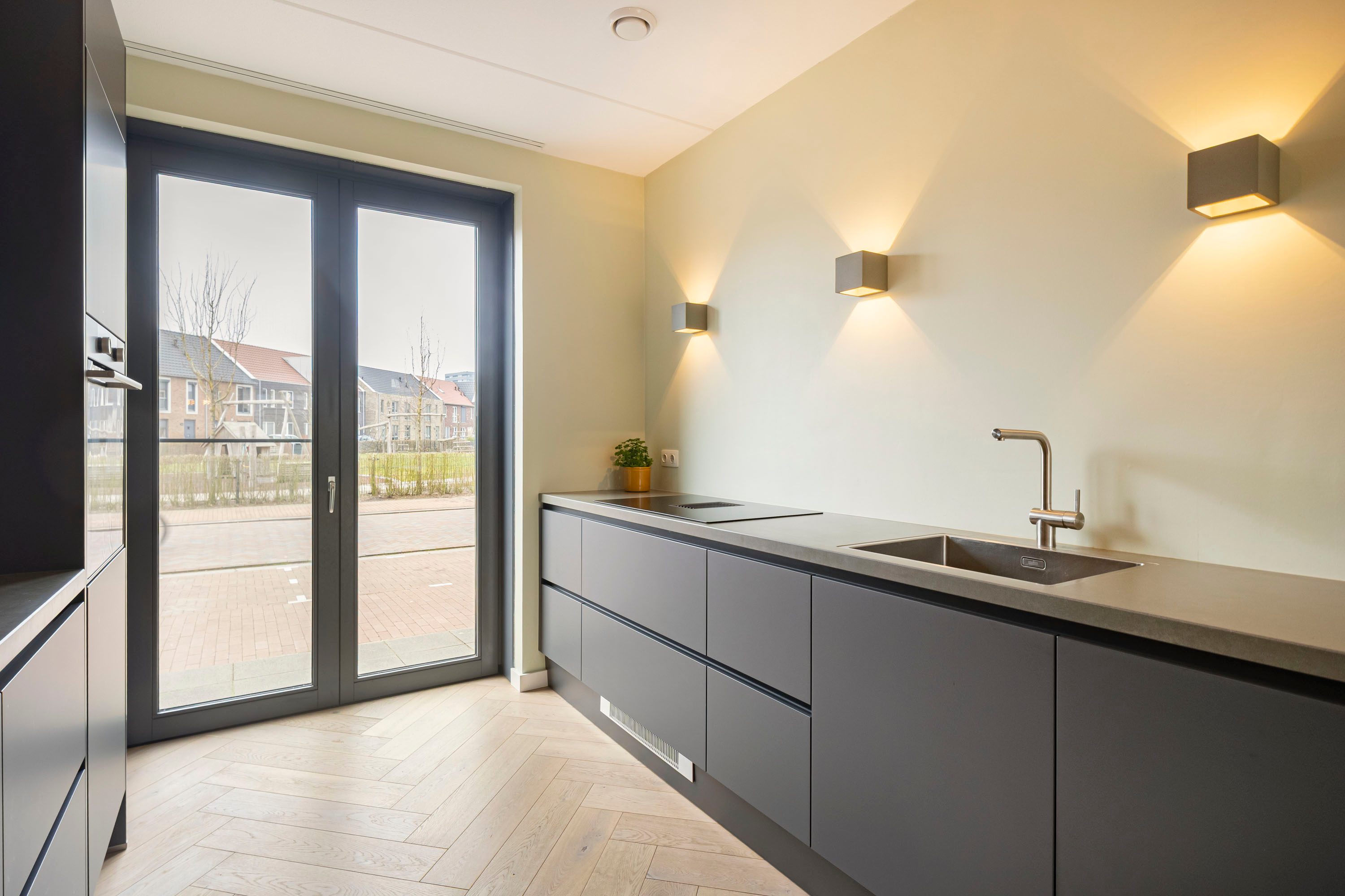 De open keuken van 12 m² is uitgevoerd in stijlvol antraciet en voorzien van diverse inbouwapparatuur zoals: een kookplaat met geïntegreerde afzuiging, een oven, een koel-vriescombinatie en een vaatwasser. De openslaande deuren aan de voorzijde zorgen voor extra daglicht en een directe verbinding met de tuin.