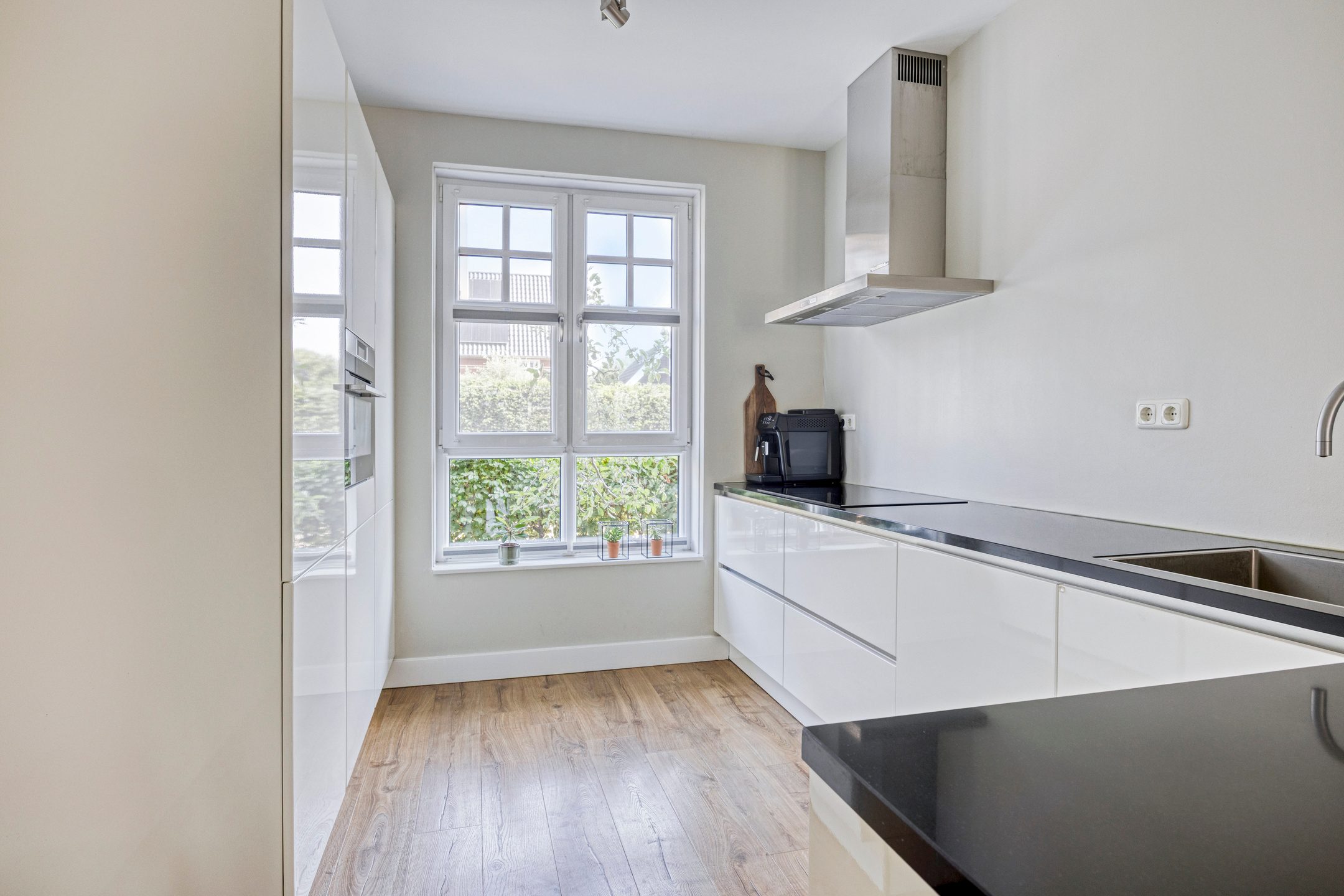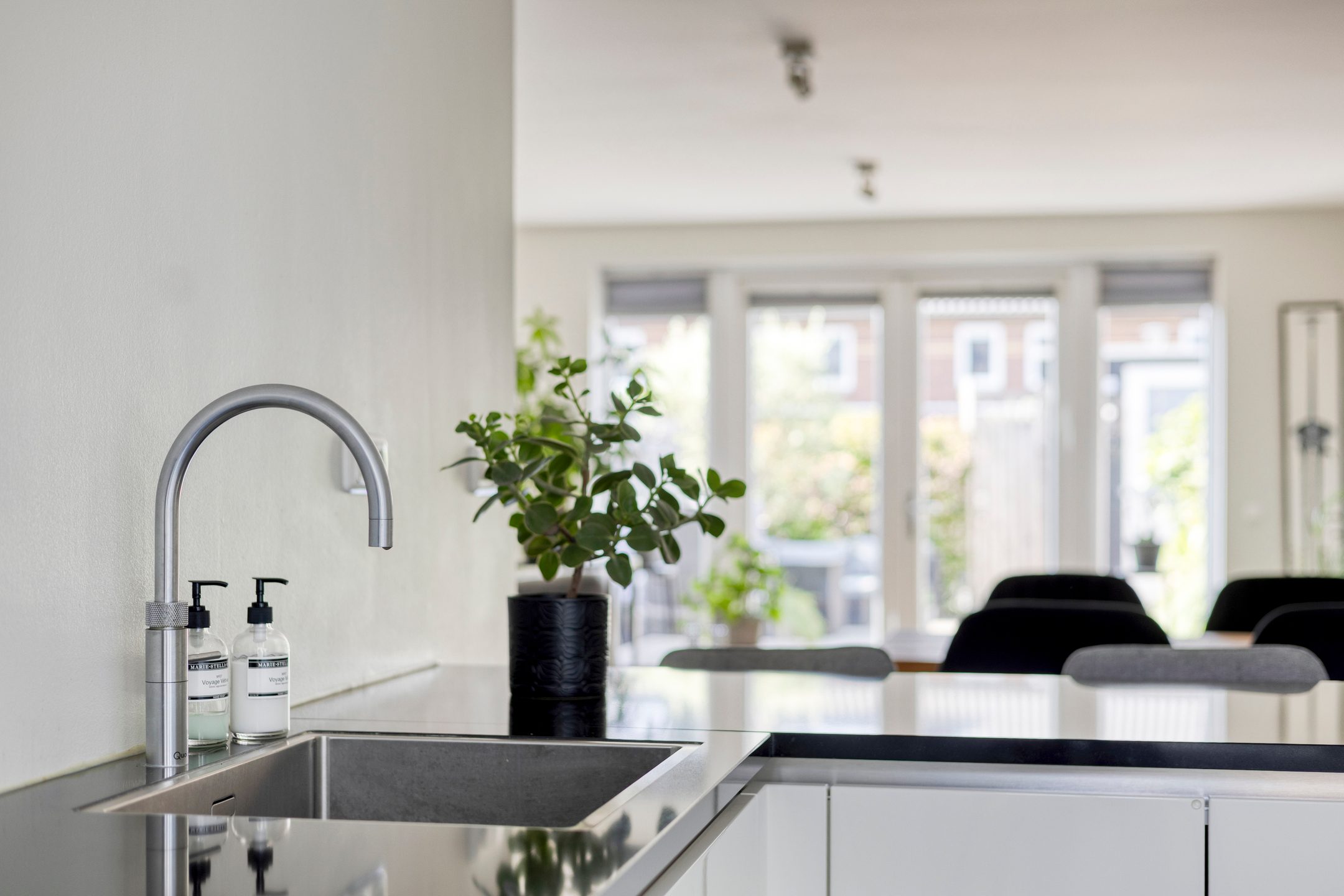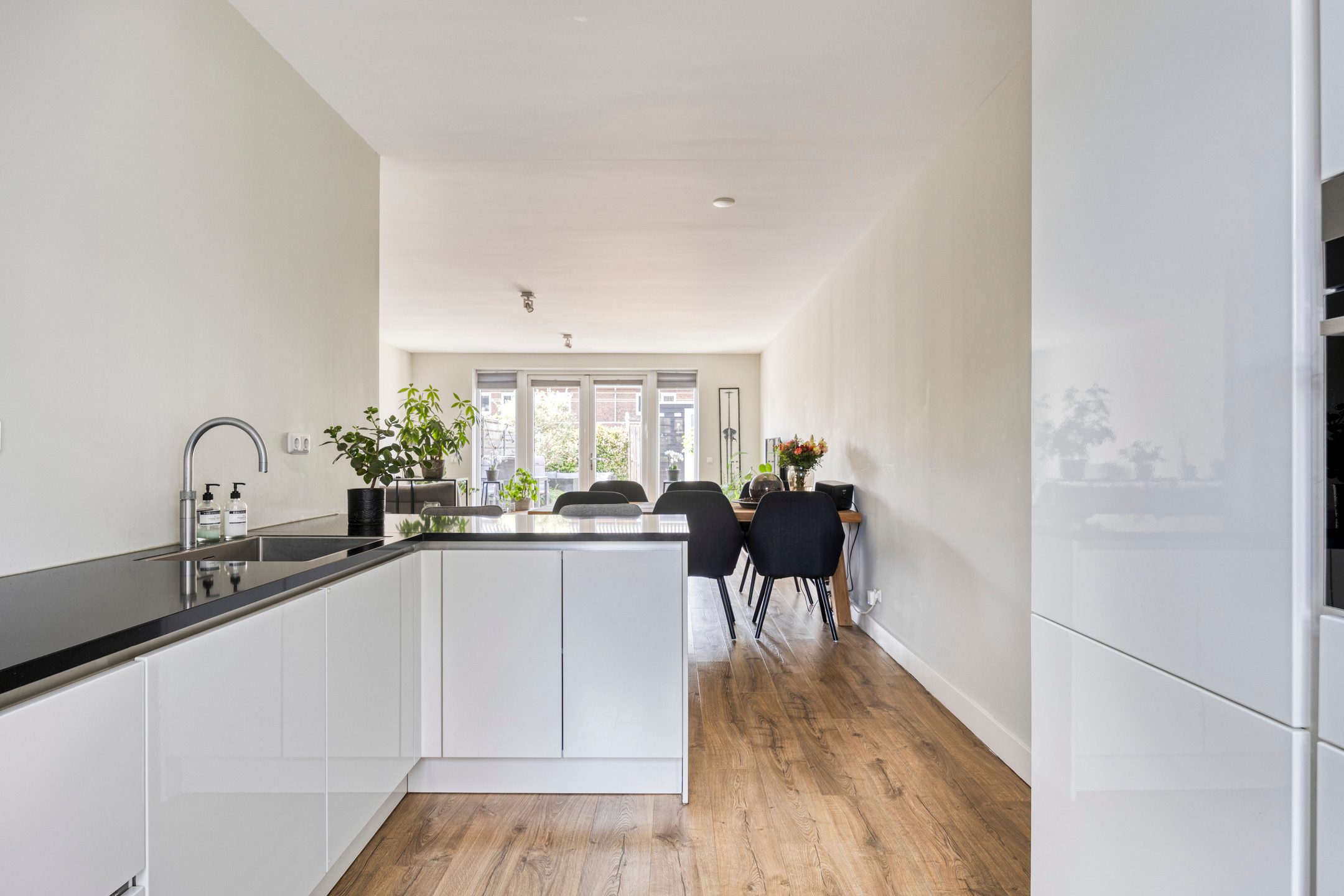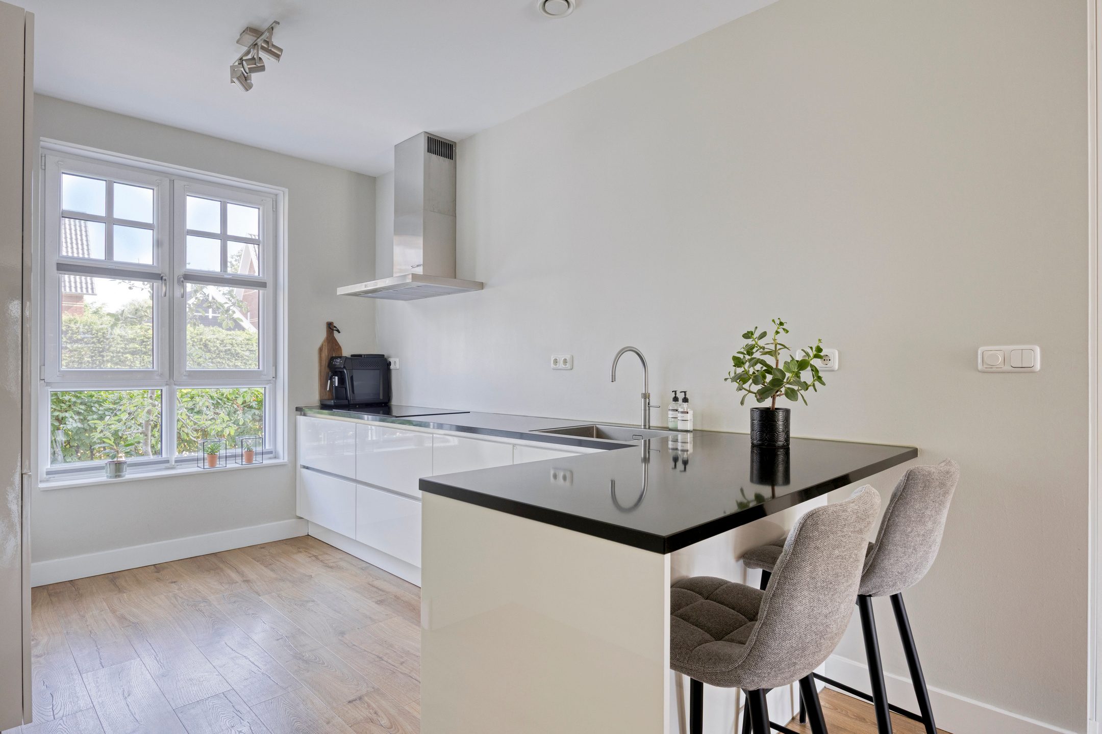 Je betreedt de woning via de ruime entree, waar zich de meterkast, het toilet en de trapopgang naar de eerste verdieping bevinden. Vanuit de entree kom je in de ruime en lichte woonkamer. Dankzij de grote tuindeuren valt er prettig veel daglicht binnen, en de royale indeling biedt je volop mogelijkheden om de ruimte helemaal naar eigen smaak in te richten. Ook heb je een heerlijk uitzicht op de fijne achtertuin. Het eetgedeelte, dat zich tussen de woonkamer en de keuken bevindt, biedt voldoende plaats voor een grote eettafel. De moderne, L-vormige keuken is stijlvol uitgevoerd met hoogglans witte kastjes en een zwart werkblad, wat zorgt voor een strakke en tijdloze uitstraling. De keuken is voorzien van moderne inbouwapparatuur zoals: inductie kookplaat, vaatwasser, koelkast en vriezer.