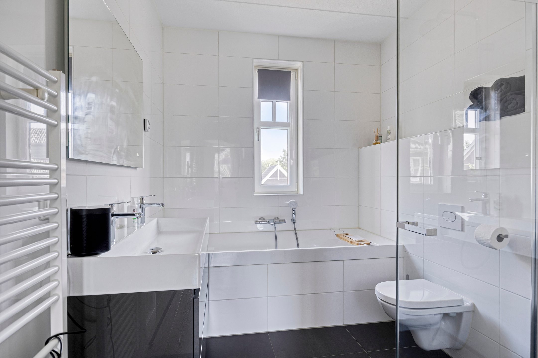 Via de vaste trap kom je bij de eerste verdieping. Vanaf de overloop heb je toegang tot drie goed bemeten slaapkamers met oppervlakten van 12m², 12m² en 7m². Elke slaapkamer beschikt over een raampartij, waardoor de ruimtes mooi verlicht zijn met natuurlijk licht. Ook de badkamer is heerlijk licht dankzij het aanwezige raam. Deze is uitgerust met een ruim wastafelmeubel, een toilet, een ligbad en een aparte douche. De badkamer heeft een frisse uitstraling door de witte wandtegels.
